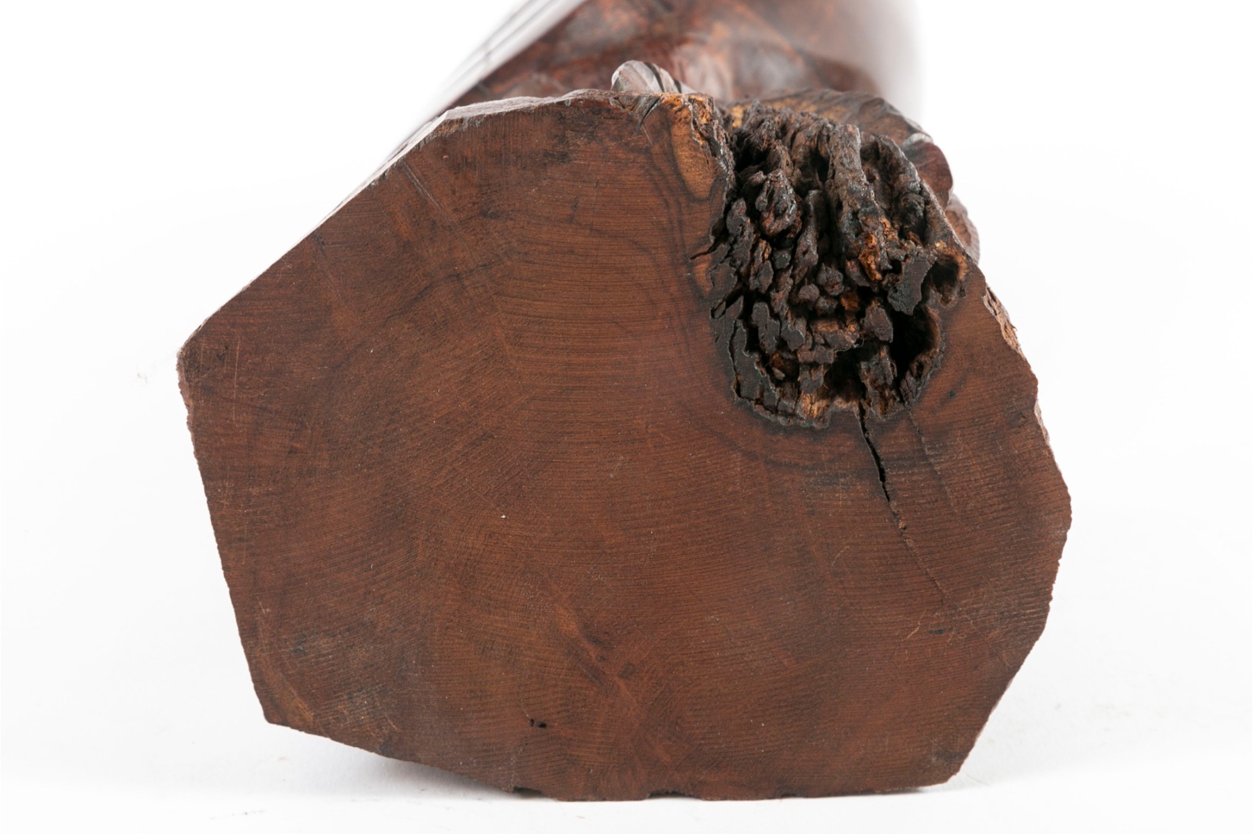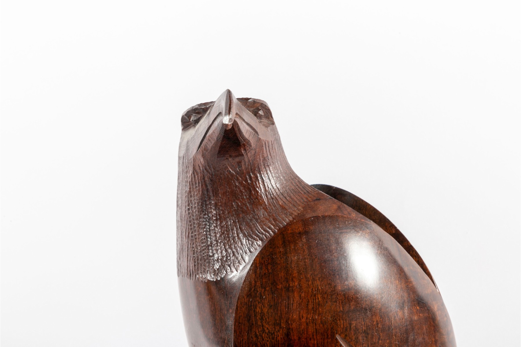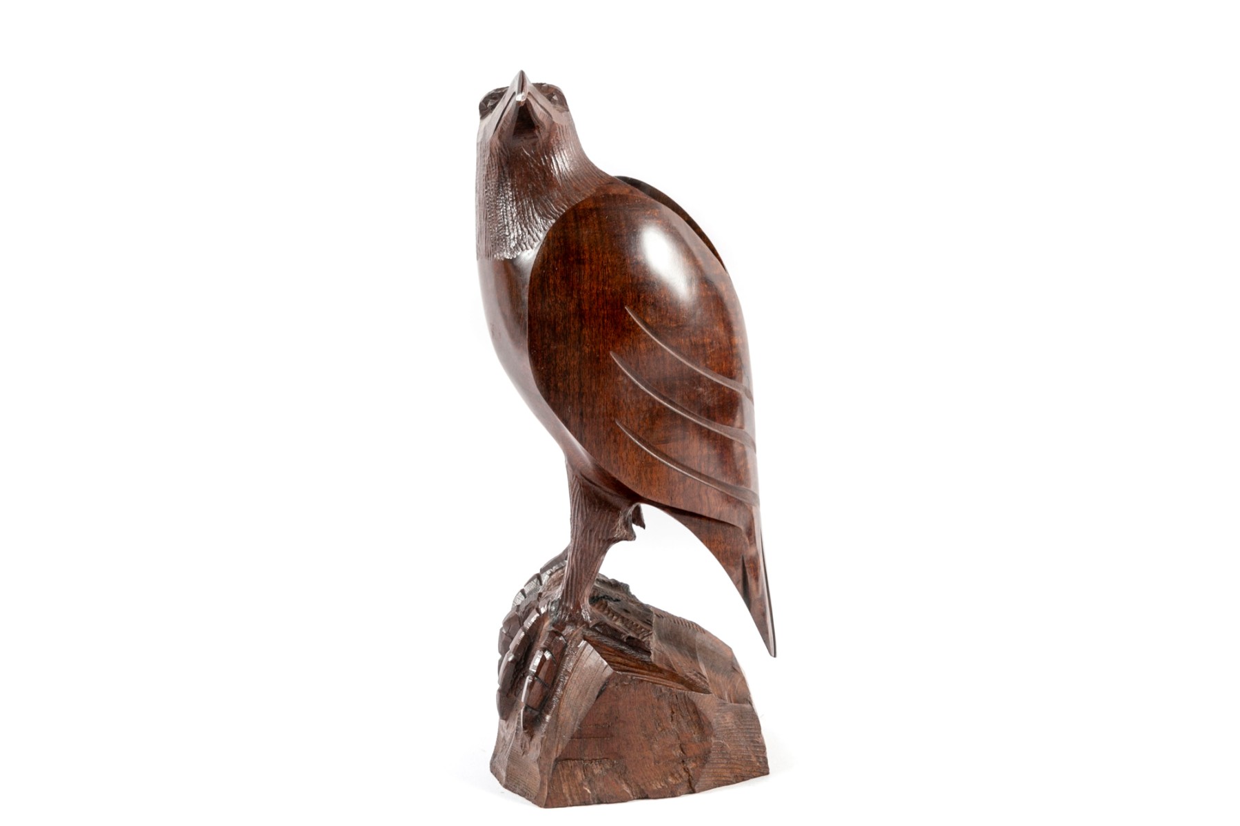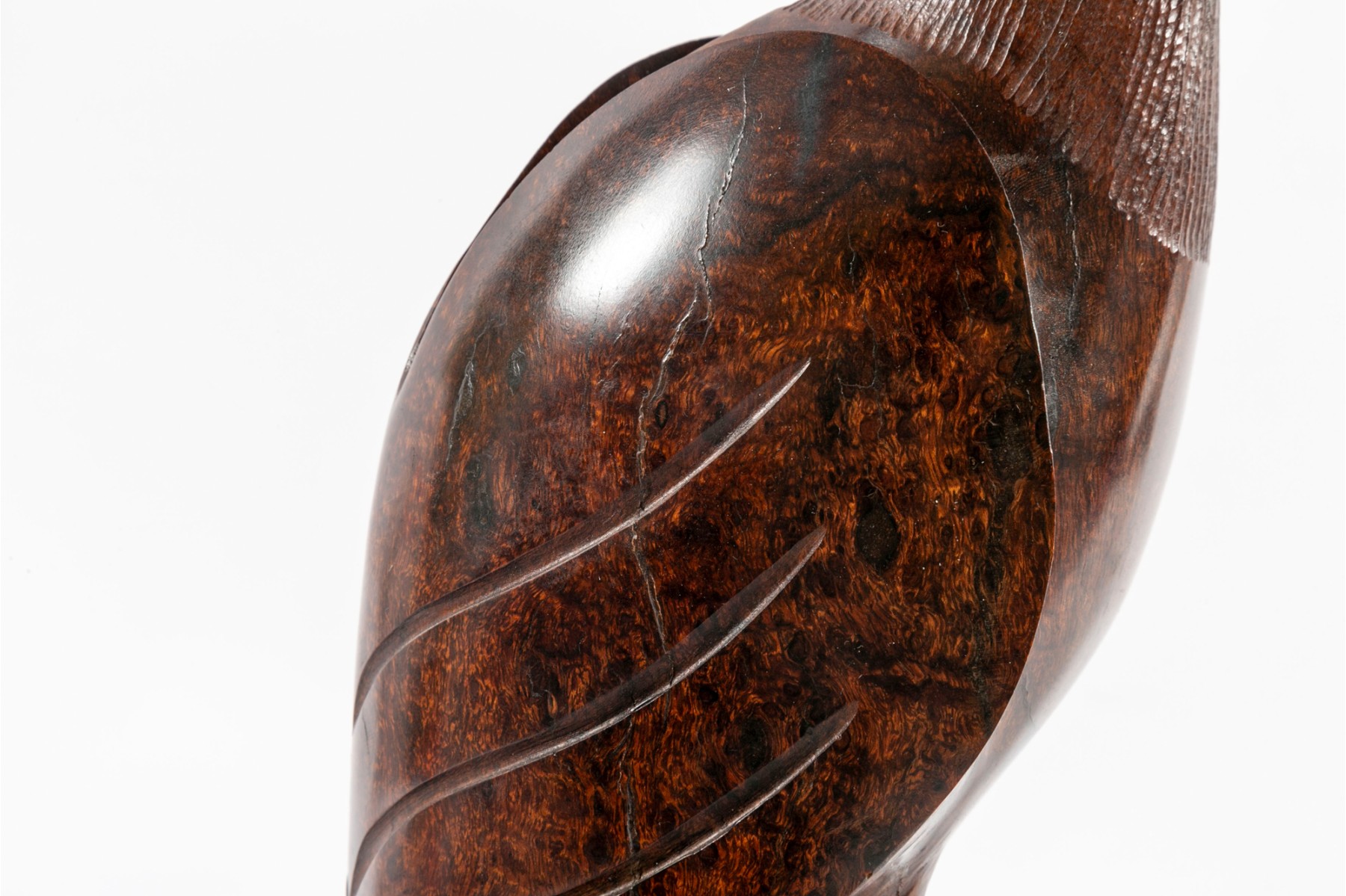A beautiful perched eagle sculpture crafted from a single block of ironwood set in a gloss finish — unsigned and emboldened by detailed textures and facial features.