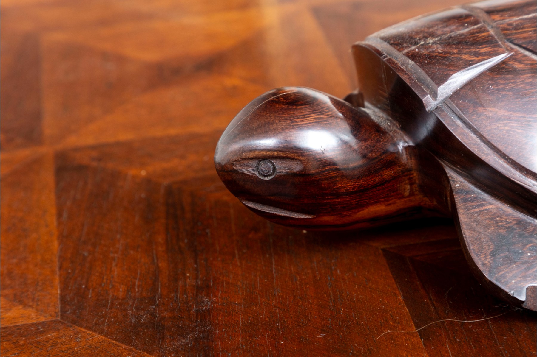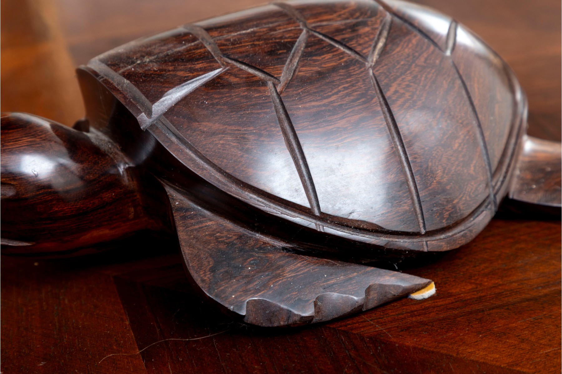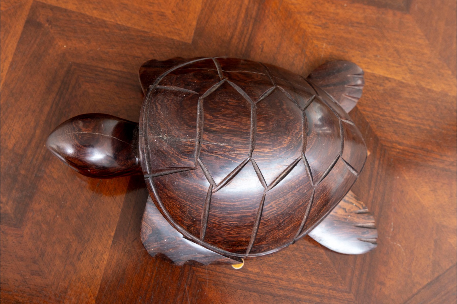 A hand carved, heavy and dense mesquite turtle crafted from ironwood, complete with detailed fins, eyes, and shell pattern.