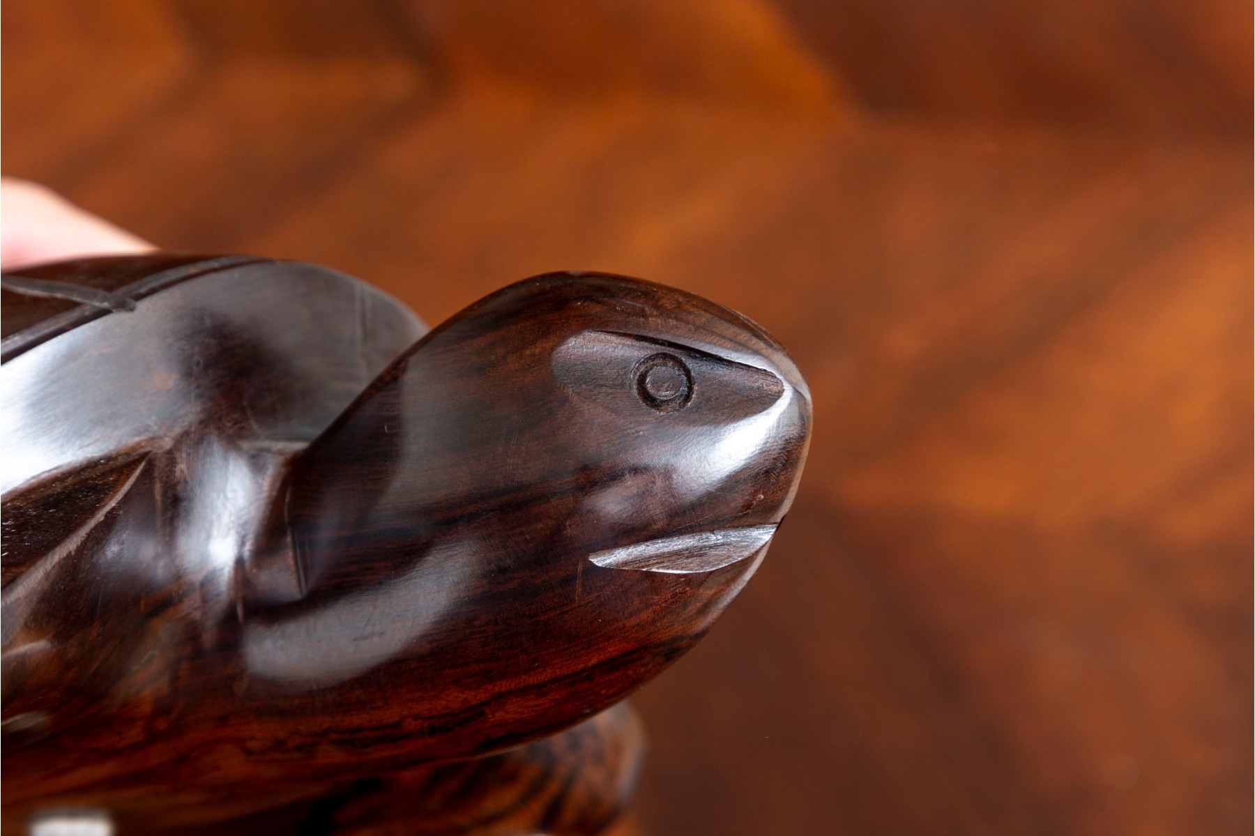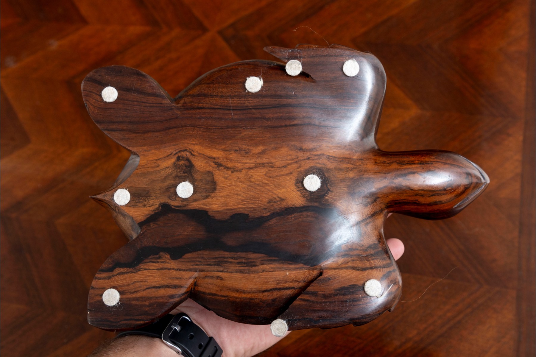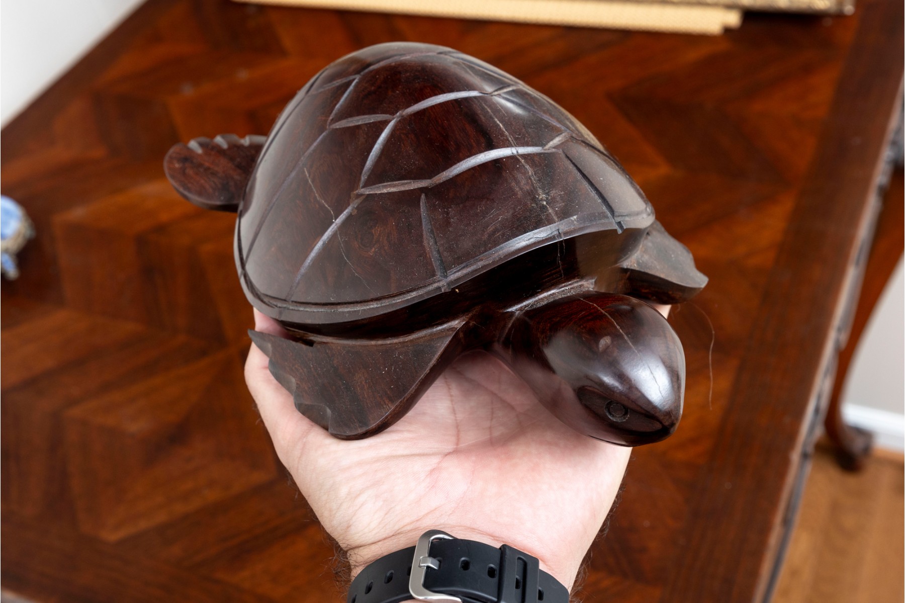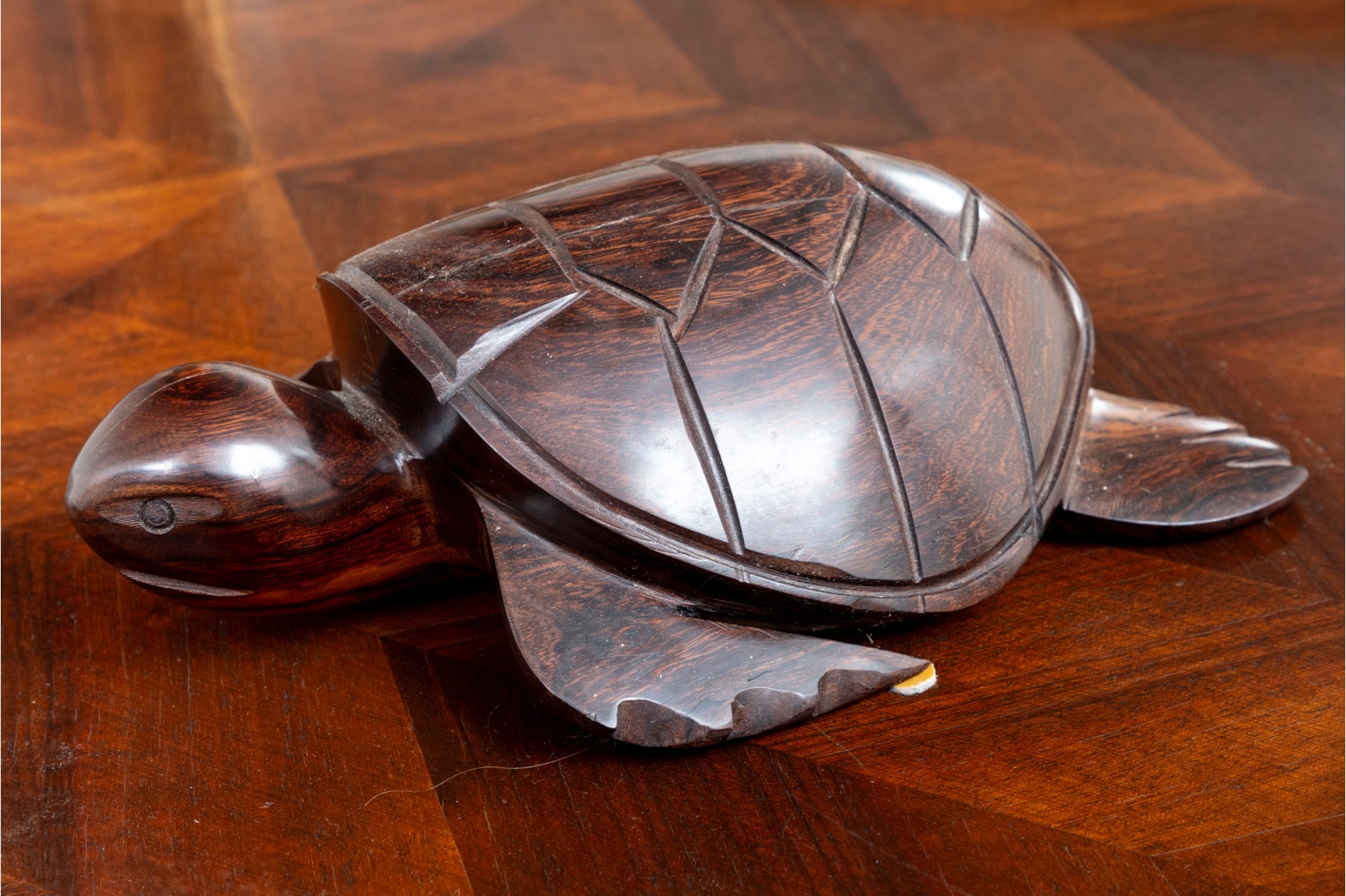 A hand carved, heavy and dense mesquite turtle crafted from ironwood, complete with detailed fins, eyes, and shell pattern.