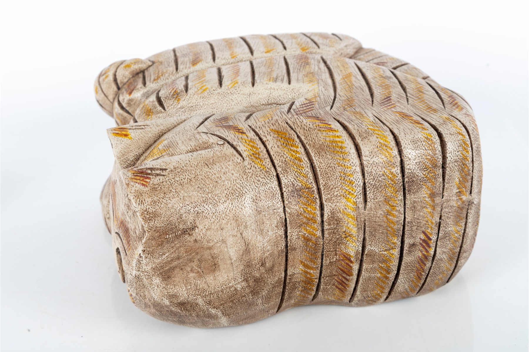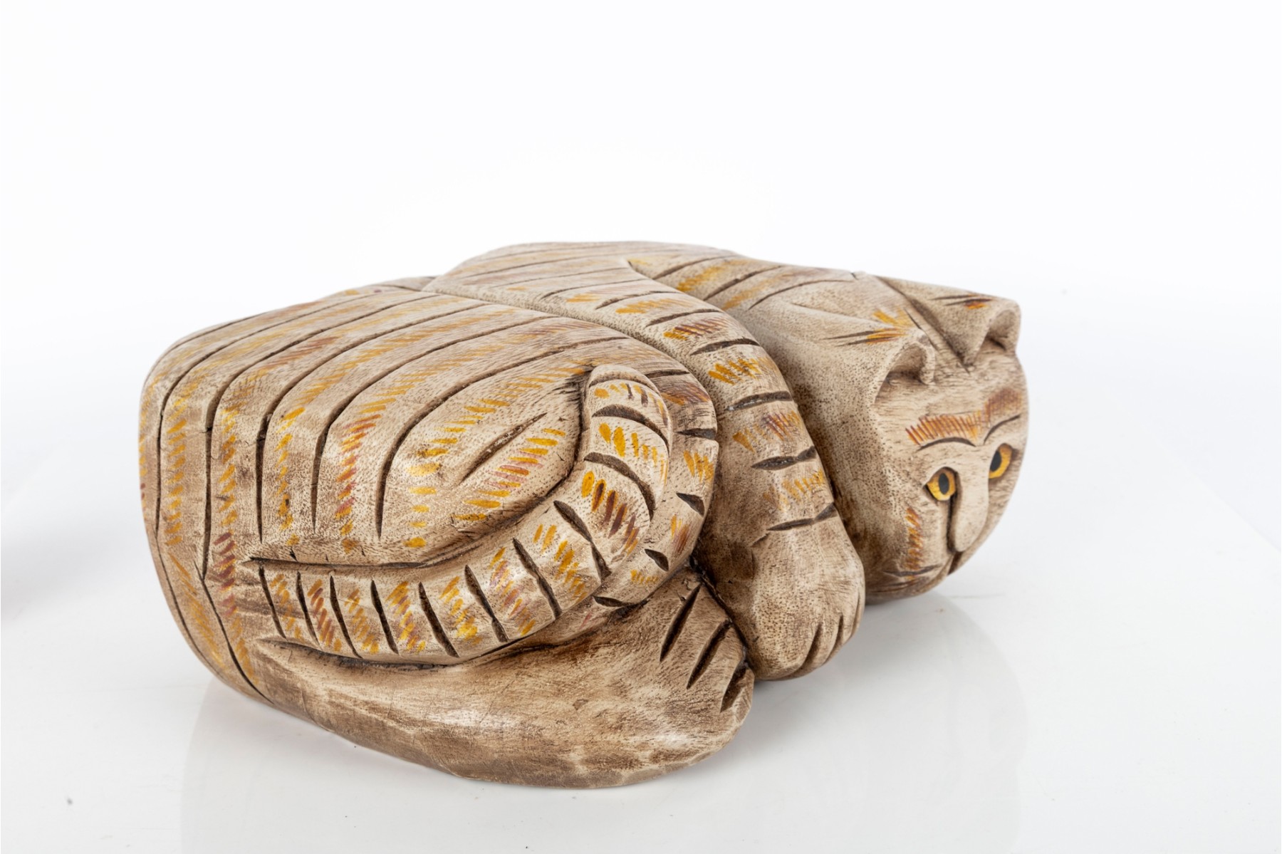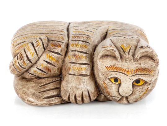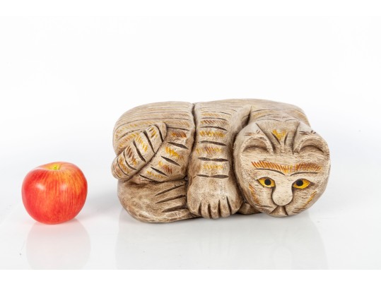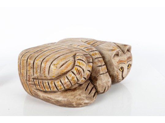 An unusual hand-carved and painted piece depicting a leisurely cat, cut and crafted from a single block of wood. Perfect for decorative use.