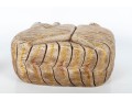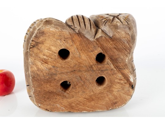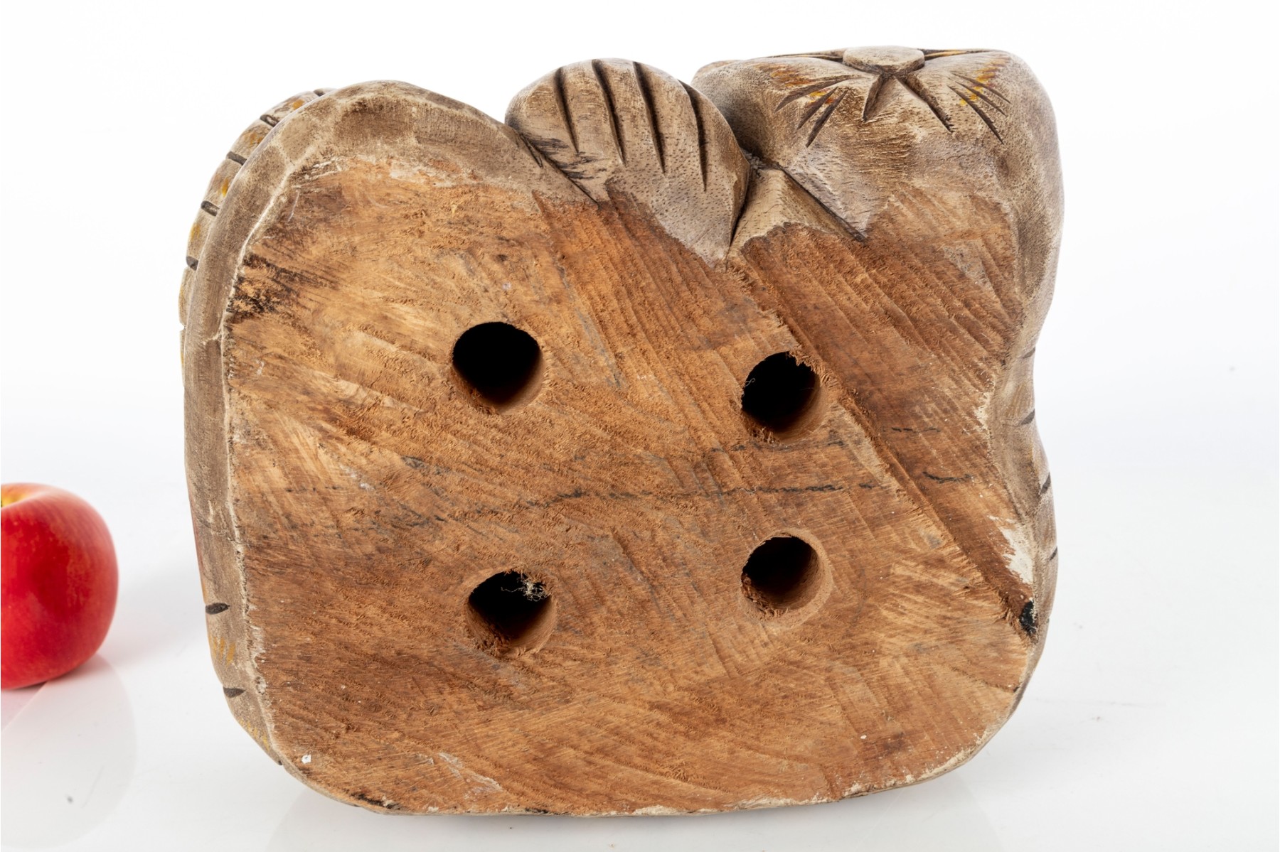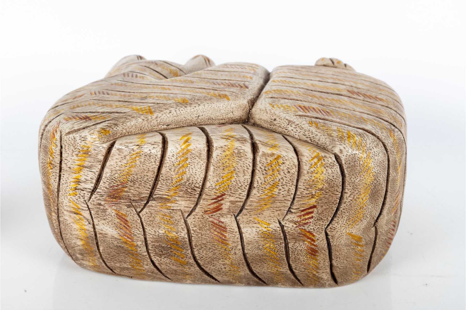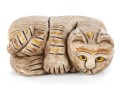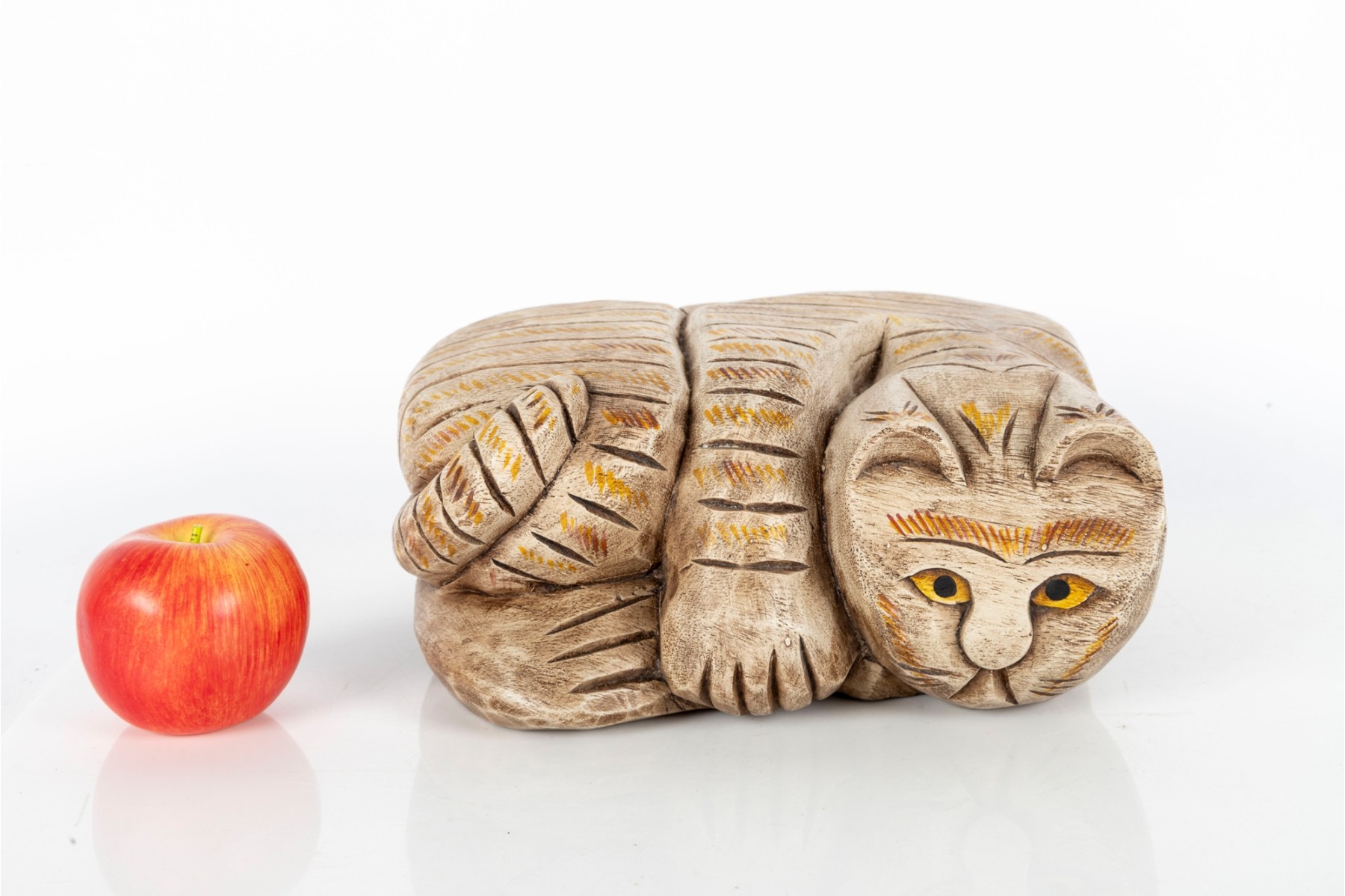 An unusual hand-carved and painted piece depicting a leisurely cat, cut and crafted from a single block of wood. Perfect for decorative use.