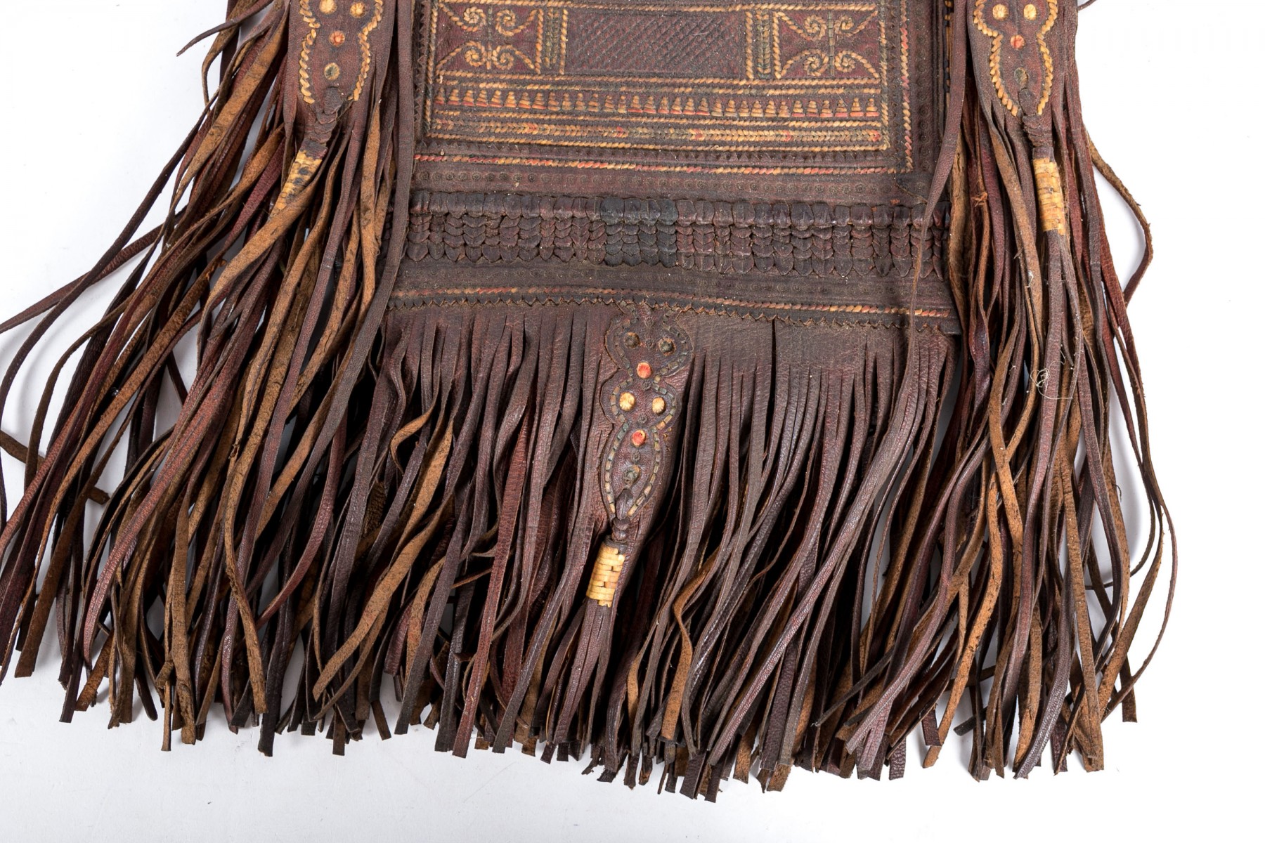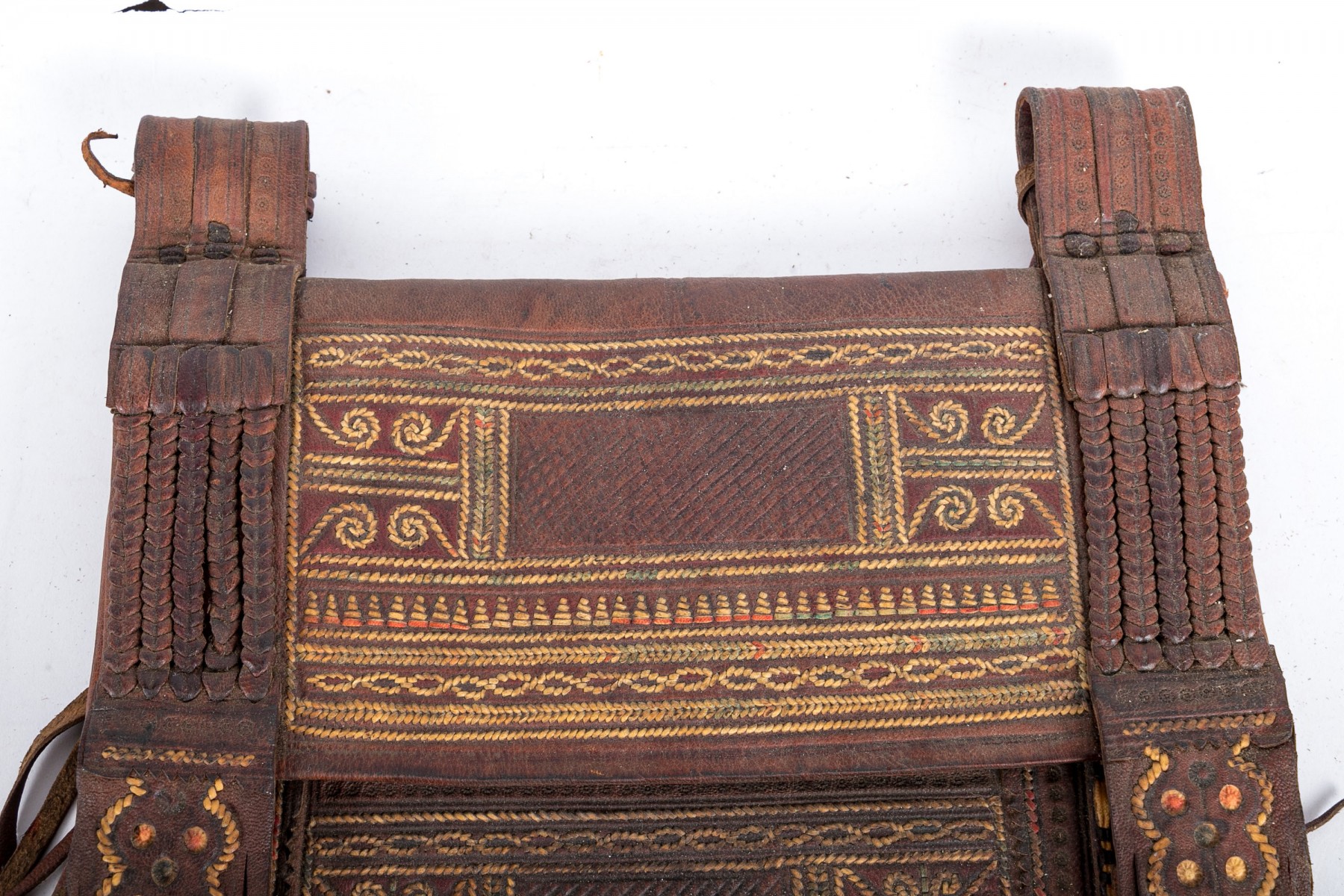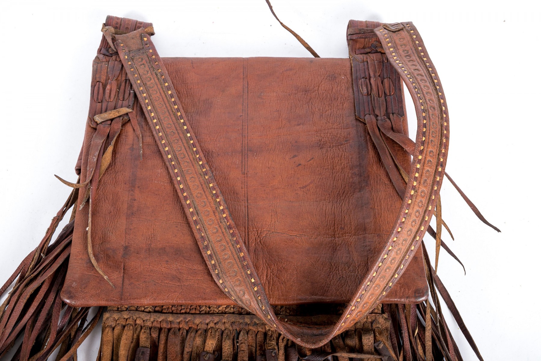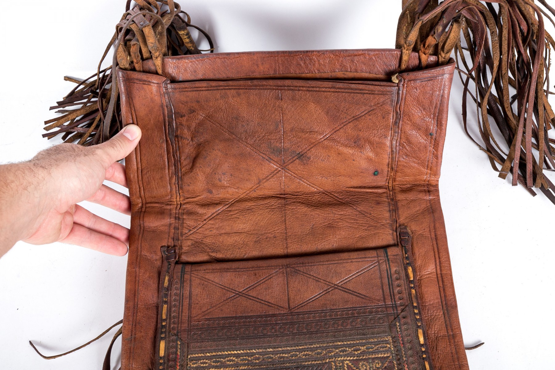 Gorgeous hand-crafted leather tribal Moroccan Tuareg bag displaying ornate embroidery with geometric borders in hues of yellow, green, and red. Braided leather bands flank a foldover-style flap opening, accented with tassels that compliment a fringe at the bottom. The layered exterior of the bag creates multiple pockets.