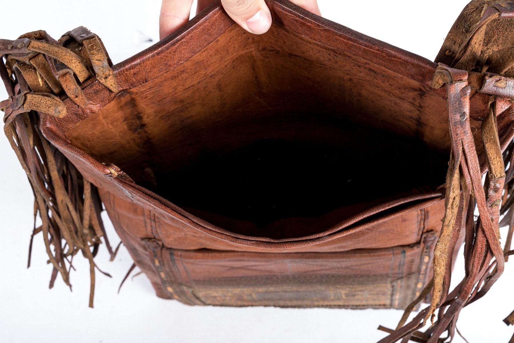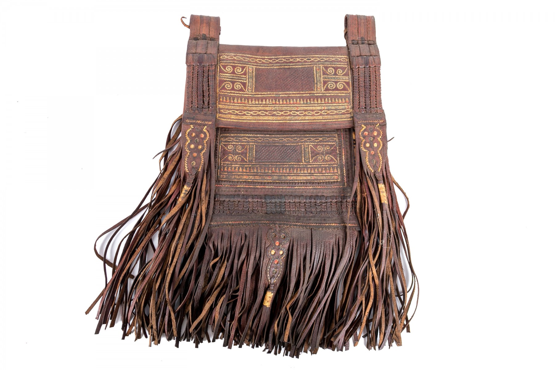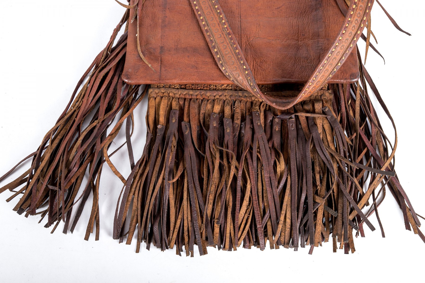 Gorgeous hand-crafted leather tribal Moroccan Tuareg bag displaying ornate embroidery with geometric borders in hues of yellow, green, and red. Braided leather bands flank a foldover-style flap opening, accented with tassels that compliment a fringe at the bottom. The layered exterior of the bag creates multiple pockets.