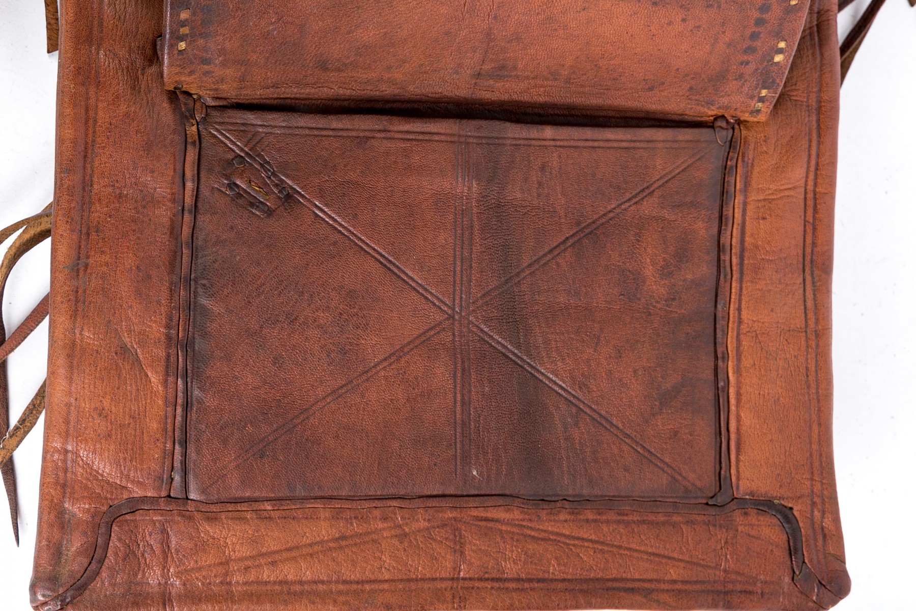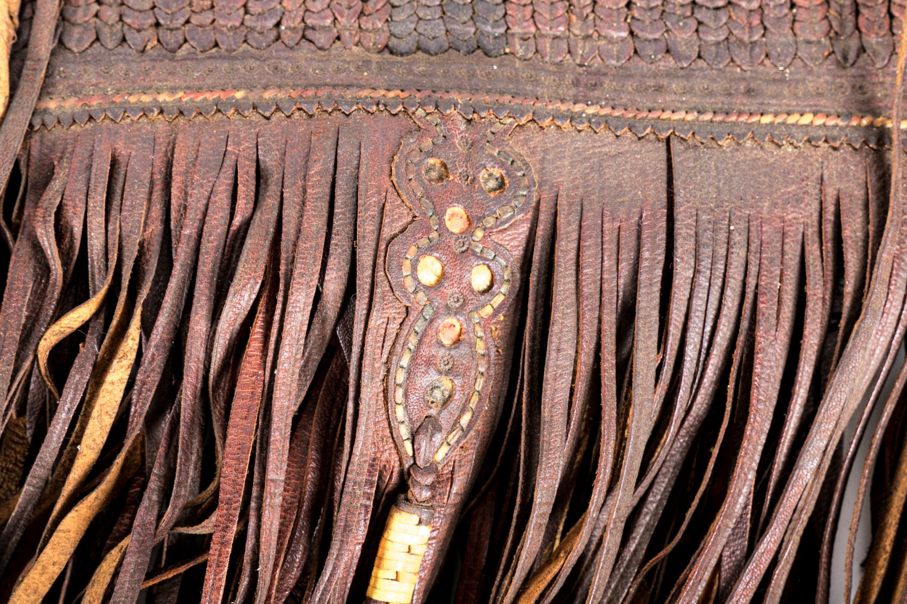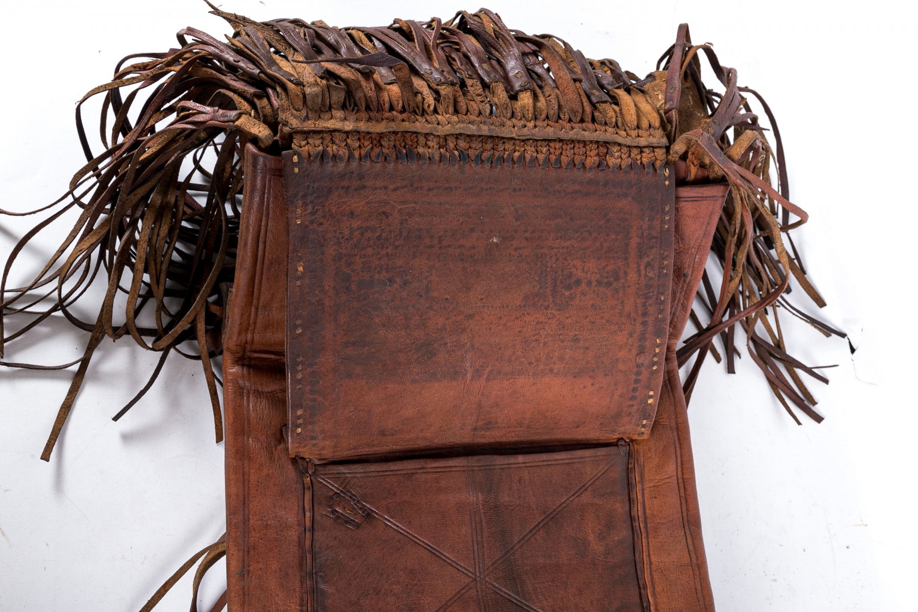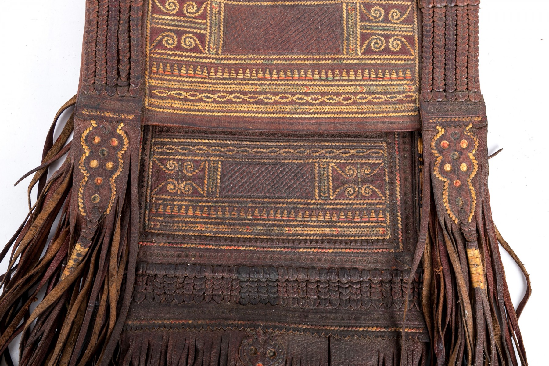 Gorgeous hand-crafted leather tribal Moroccan Tuareg bag displaying ornate embroidery with geometric borders in hues of yellow, green, and red. Braided leather bands flank a foldover-style flap opening, accented with tassels that compliment a fringe at the bottom. The layered exterior of the bag creates multiple pockets.