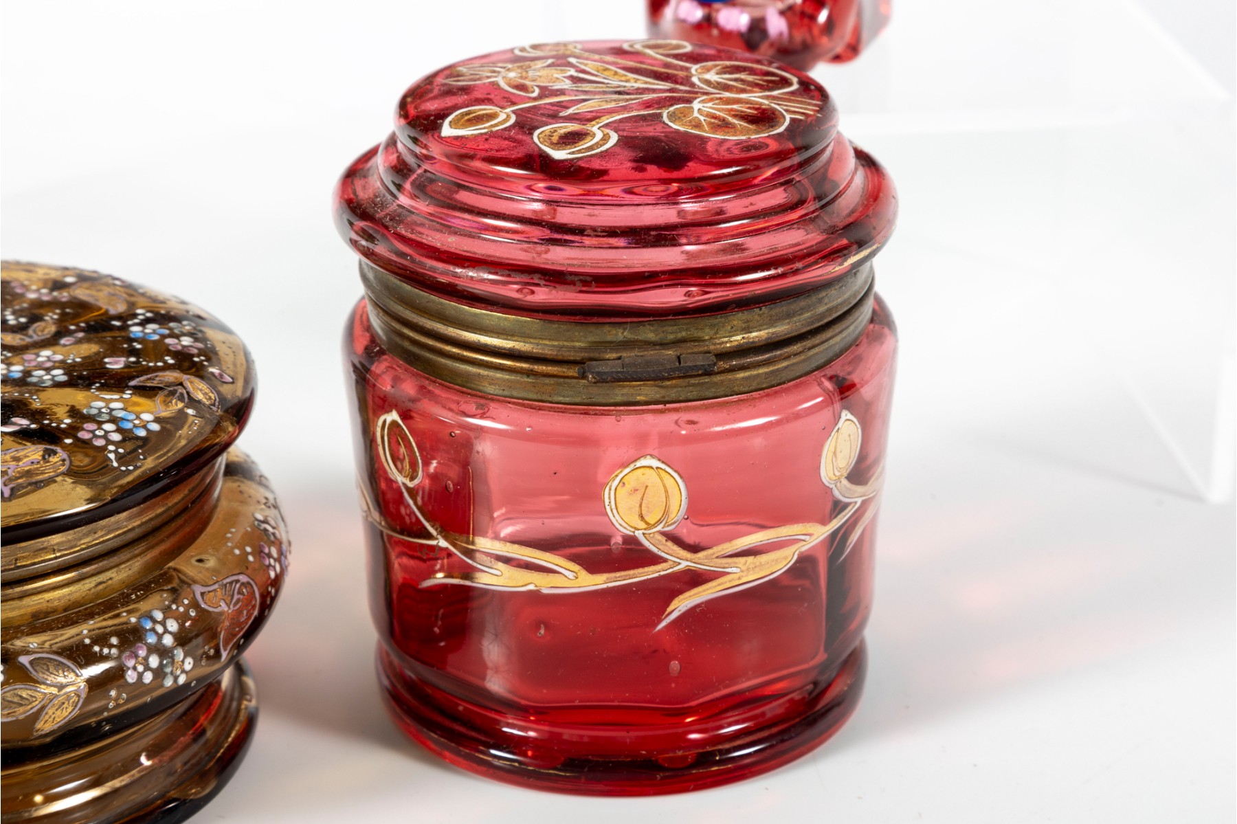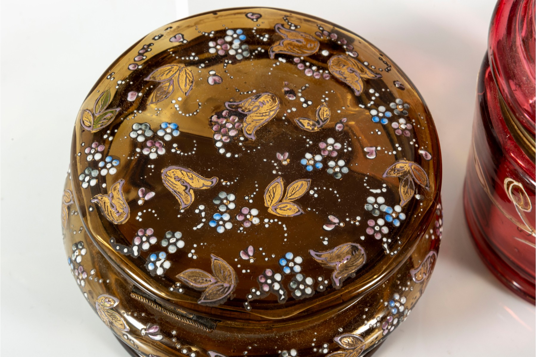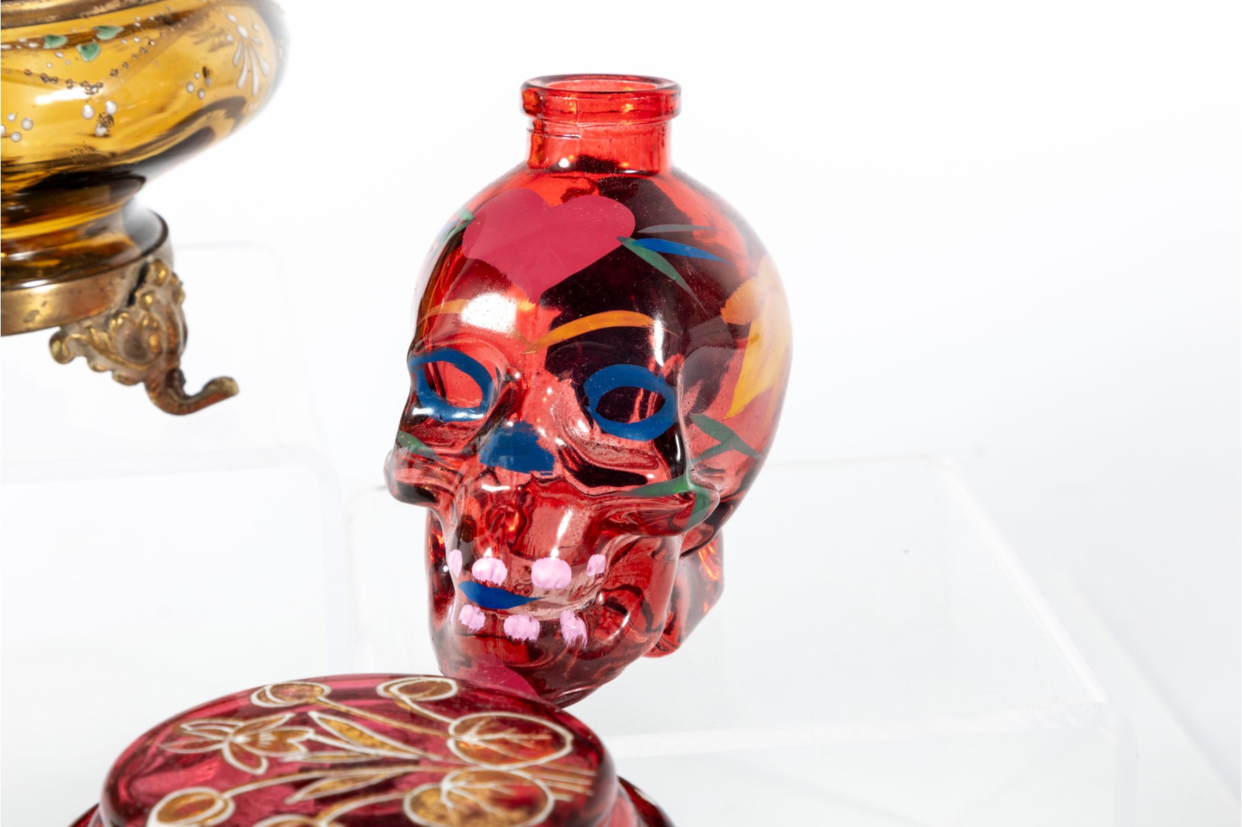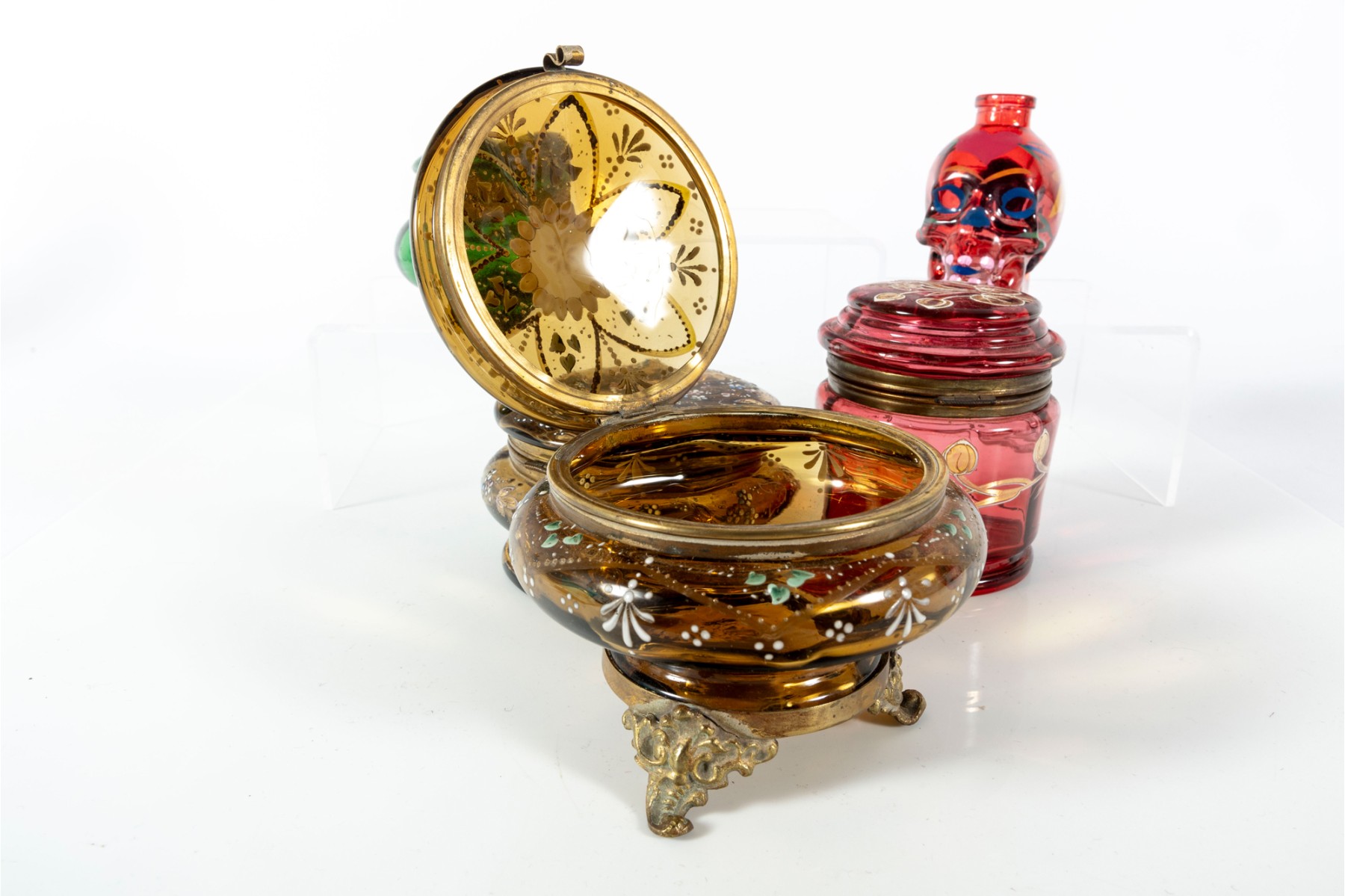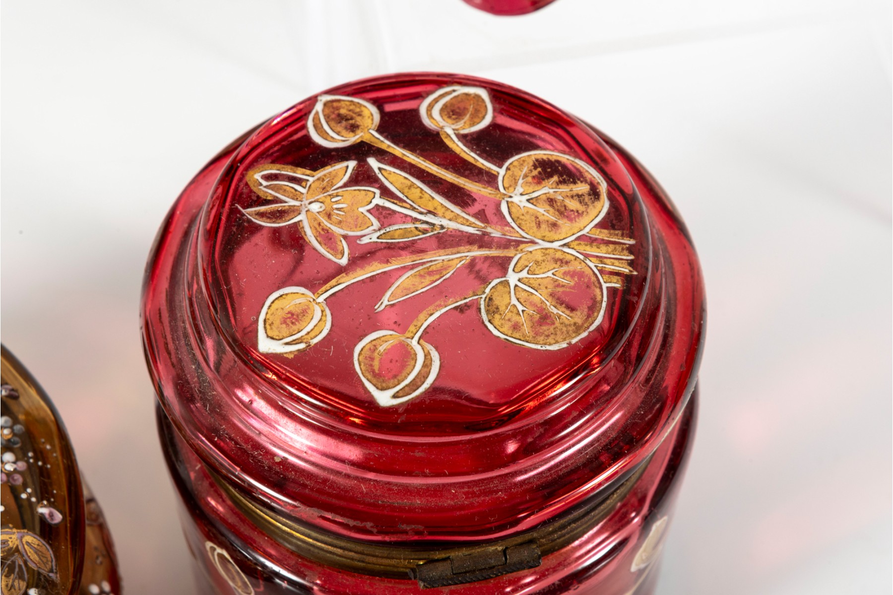 A lovely group of four lidded vessels in cranberry, amber, and green depression glass, accompanied by a skull-shaped bottle. All hand-decorated with floral sprays and stippled patterns.