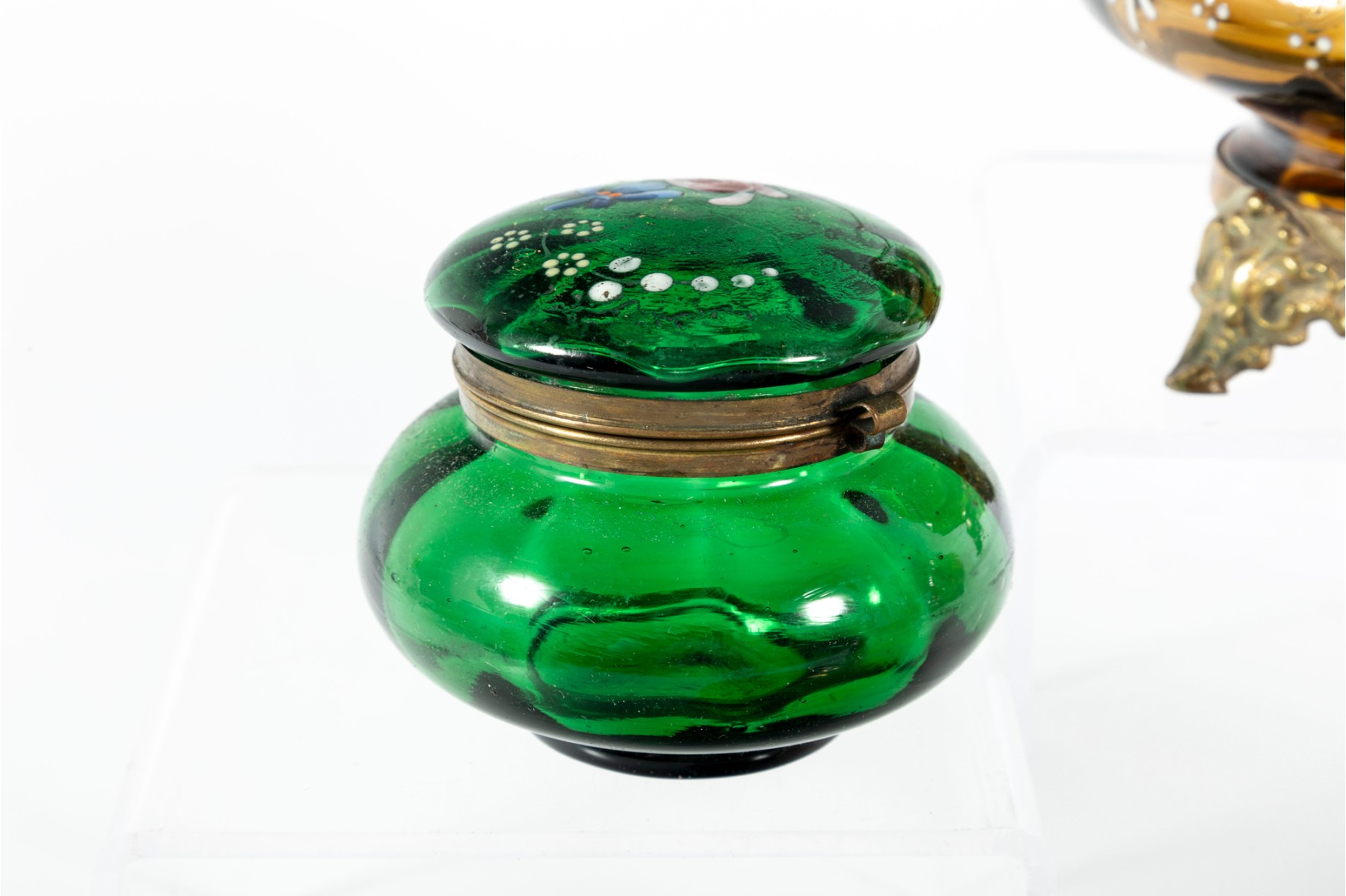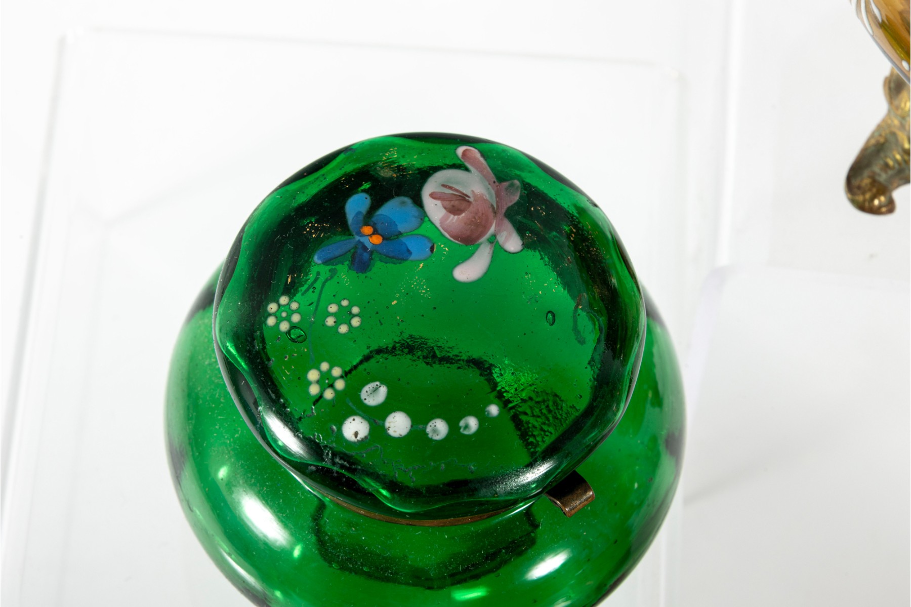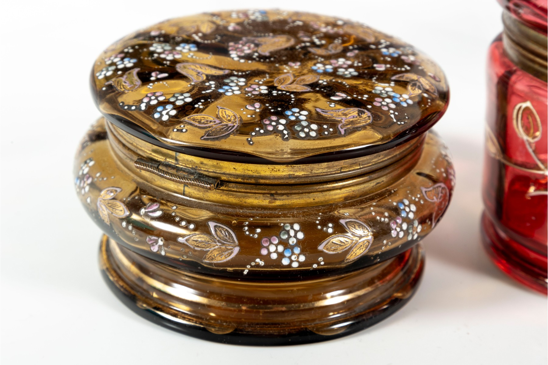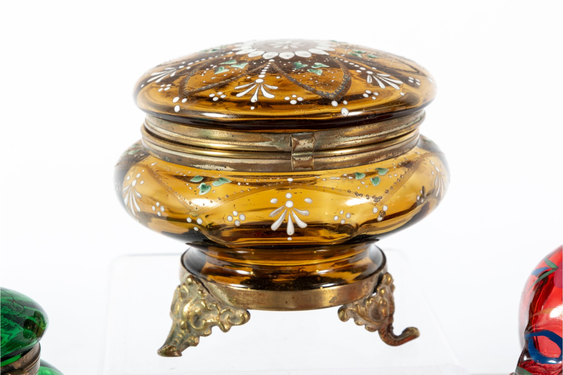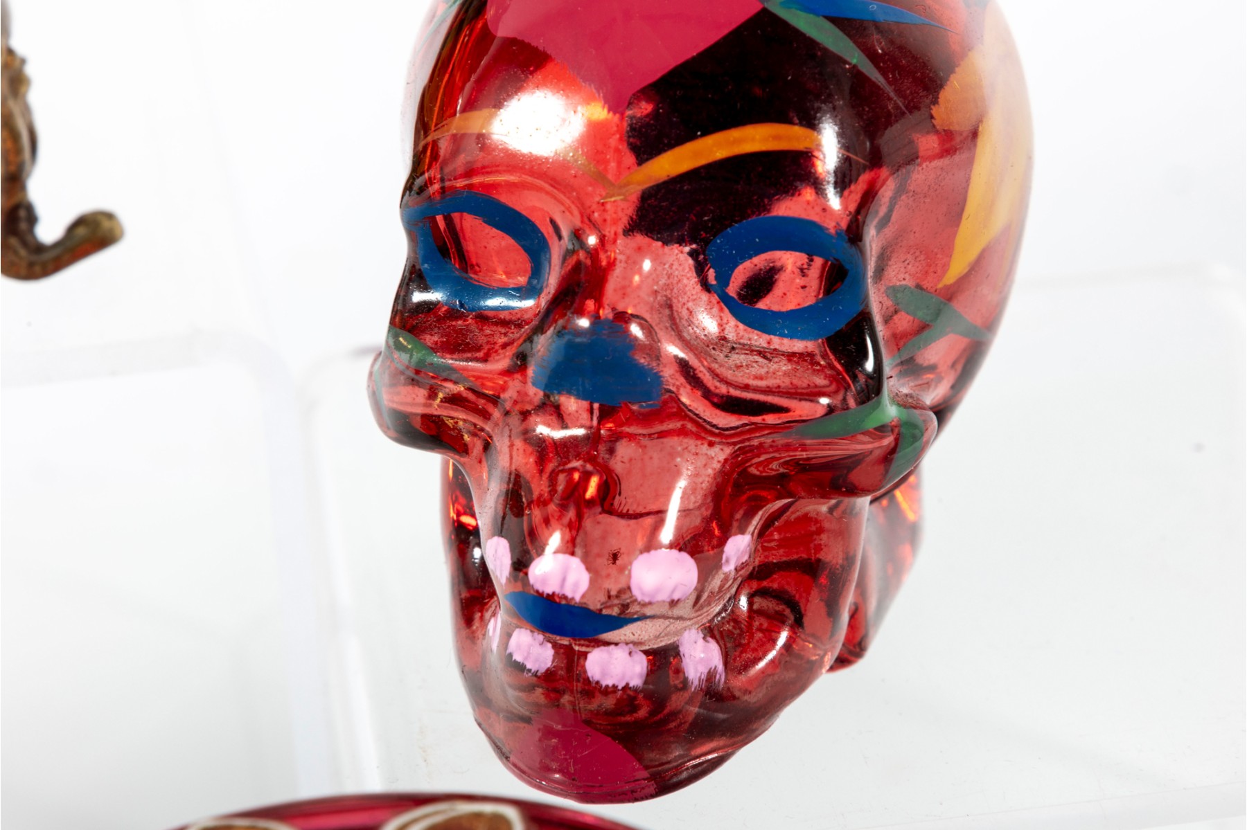 A lovely group of four lidded vessels in cranberry, amber, and green depression glass, accompanied by a skull-shaped bottle. All hand-decorated with floral sprays and stippled patterns.