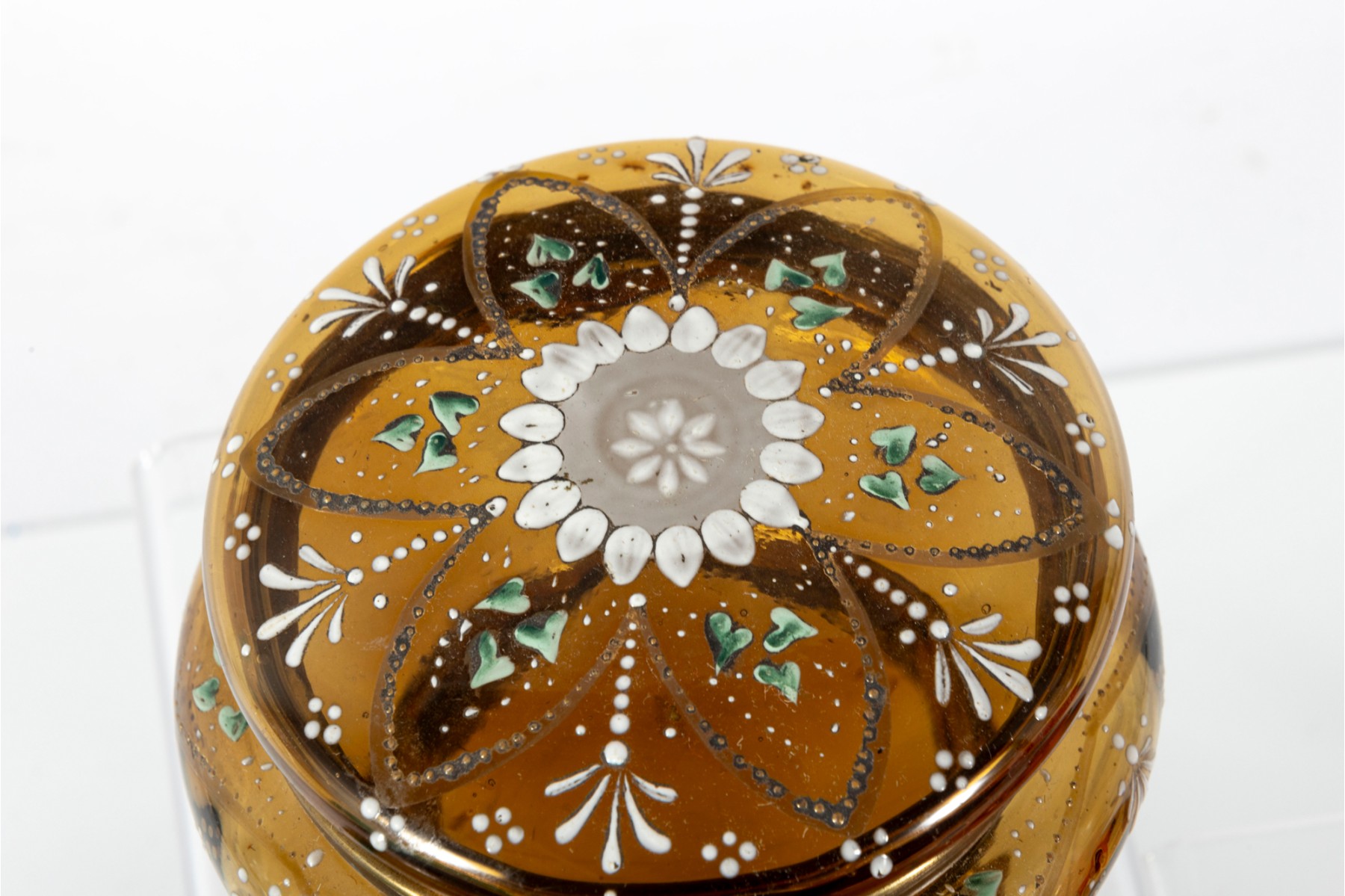 Large amber glass box- 3 3/4" H x 4 1/2" diameter