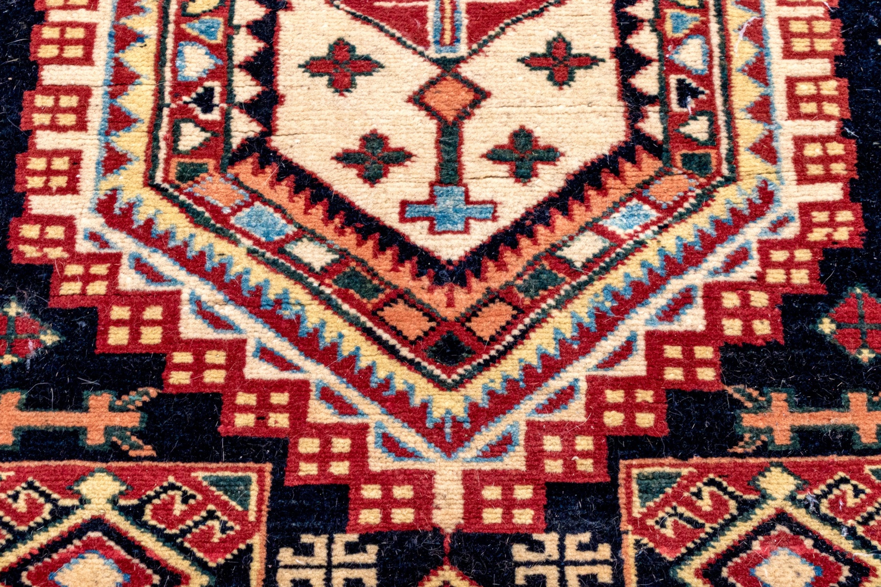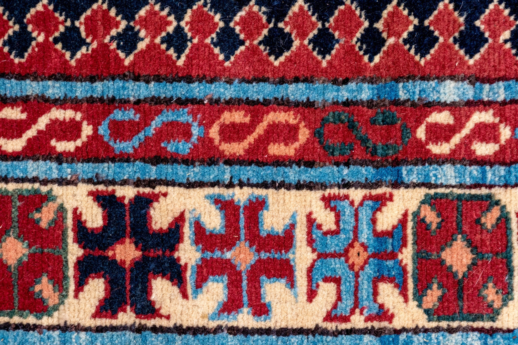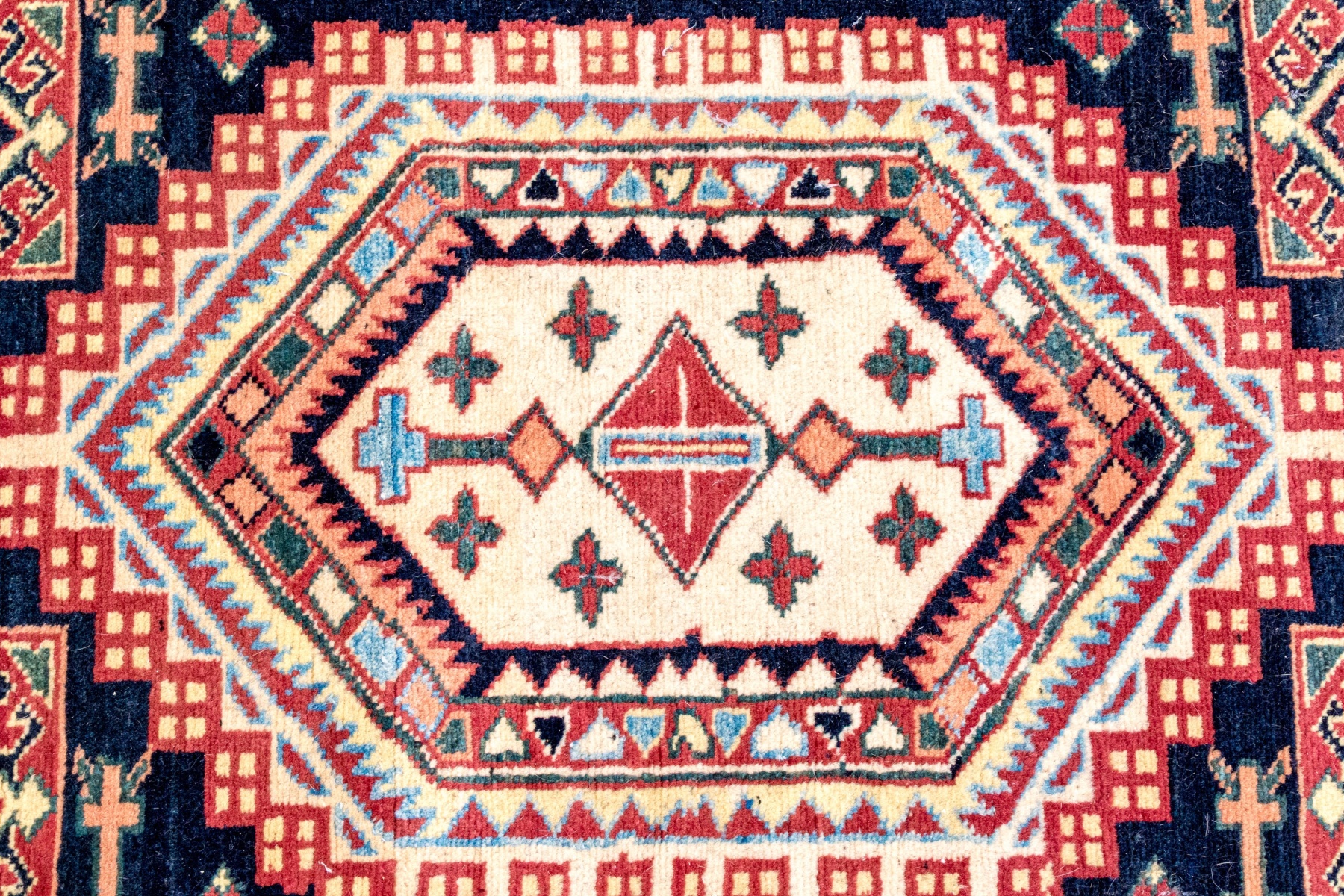 The runner features a central rectangular field with a dark blue ground, centered by a hexagonal reserve filled with intricate geometric and floral motifs. Surrounding the field are multiple border guards in complementary red and ivory tones.