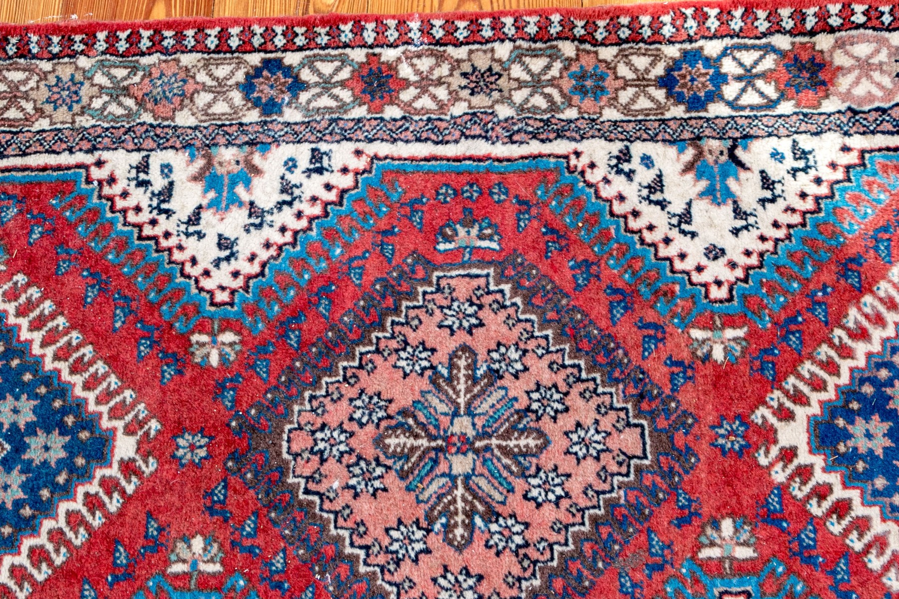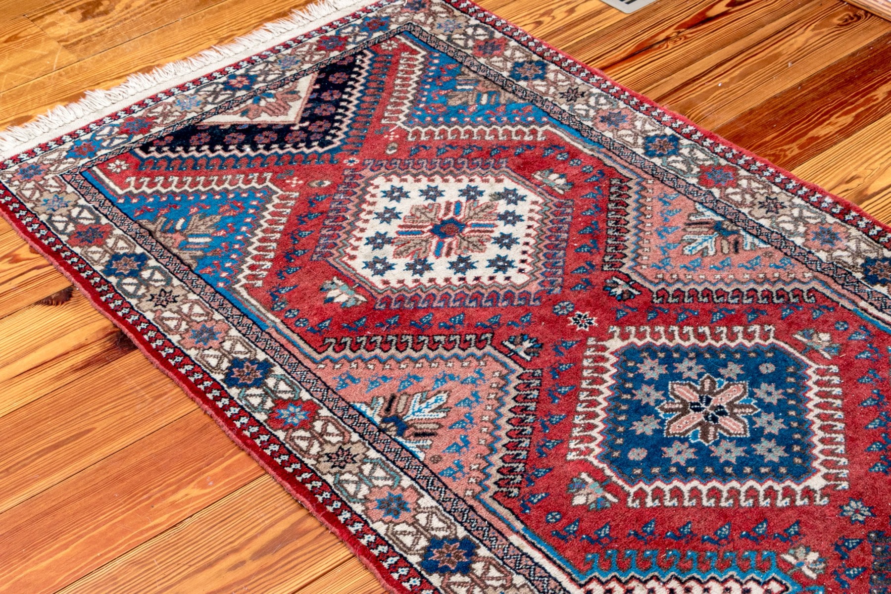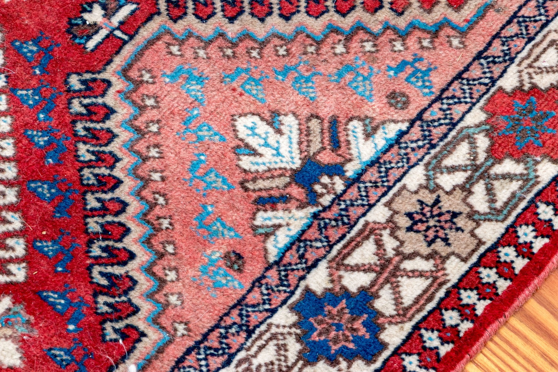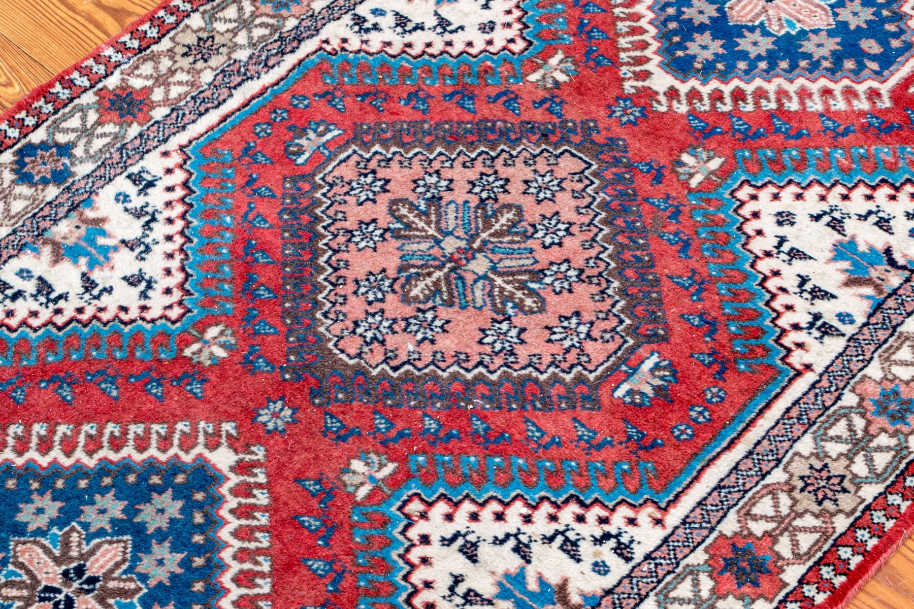 A wonderful hand-knotted wool Persian runner displaying a white main border with alternating floral motifs flanked by red and pink guard borders around a geometric field of diamond-shaped medallions in blue, white, black, and pink.