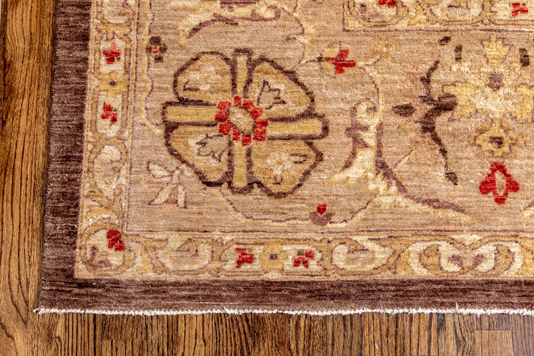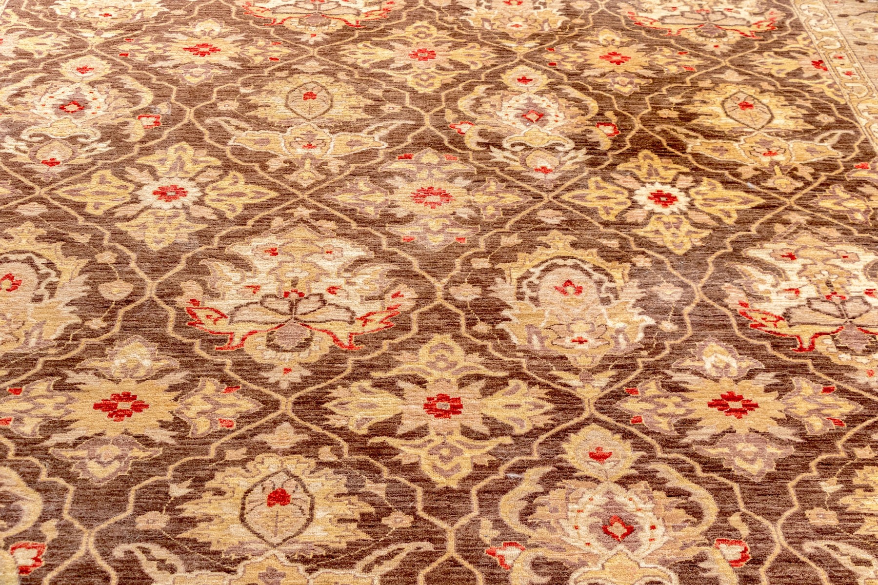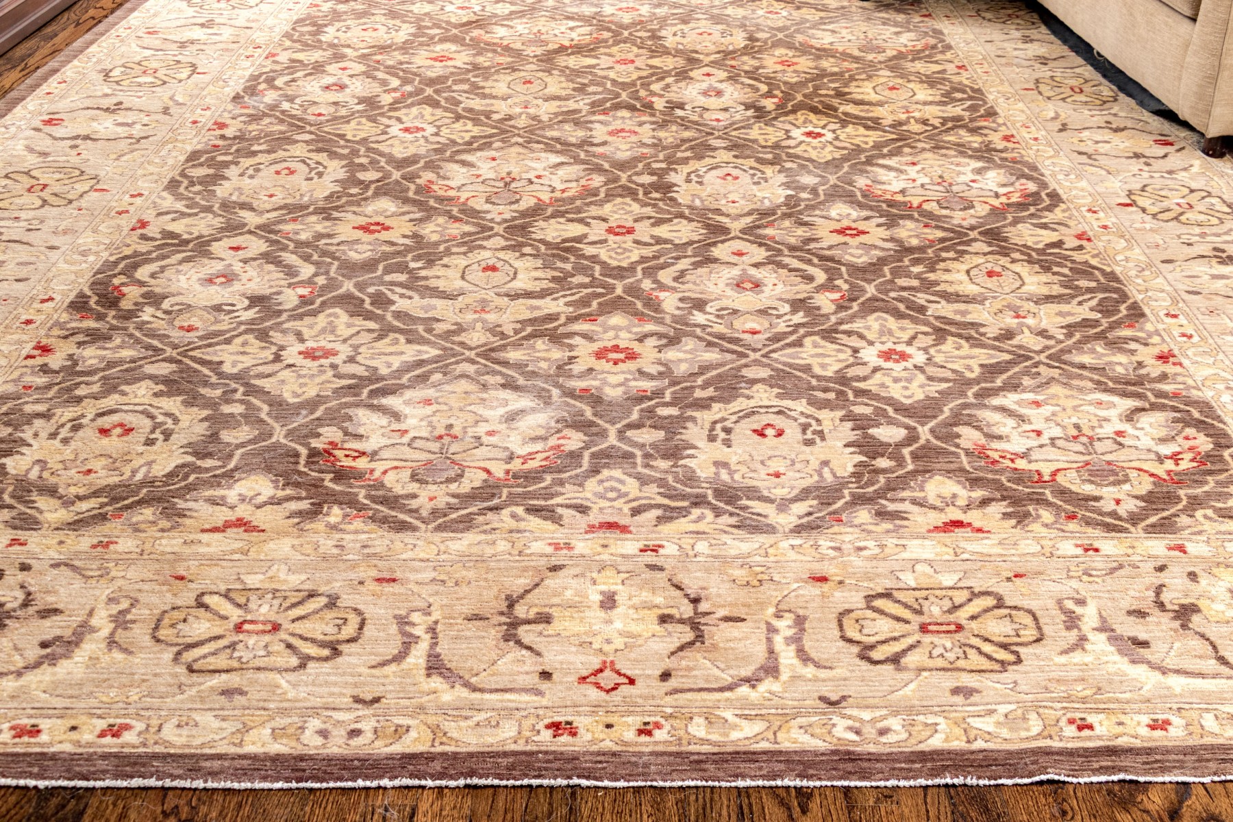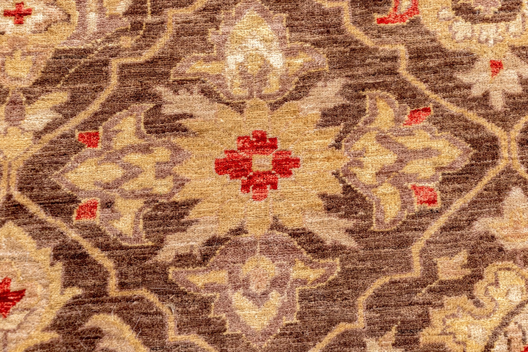 Having earth toned hues including espresso brown, warm reds with tan and ivory hues in a decorative central pattern with lighter ground border guard around.
