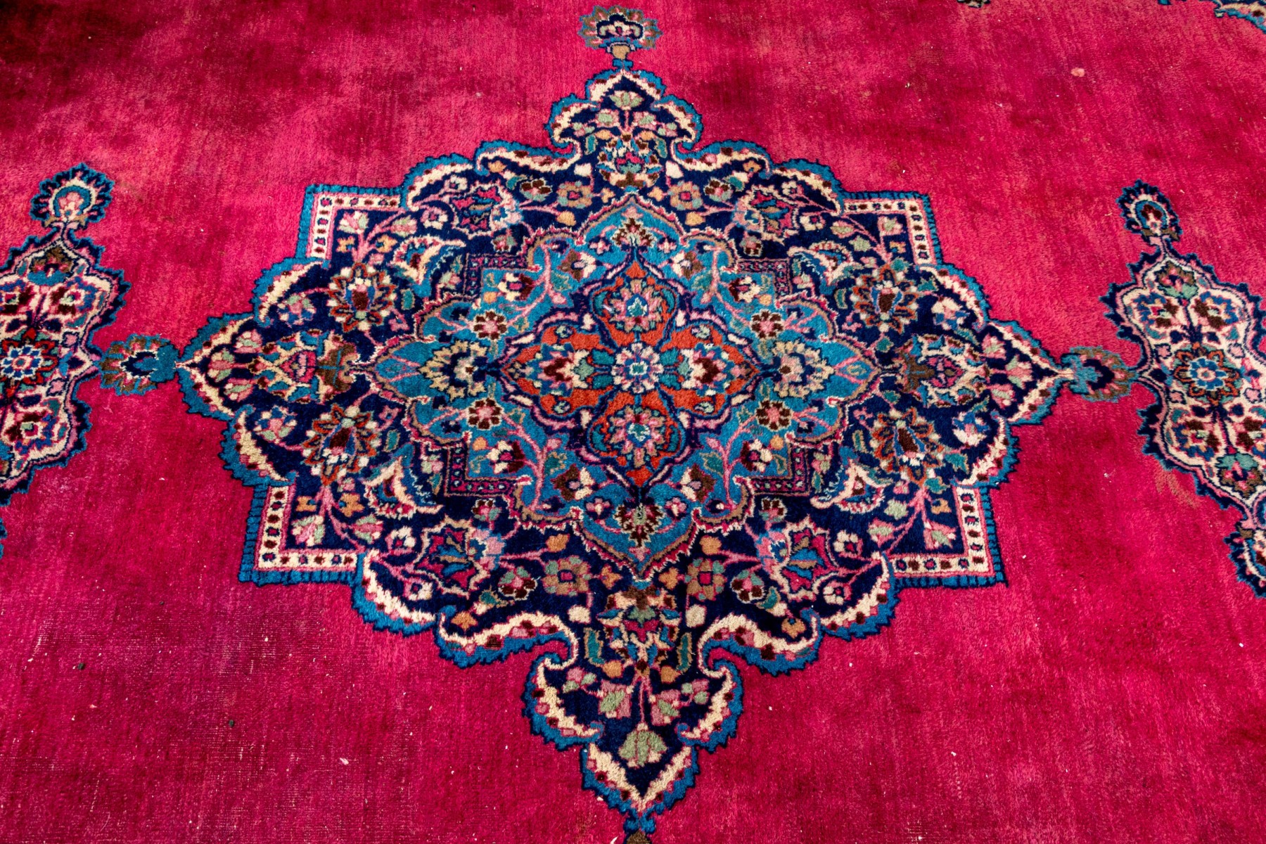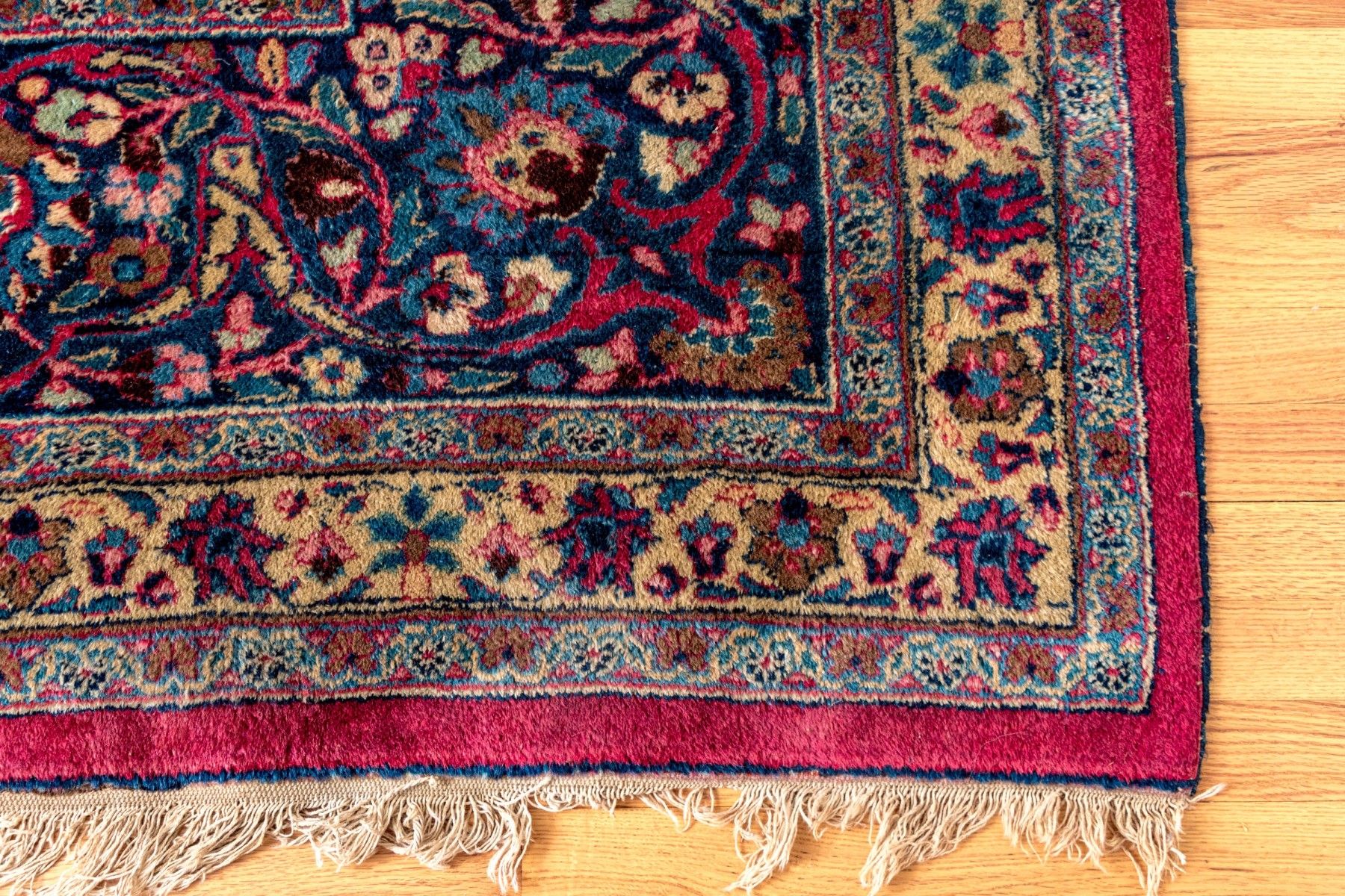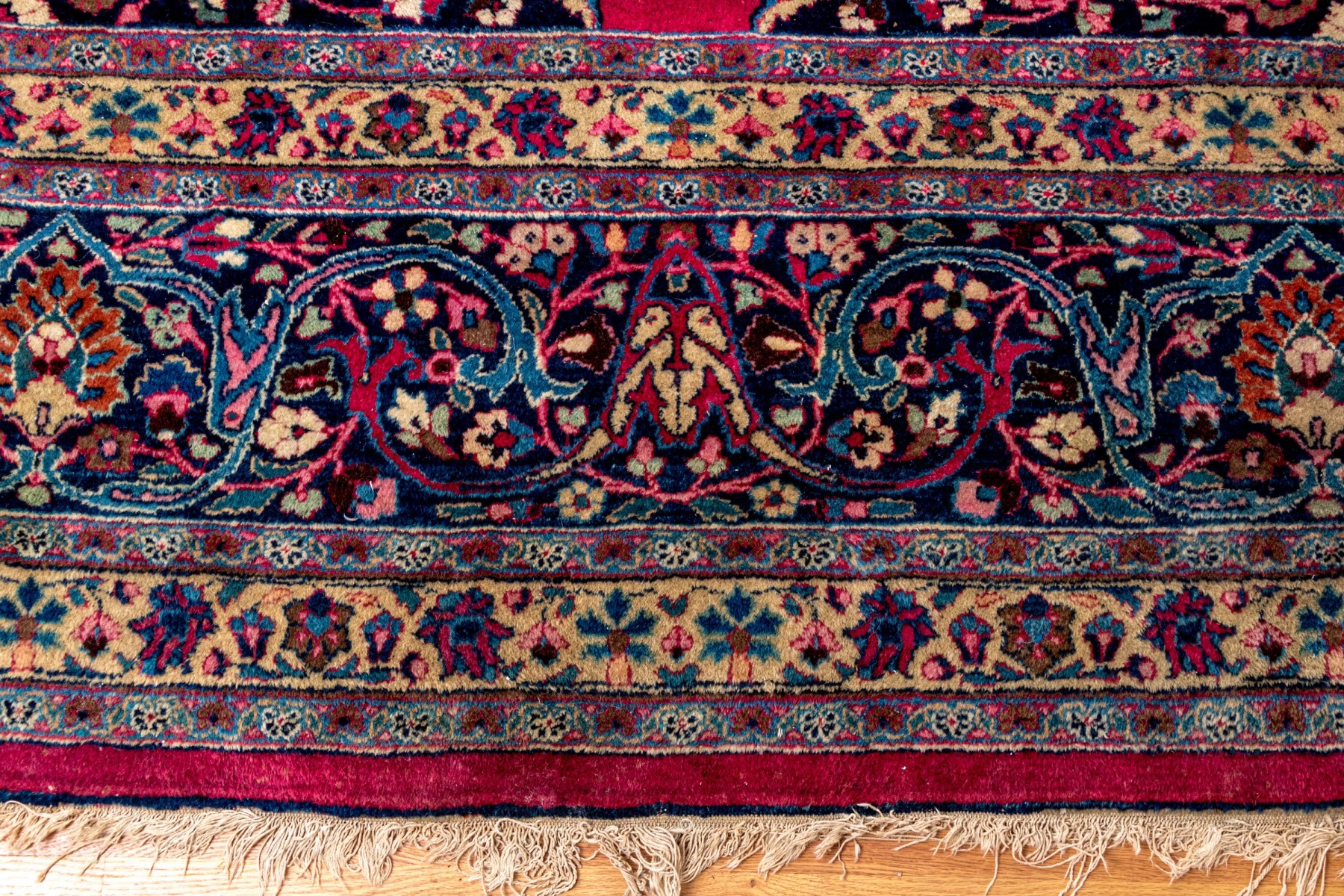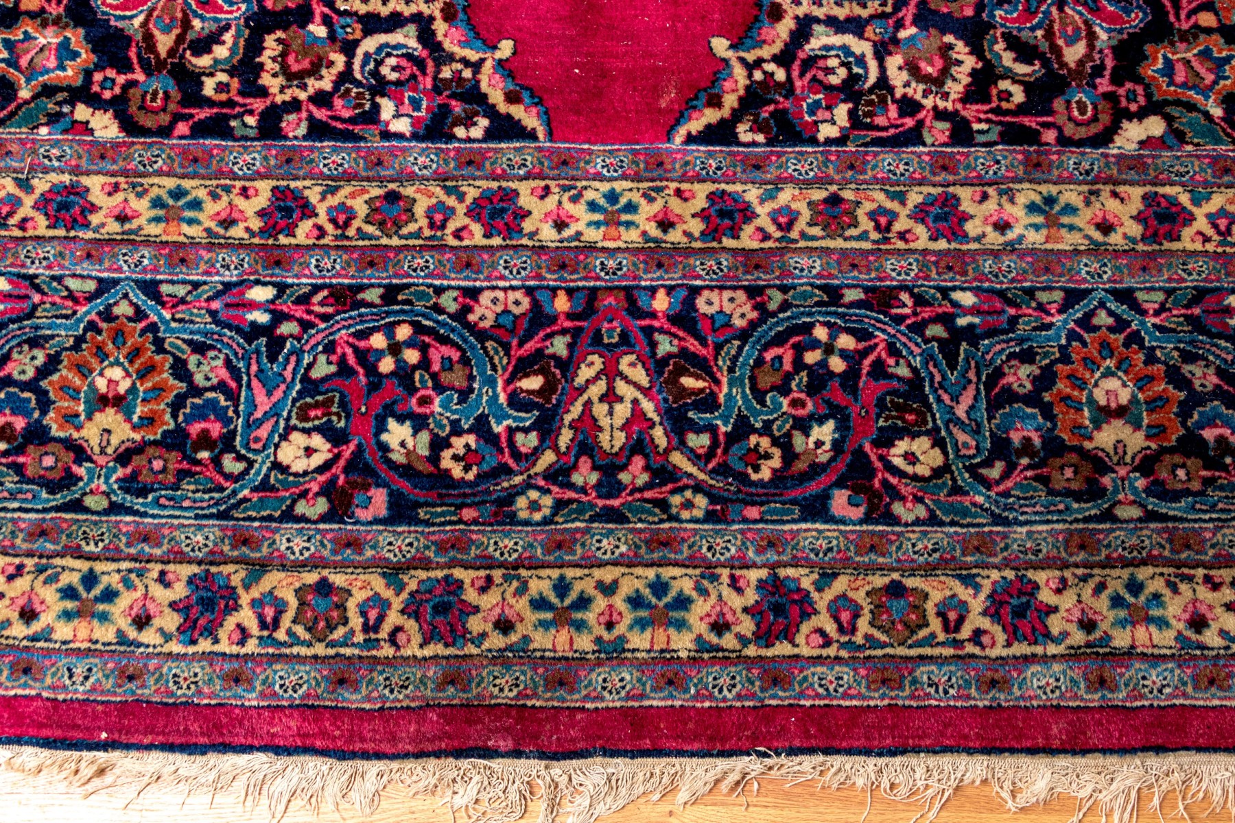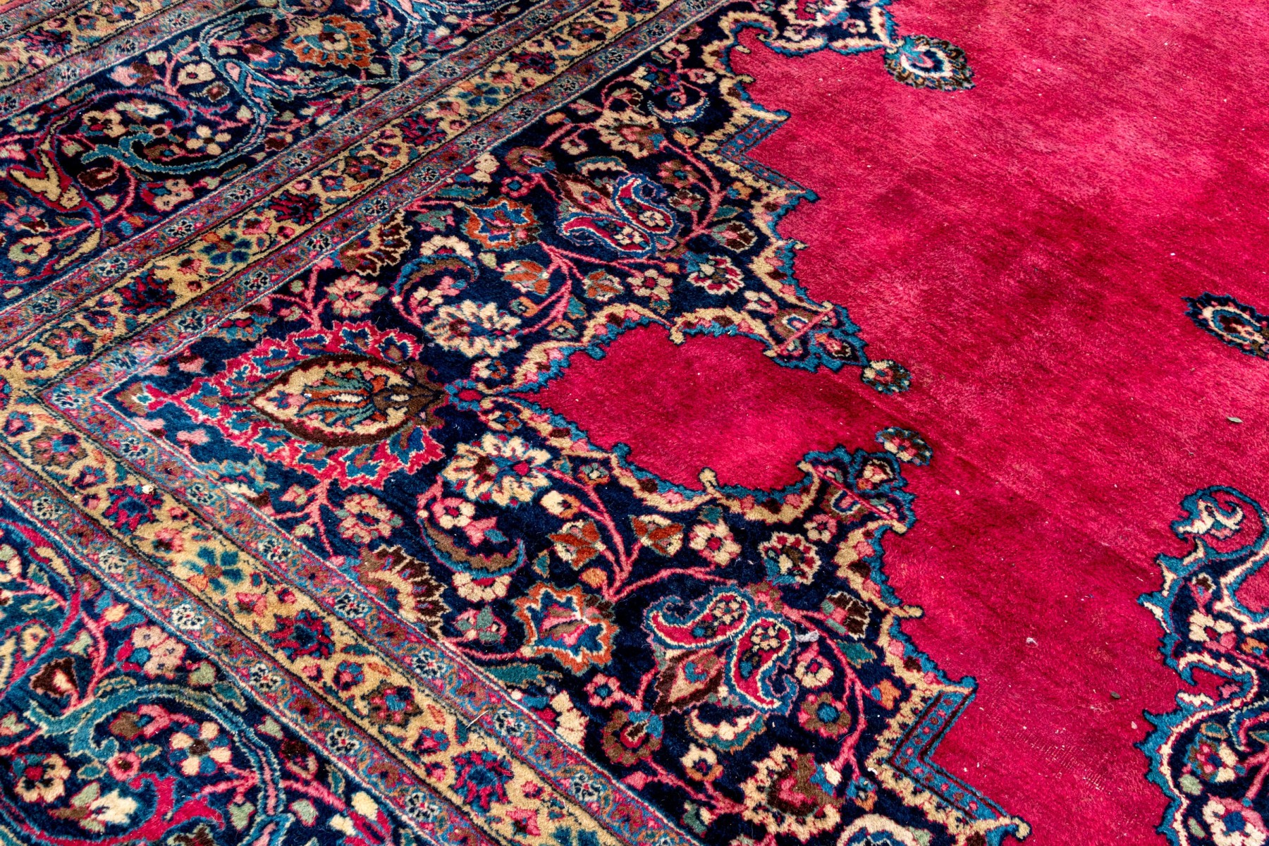 A handsome hand-knotted room size wool rug designed with a wide, dark navy main border decorated with lavish vining foliage flanked by yellow and blue guard borers around a vibrant pinkish-red field. The field is shaped by elegant spandrels matching the main border, leading to a sprawling center medallion concentrically patterned in blue, orange, pink, and yellow.