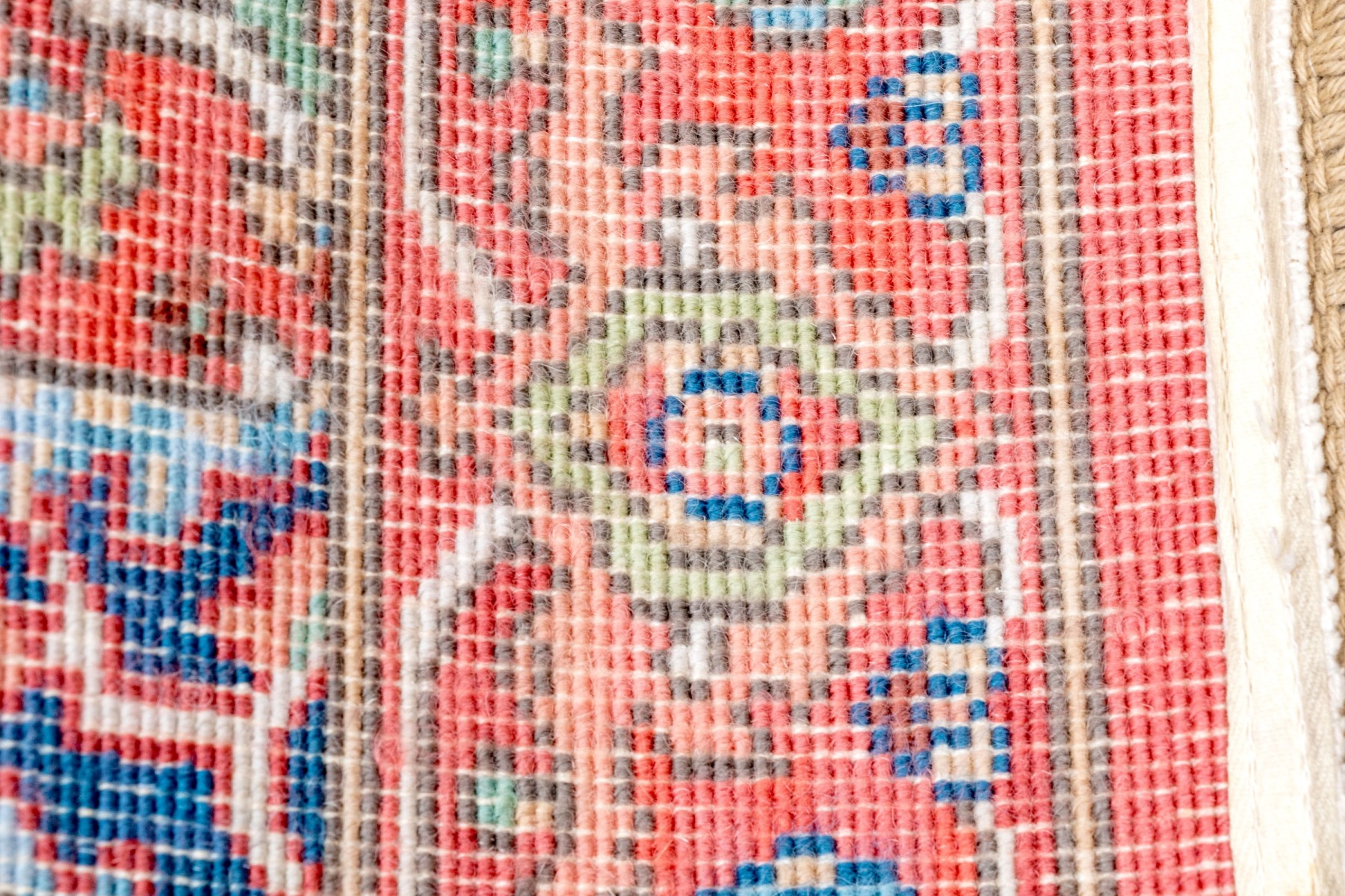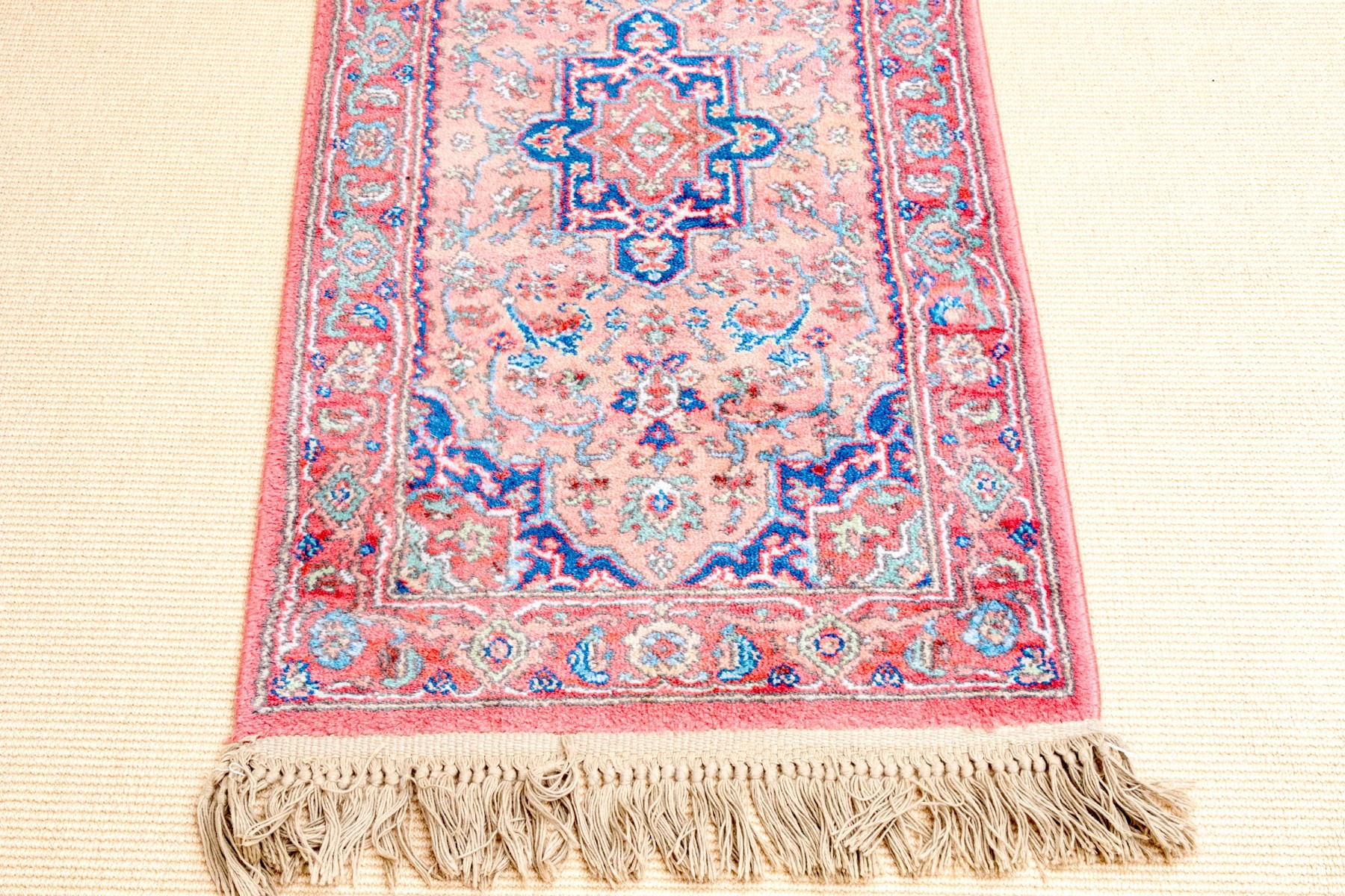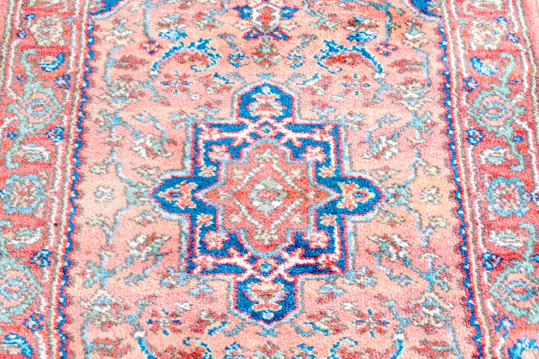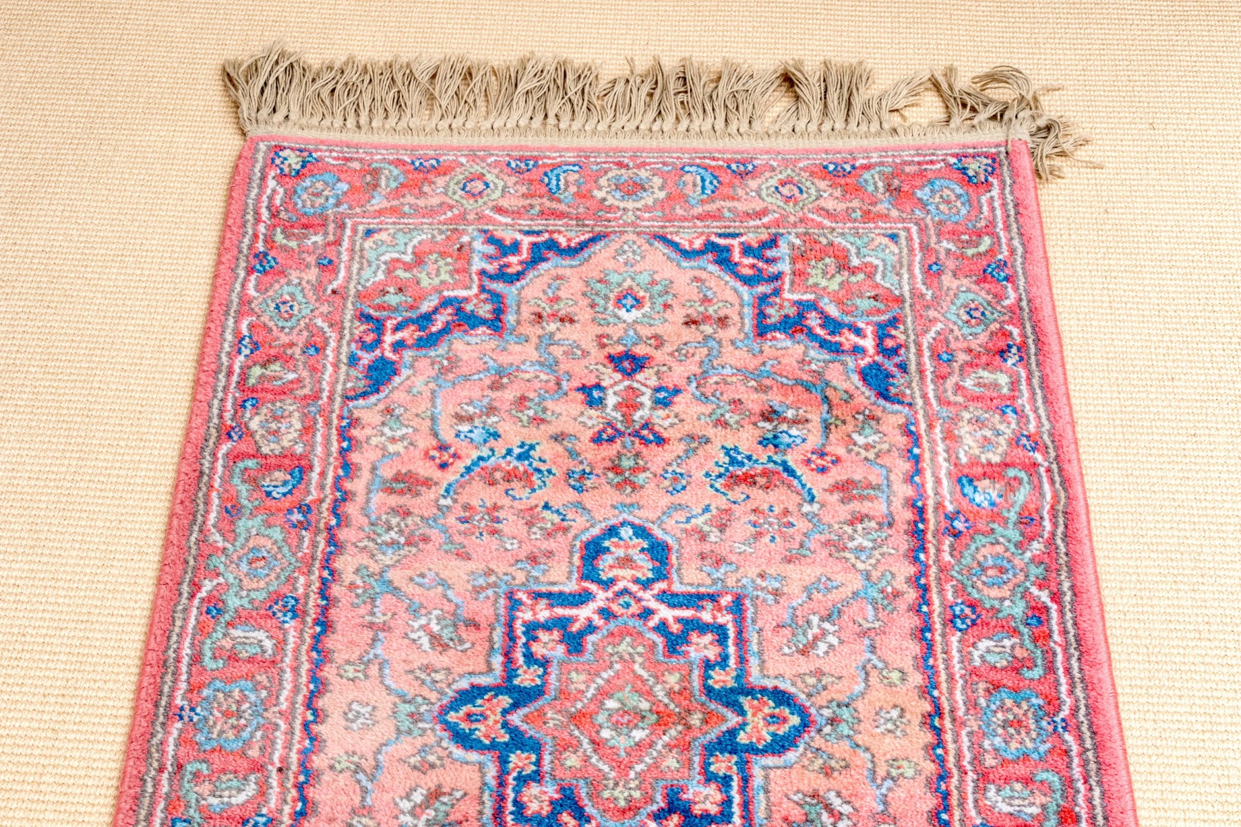 A delightful hand-knotted wool accent rug showcasing a pinkish red main border with vinig florals flanked by narrow beige and brown guard borders around a pink field. The field is framed by blue spandrels complimenting a shapely rectangular petaled medallion at the center surrounded by fine vining foliage in seafoam green, blue, pink, and red.