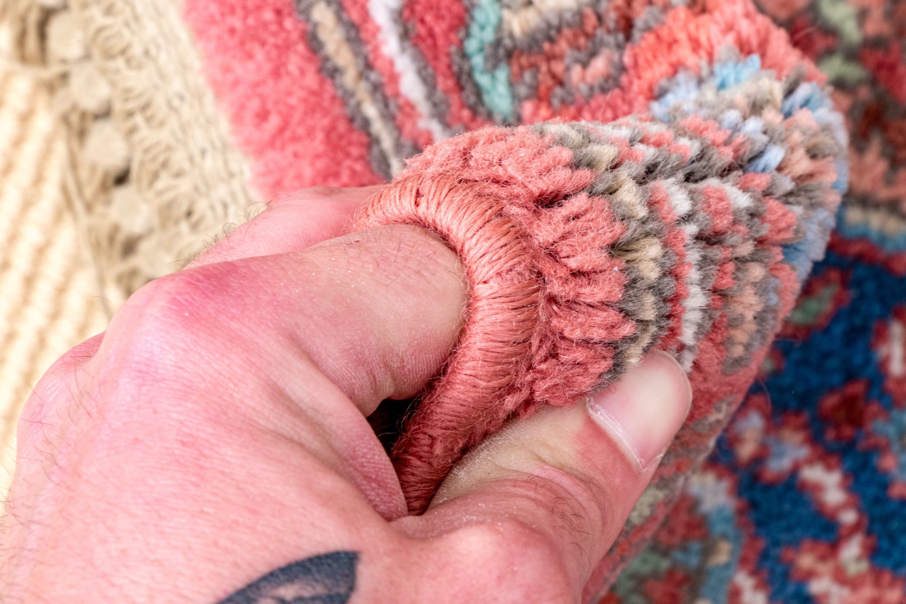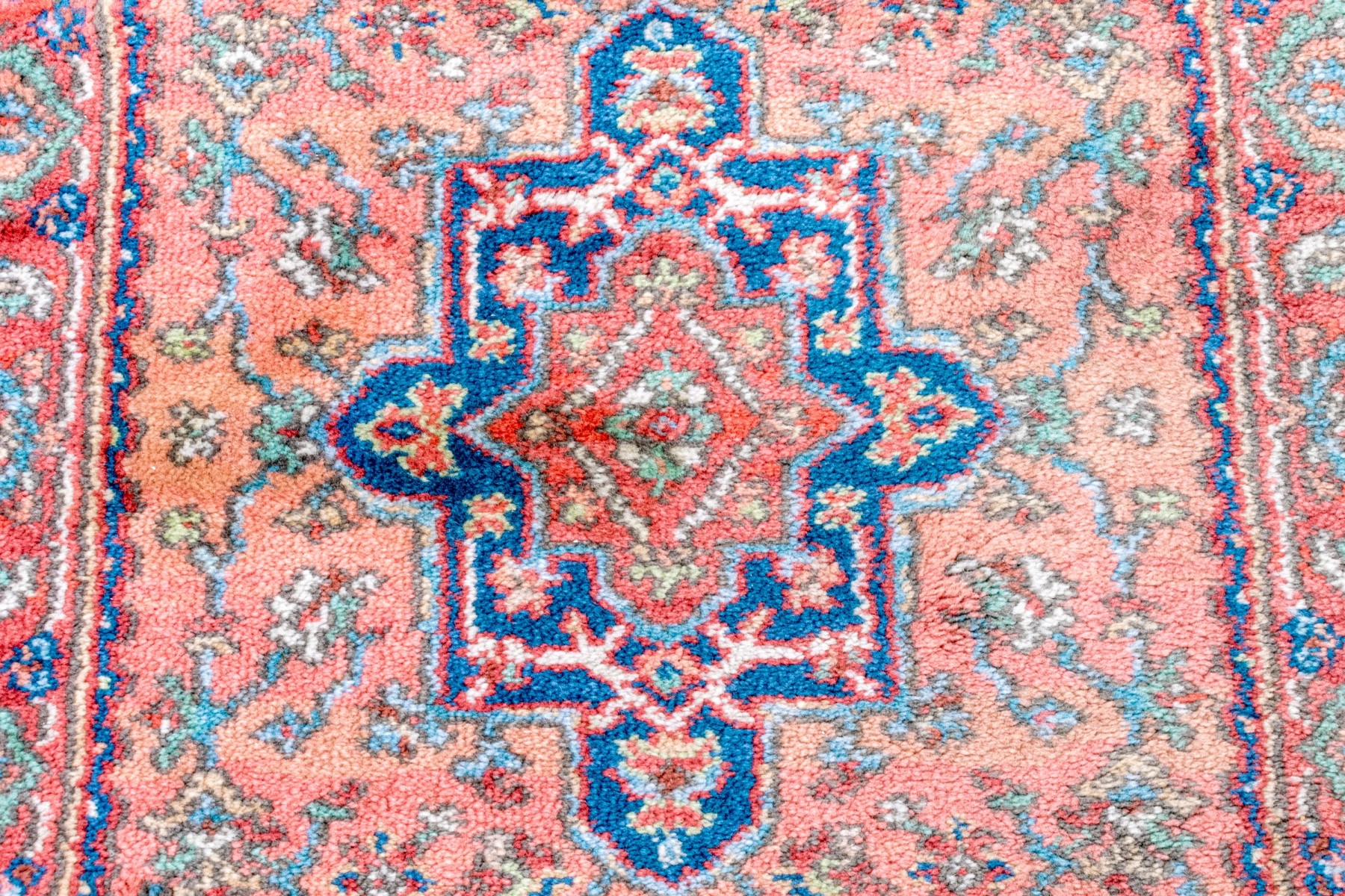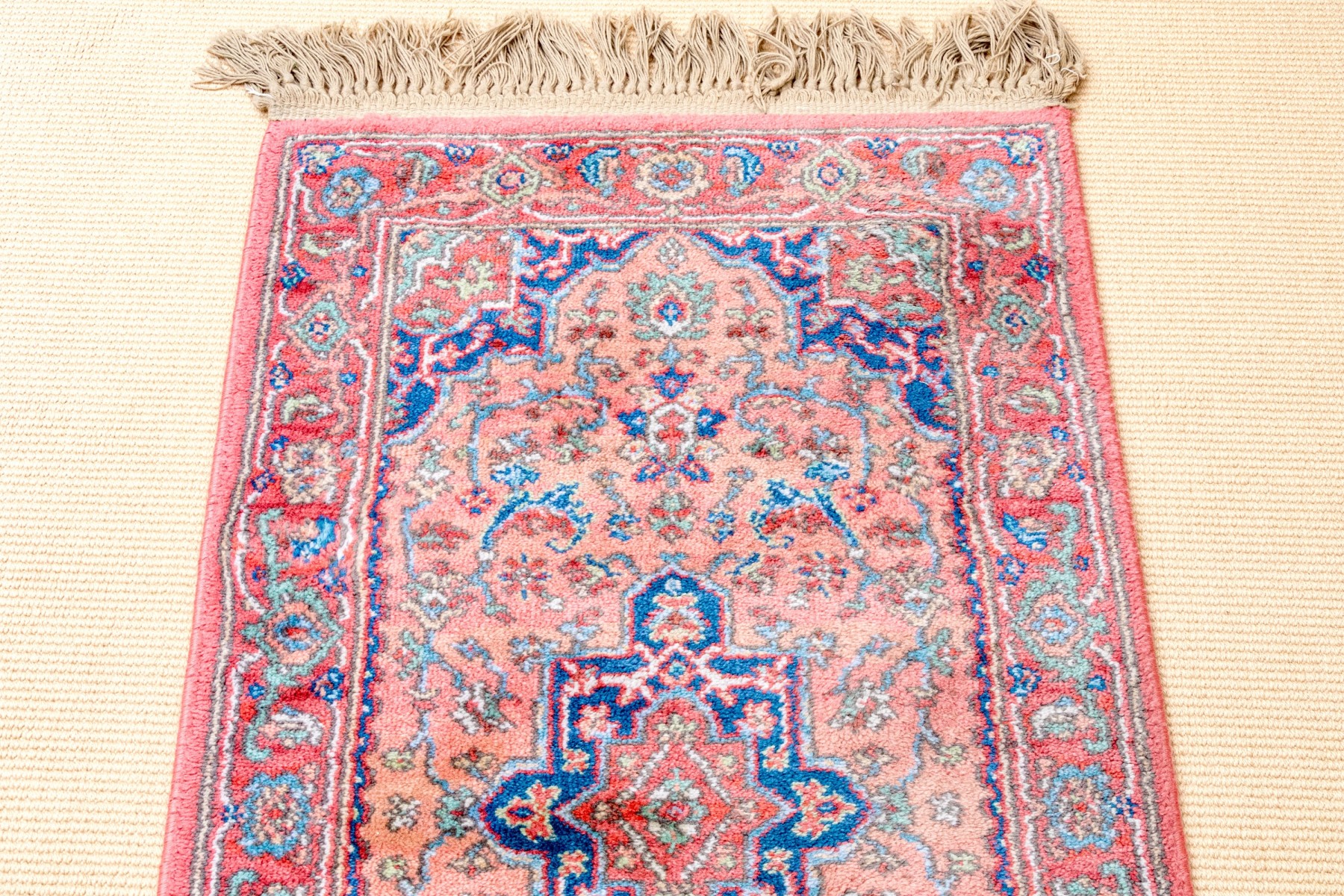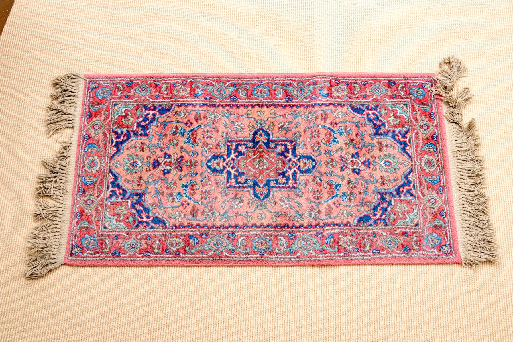 A delightful hand-knotted wool accent rug showcasing a pinkish red main border with vinig florals flanked by narrow beige and brown guard borders around a pink field. The field is framed by blue spandrels complimenting a shapely rectangular petaled medallion at the center surrounded by fine vining foliage in seafoam green, blue, pink, and red.