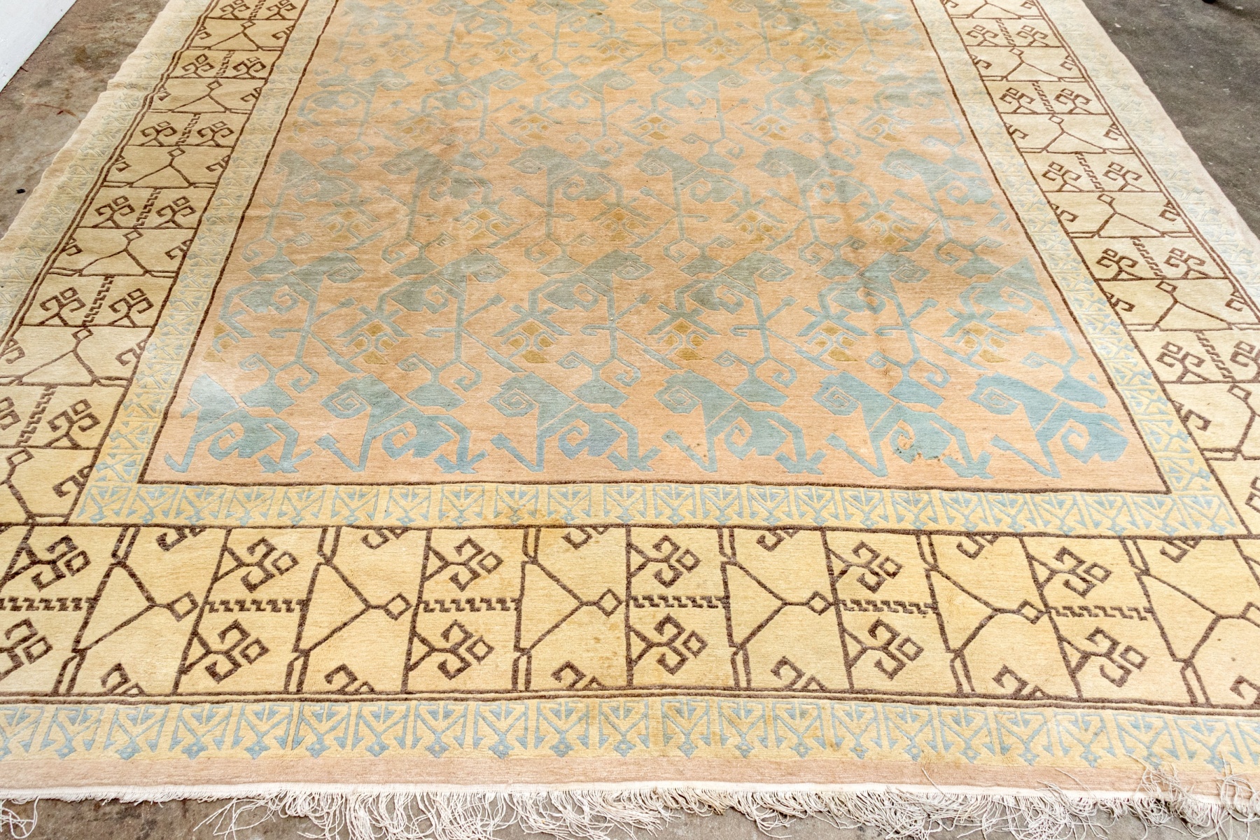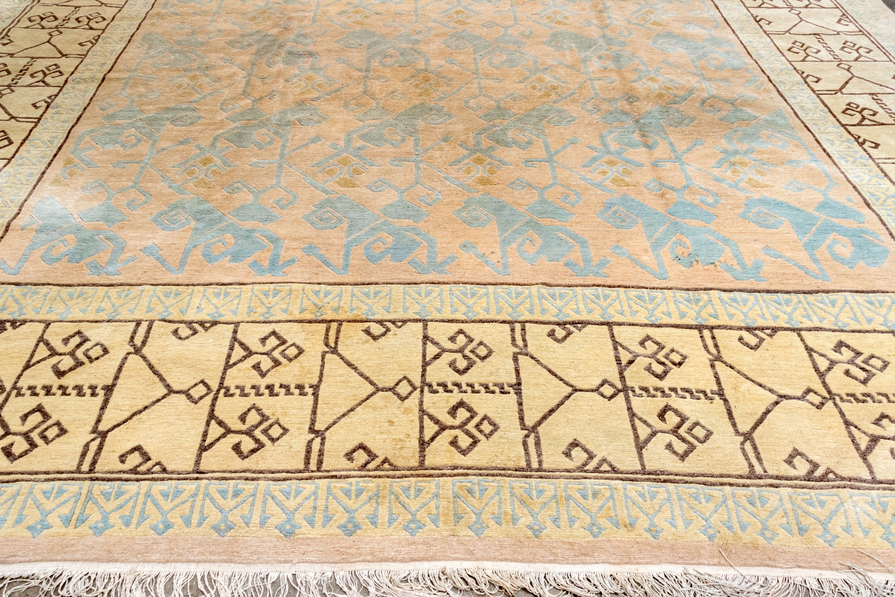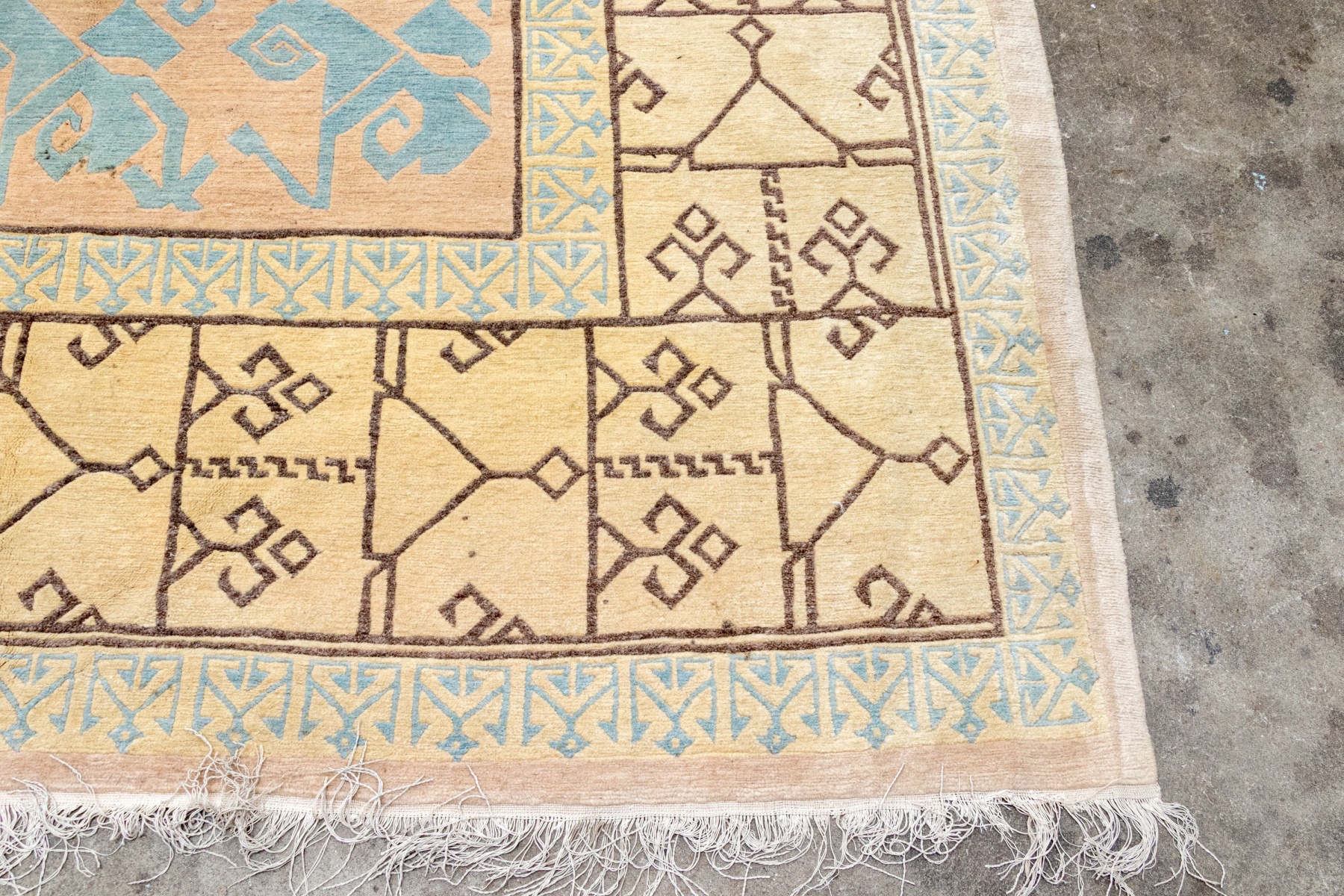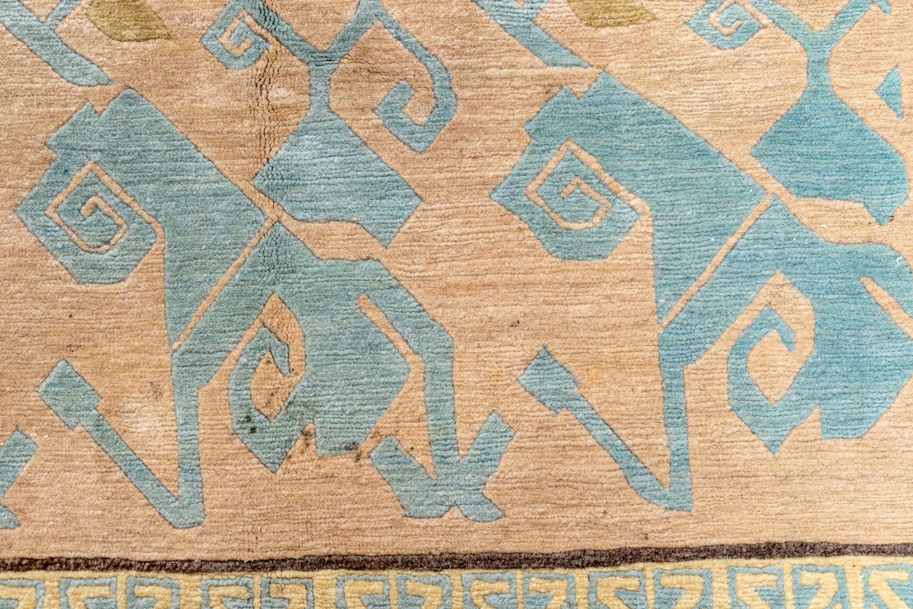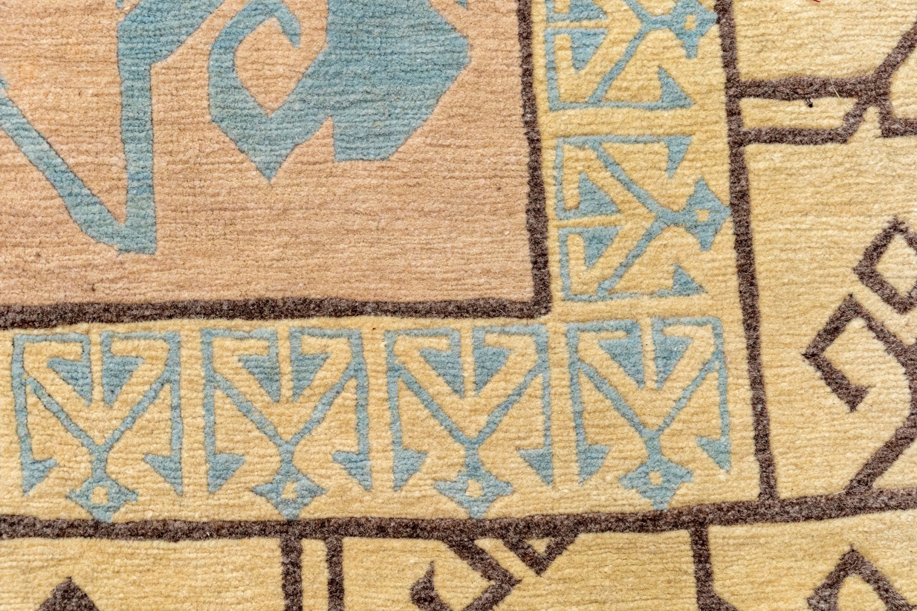 The carpet with central field with blue decoration over the warm ground with darker blue-black decoration over tan ground.