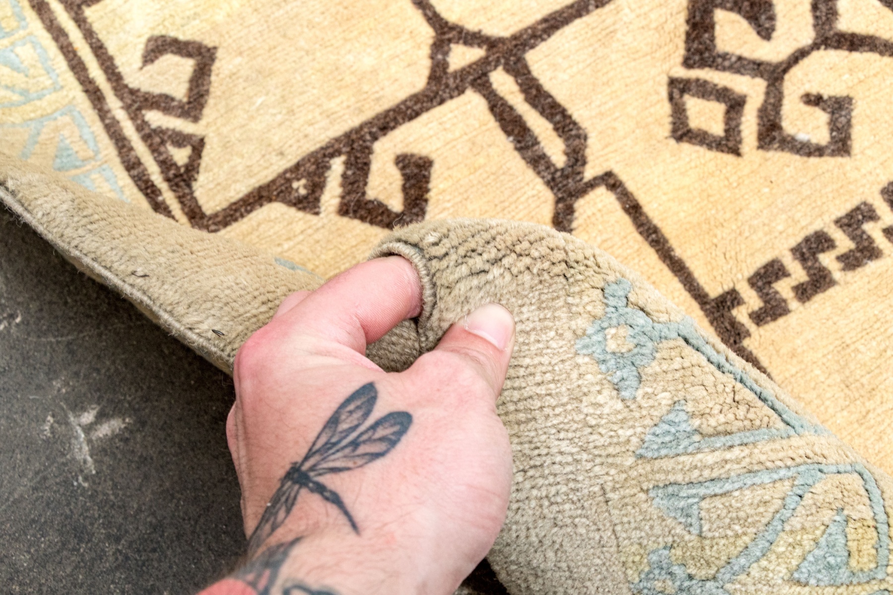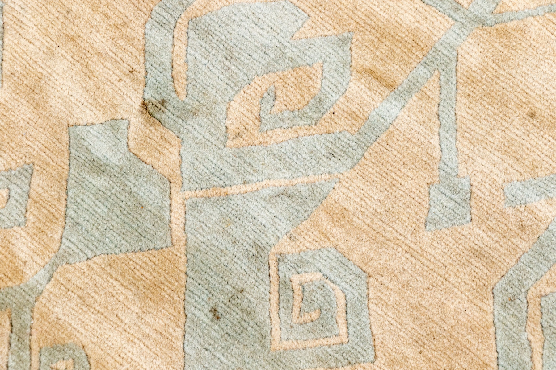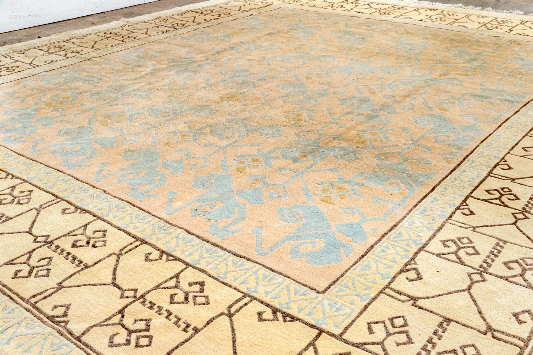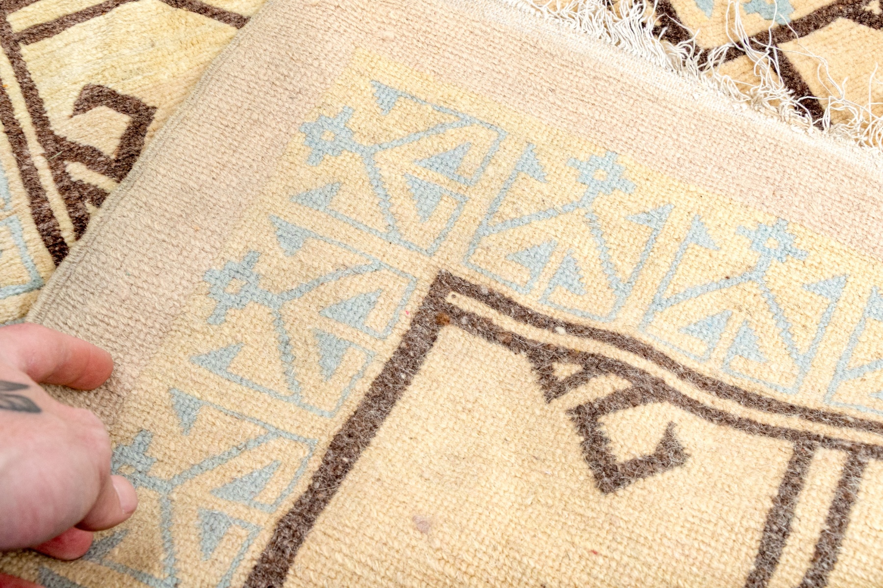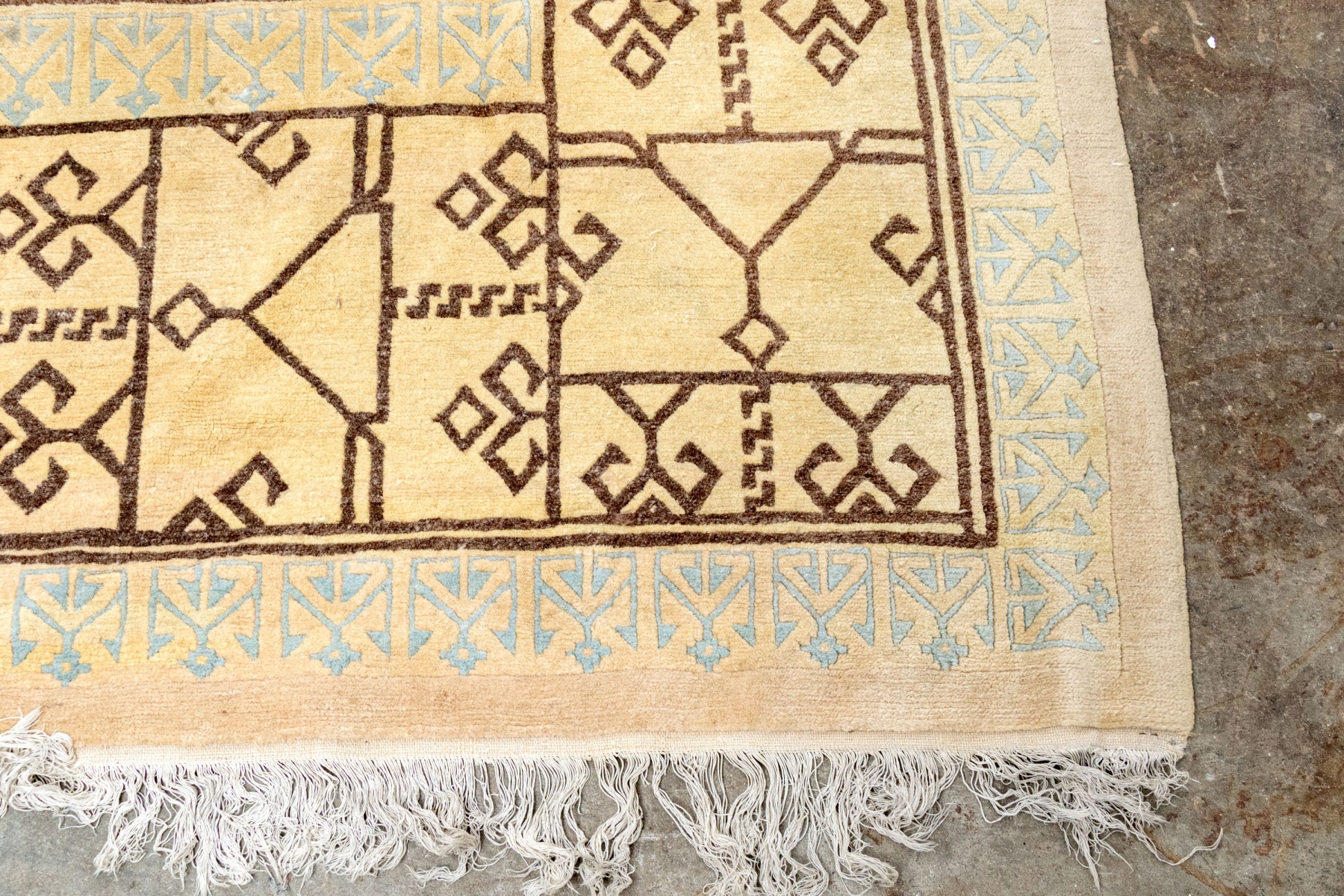 The carpet with central field with blue decoration over the warm ground with darker blue-black decoration over tan ground.