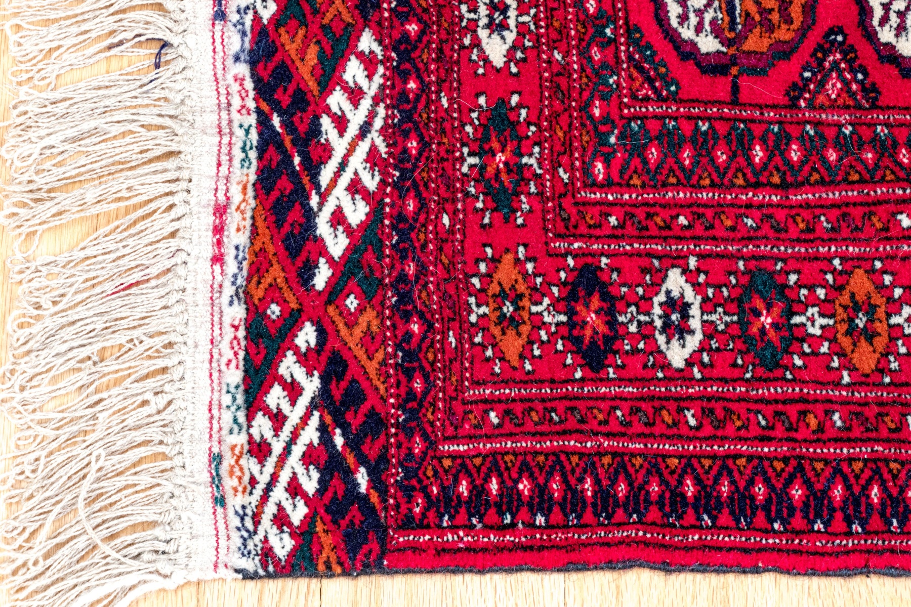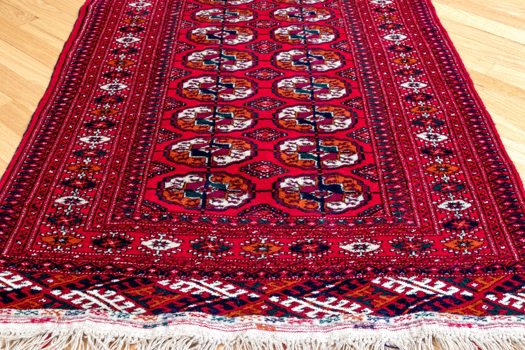 A delightful hand-knotted wool Bokhara accent rug in classic design, showcasing a main border of alternating black, red, and white oval motifs flanked by banded guard borers around a vibrant red field. The field is detailed with two rows of scalloped oval medallions in checkered orange and yellow surrounded black and red squared center motifs. Finished with fringe to two sides.