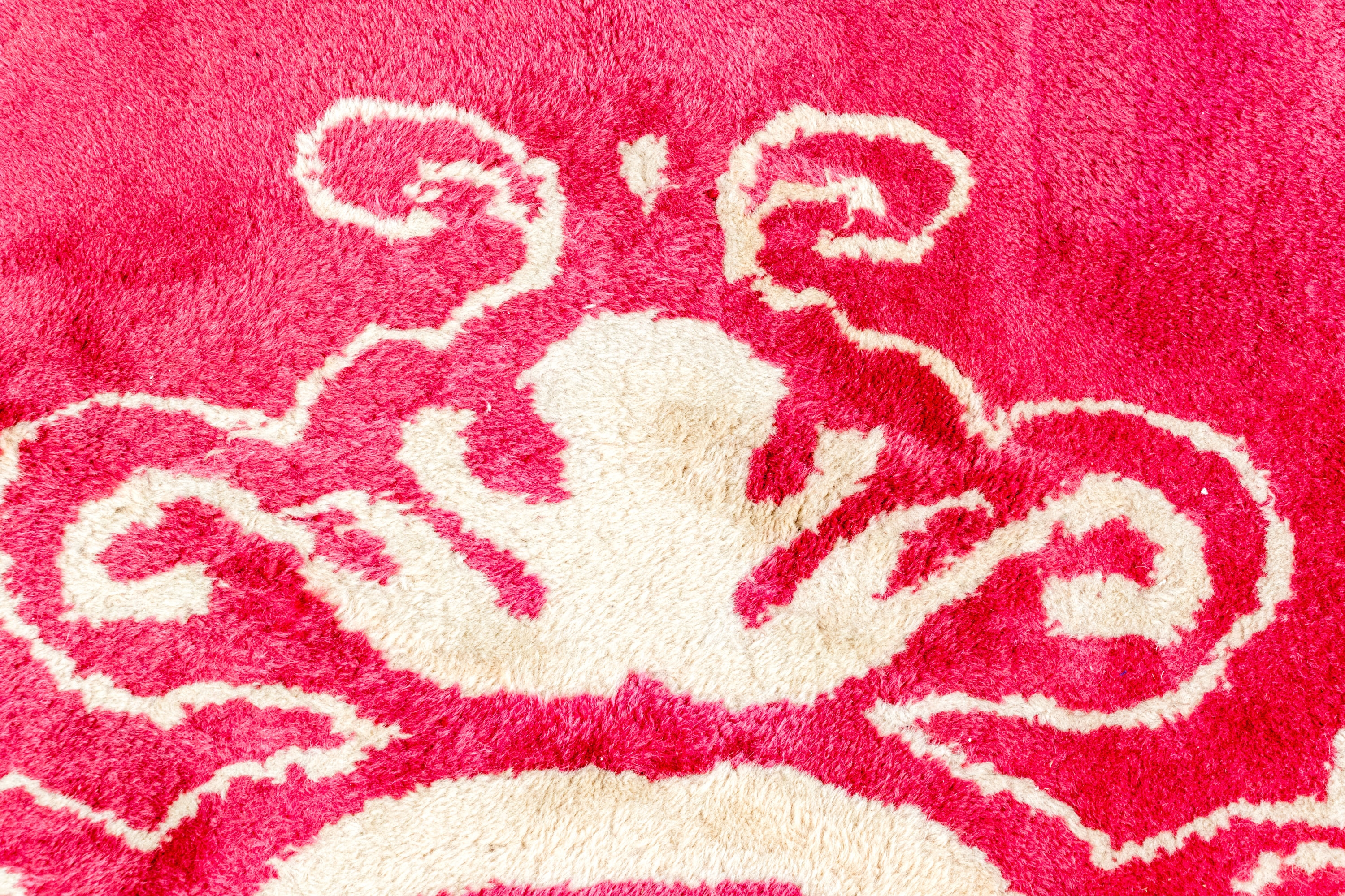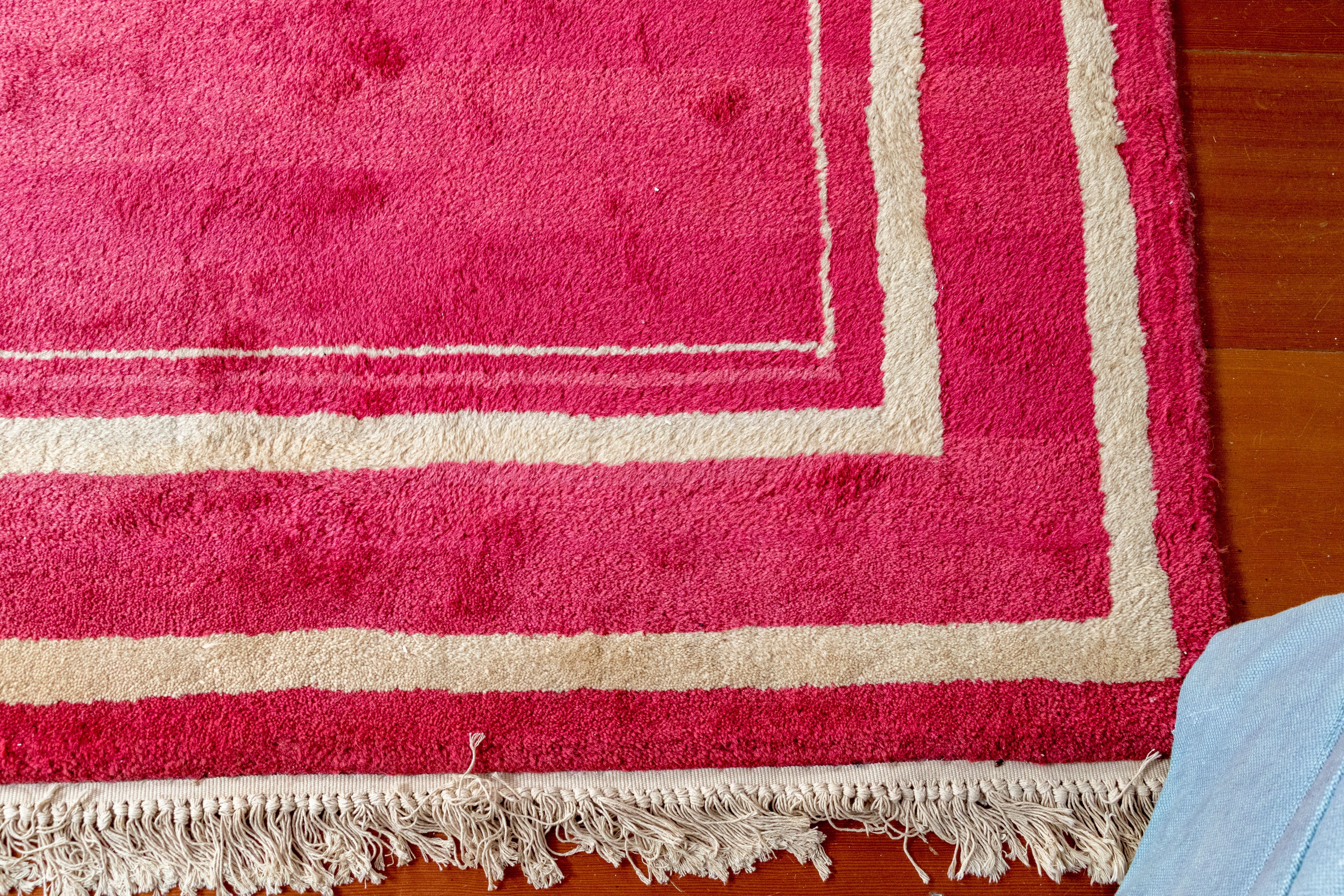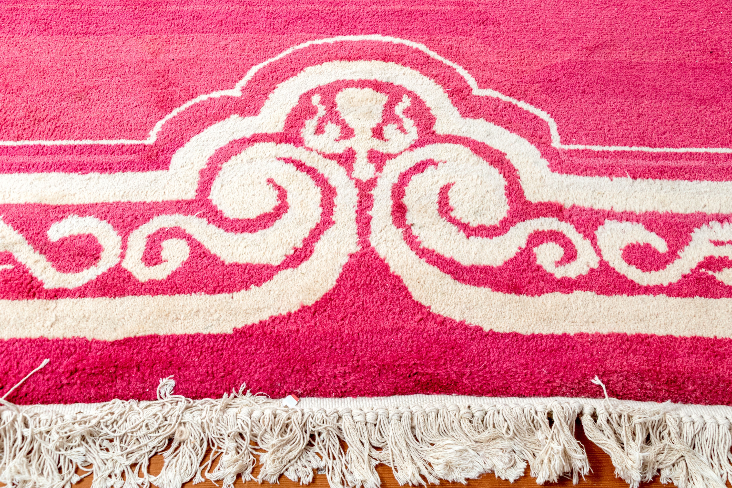 Pink-red hued ground with cream bands around the trim with highly decorative motifs to each long side at the middle and slightly smaller decorative motifs to the middle of either end.