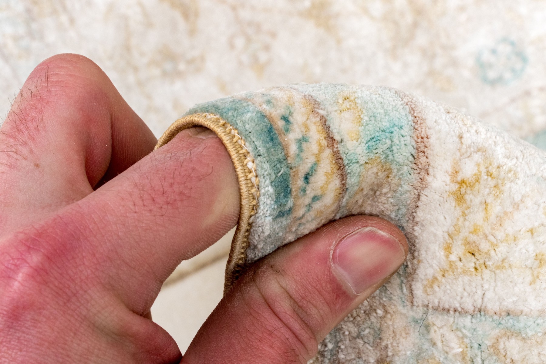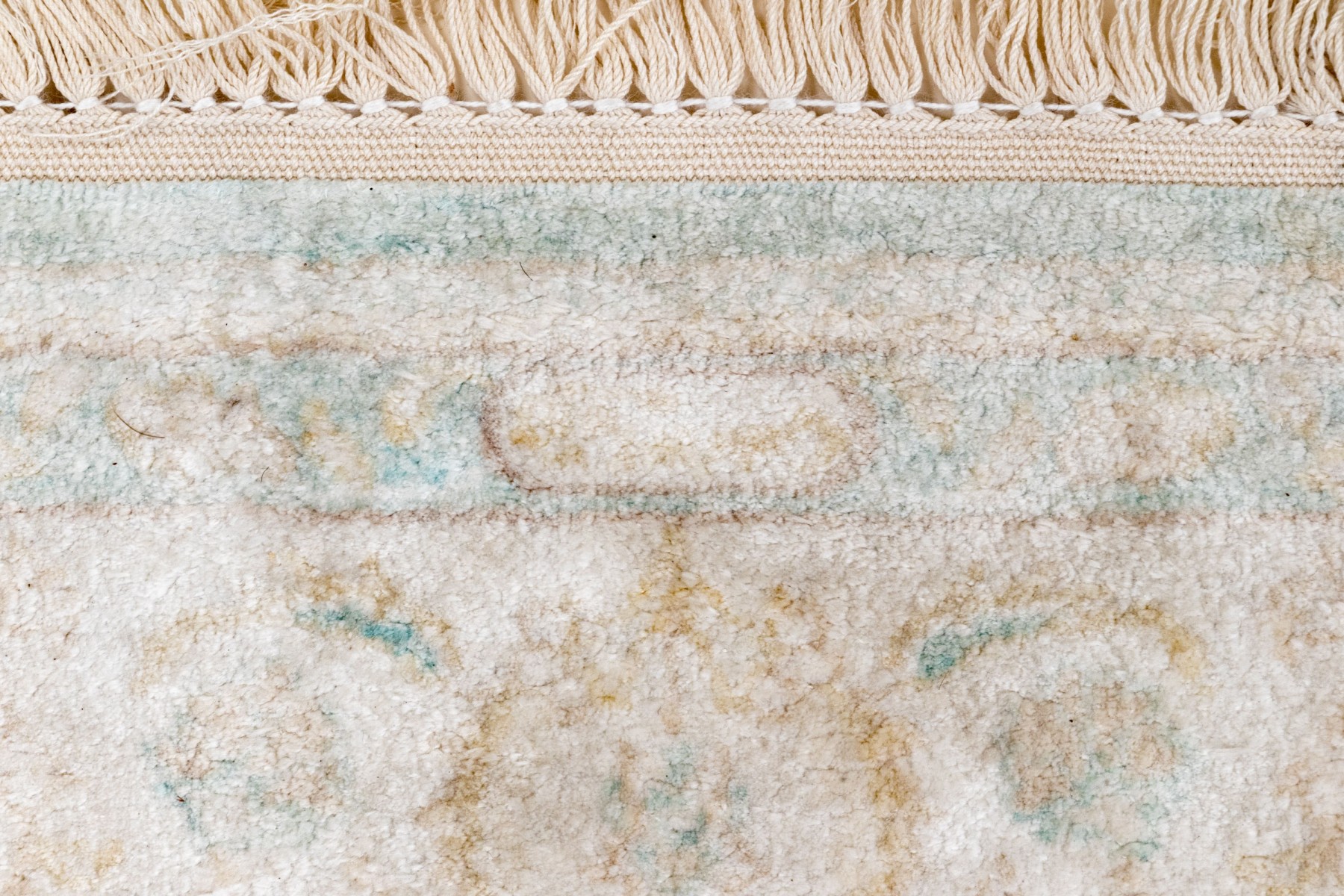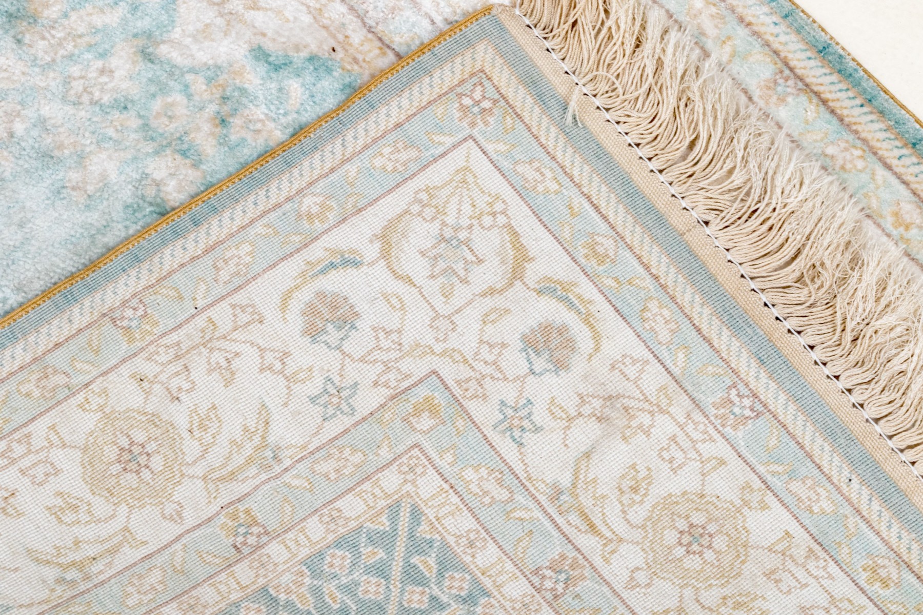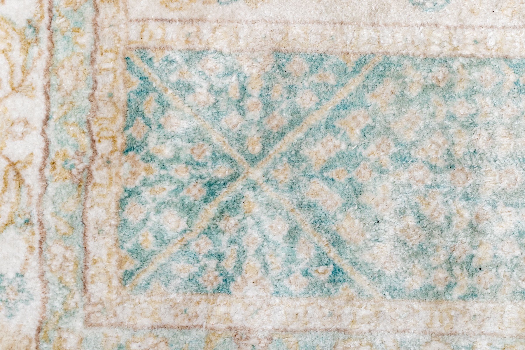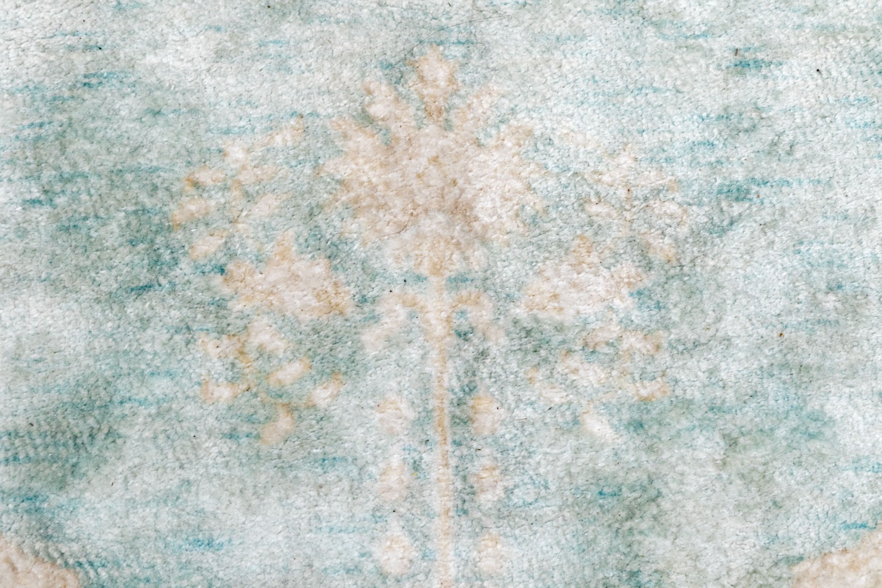 A gorgeous hand-knotted wool scatter rug designed with a white main border with large foliate motifs flanked by pale aqua guard borders around an aqua and white field. The field is designed with a scalloped arch motif to the right side leading to a rectangular aqua border to the left surrounded by elegant foliate details.