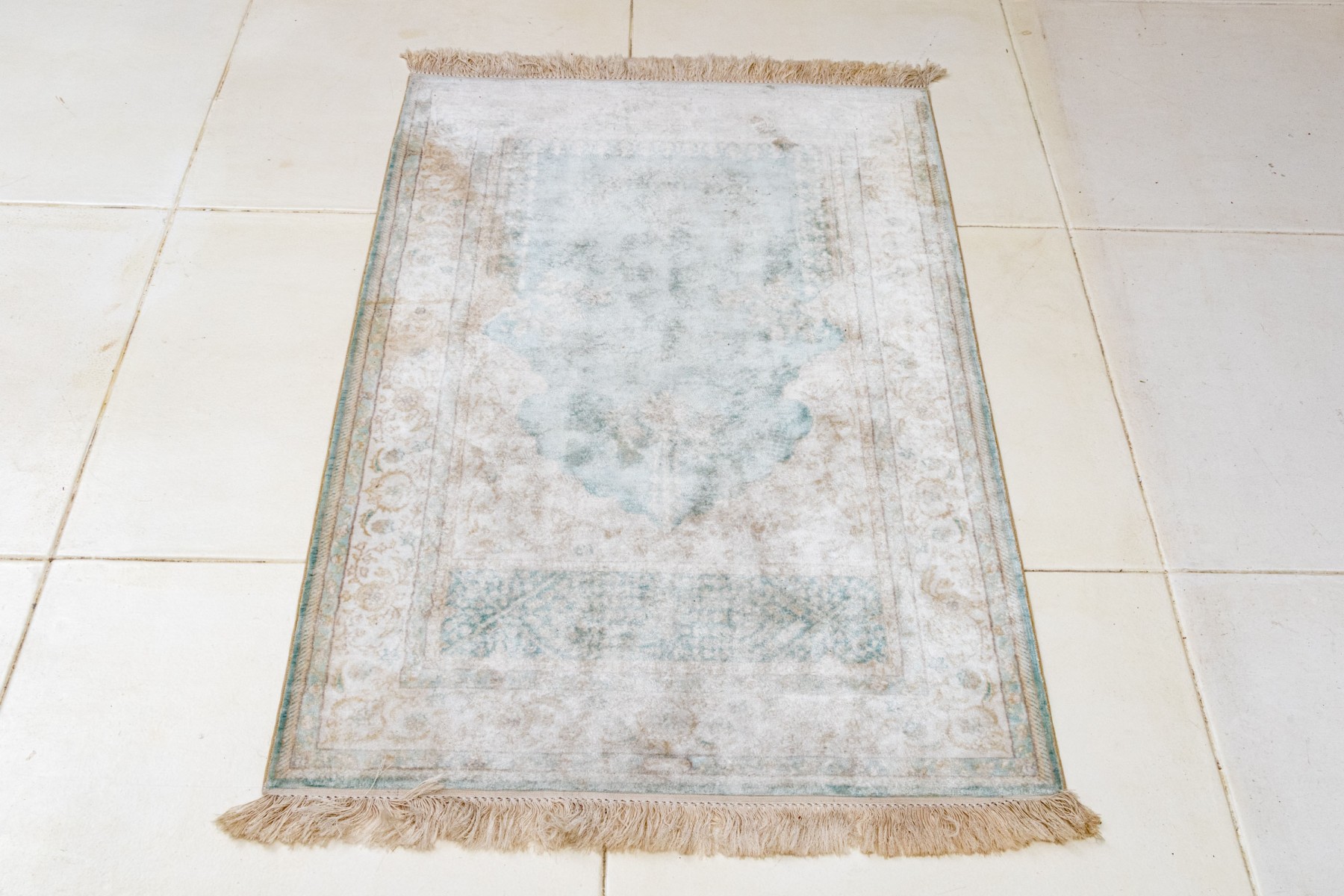 Residue and heavily faded hues, needs professional cleaning. Despite wear still a very pretty design.