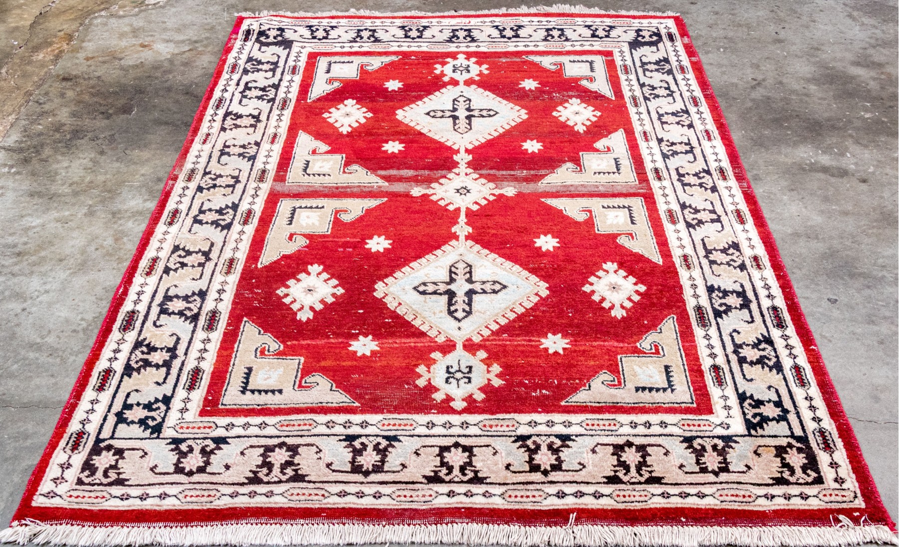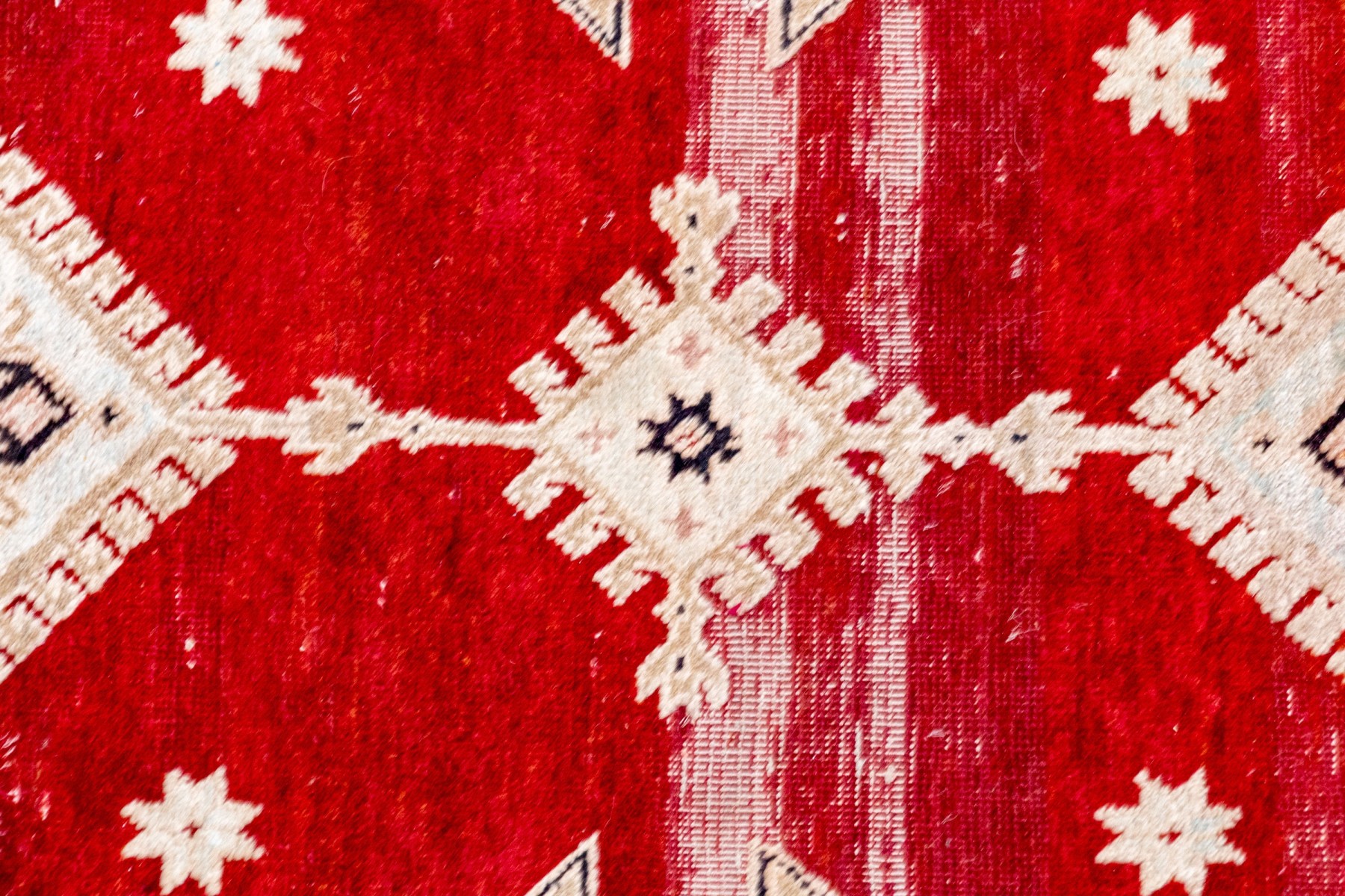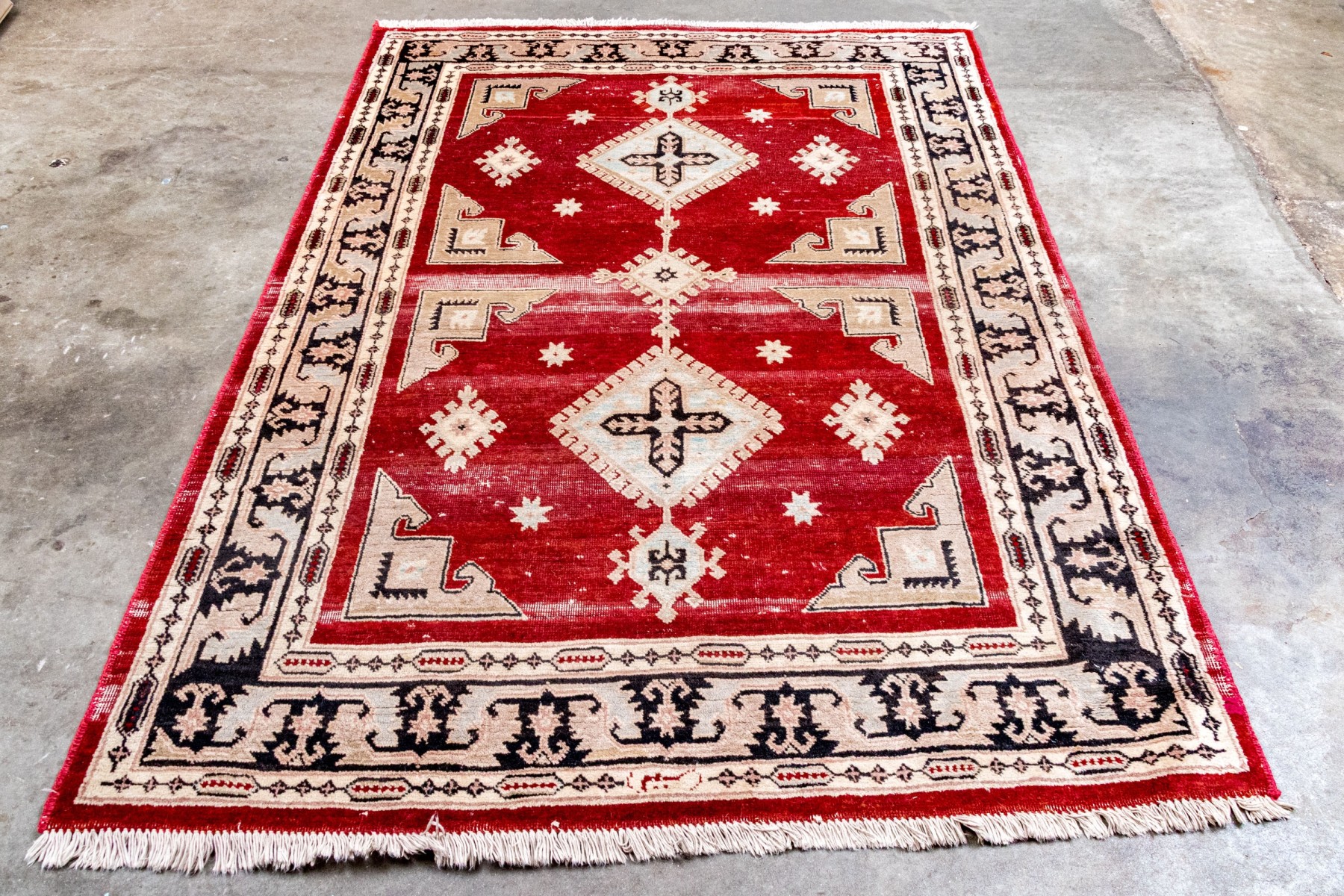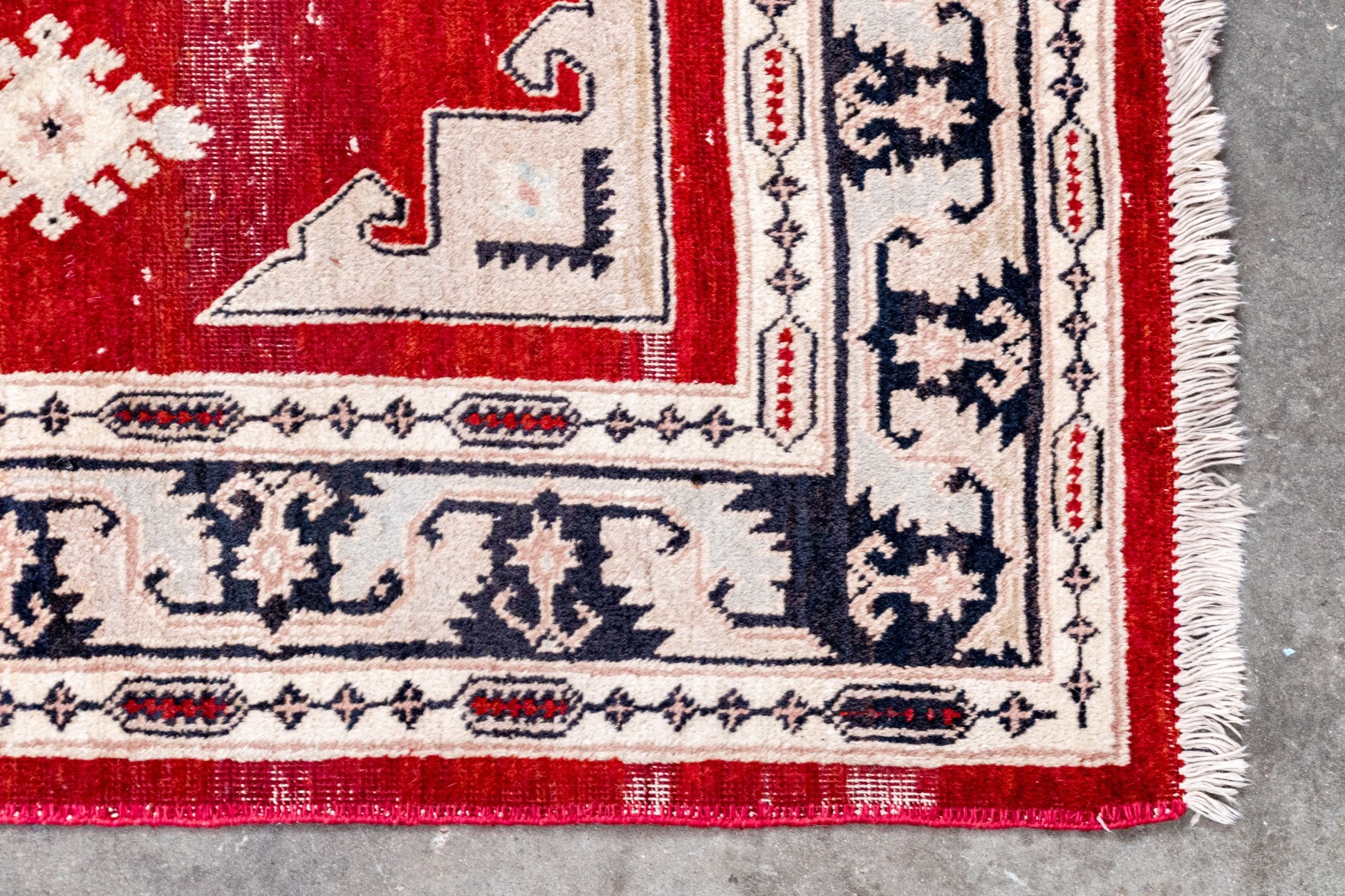 Central red grtound field with geometric decoration with decorative border guards on an ivory tone ground.
