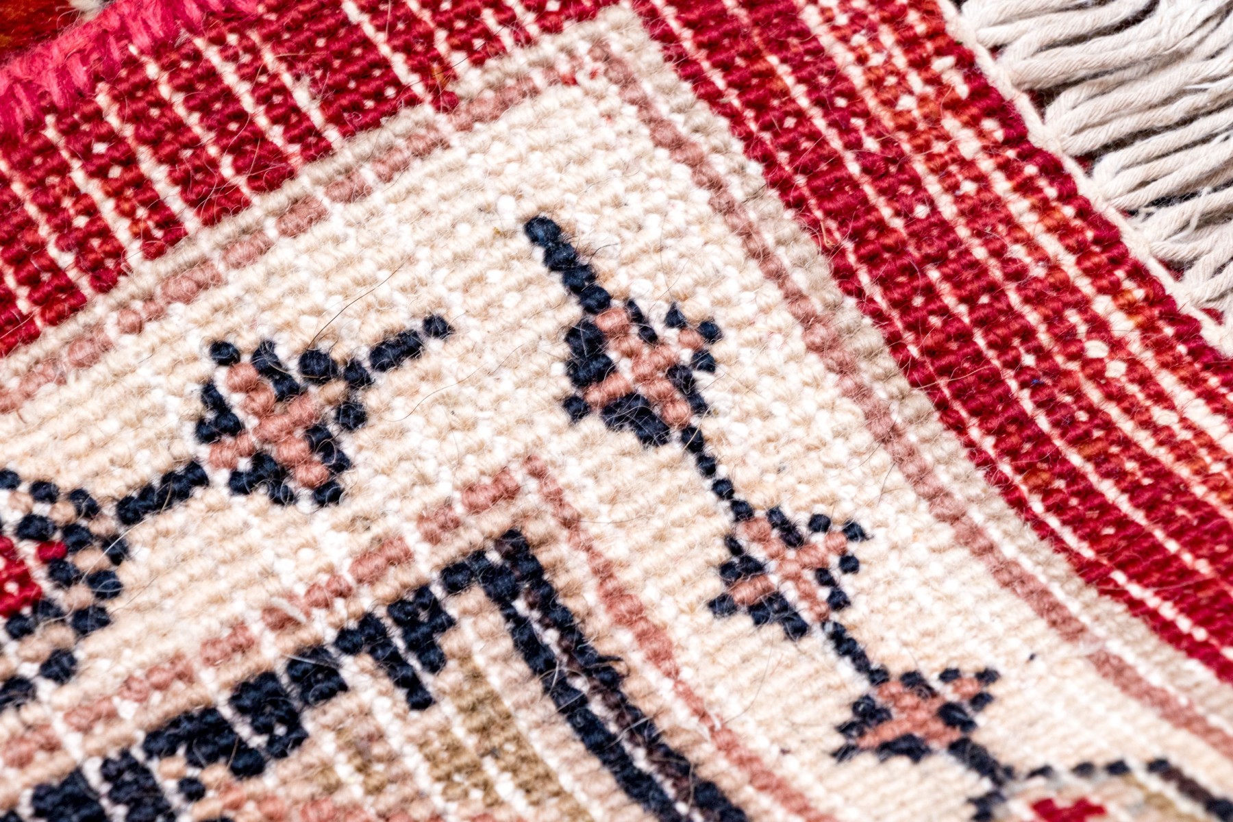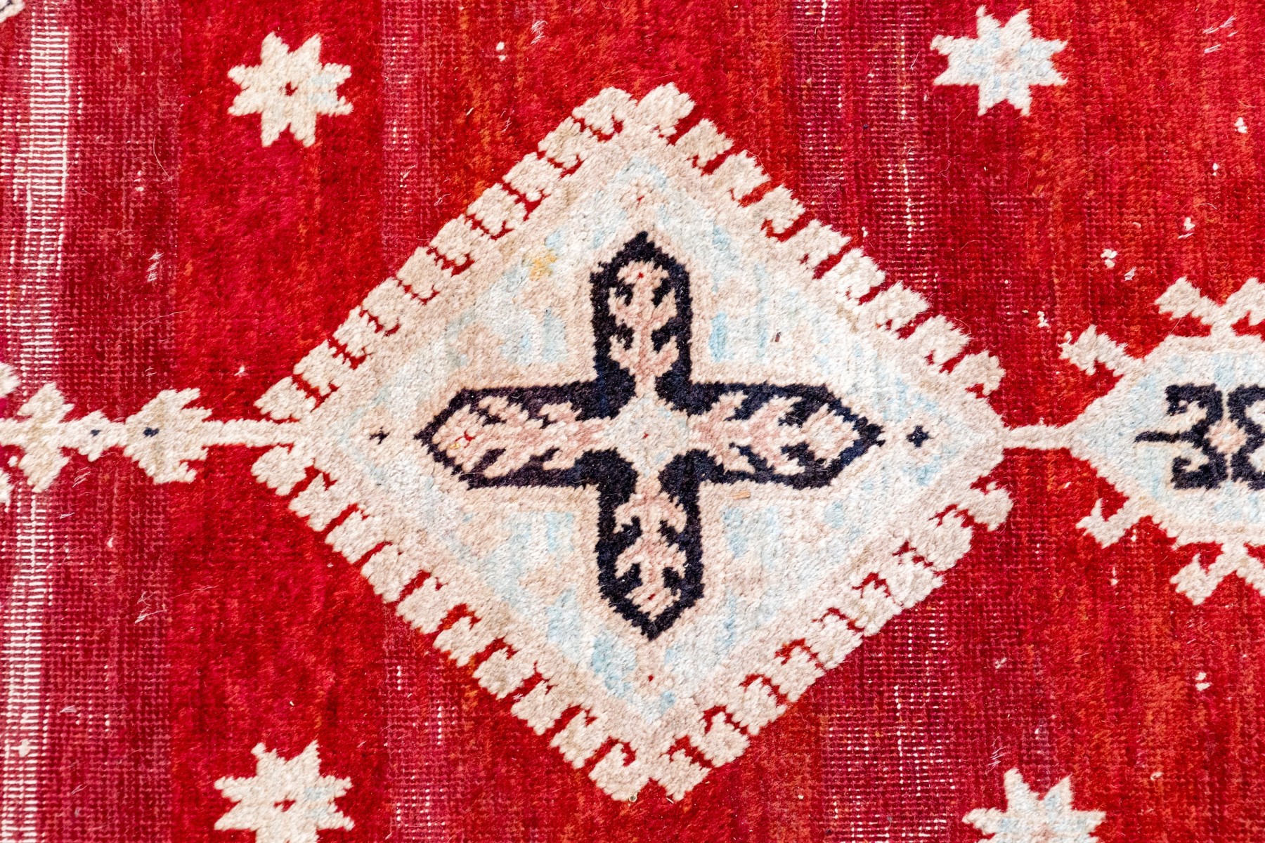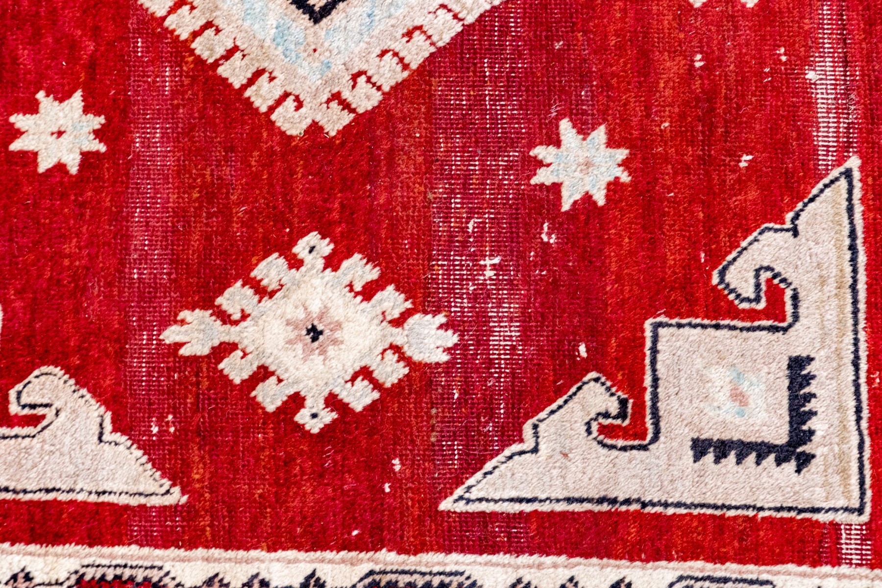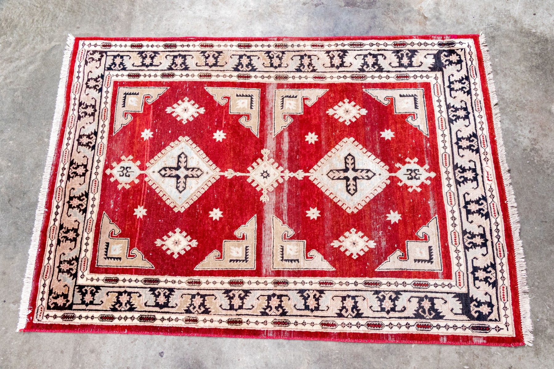 Central red grtound field with geometric decoration with decorative border guards on an ivory tone ground.