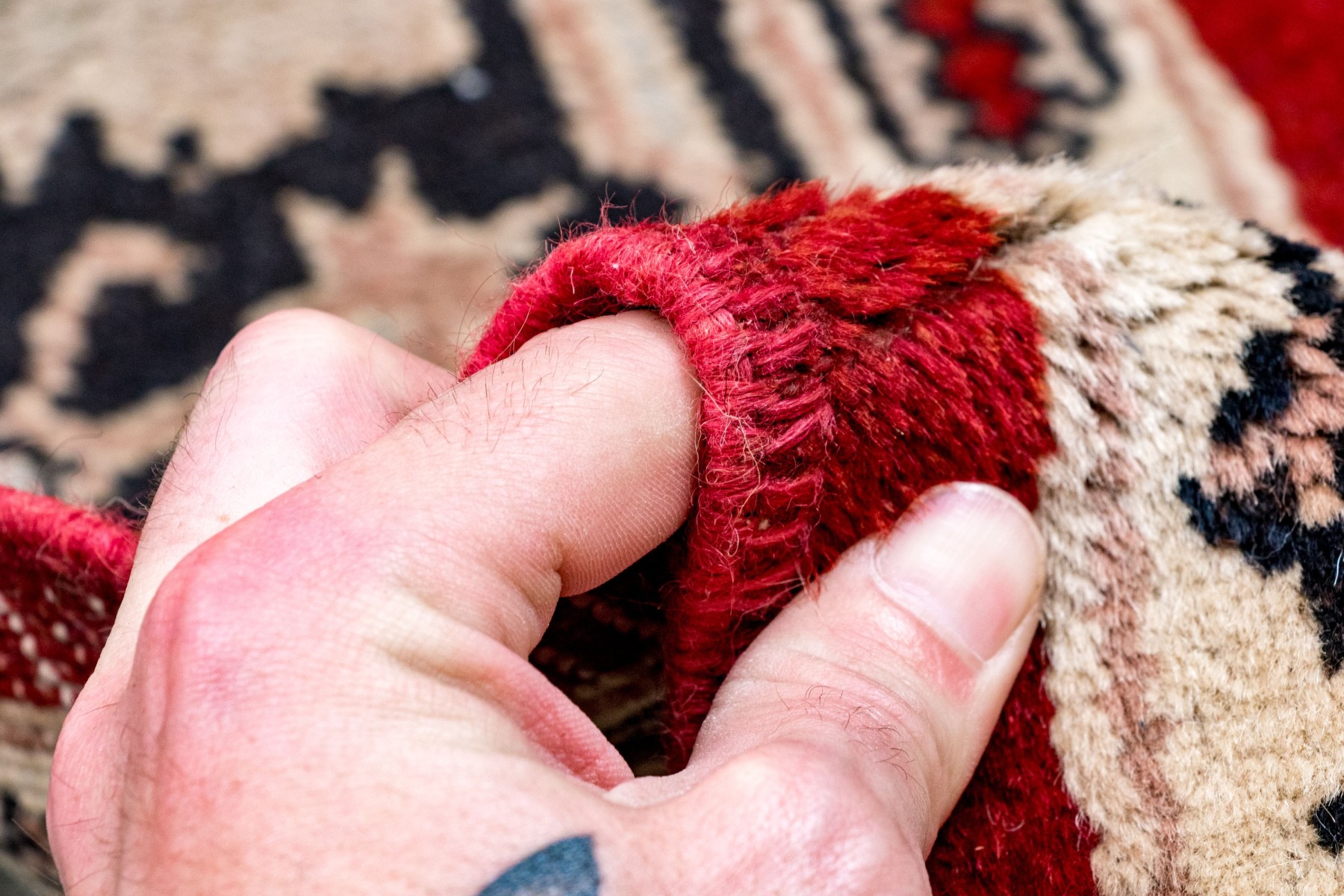 Good overall, wear includes bands of heavy wear to the pile with losses. There is aA central stripe down the center running width wise that appears to have more wear than the balance of the carpet and wear is most likely due to age and use but despite wear the carpet presents well.