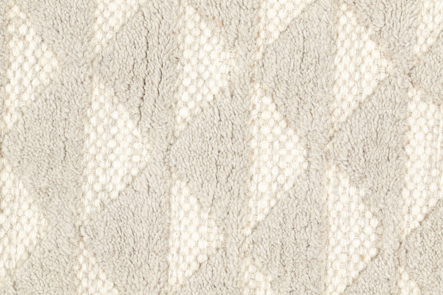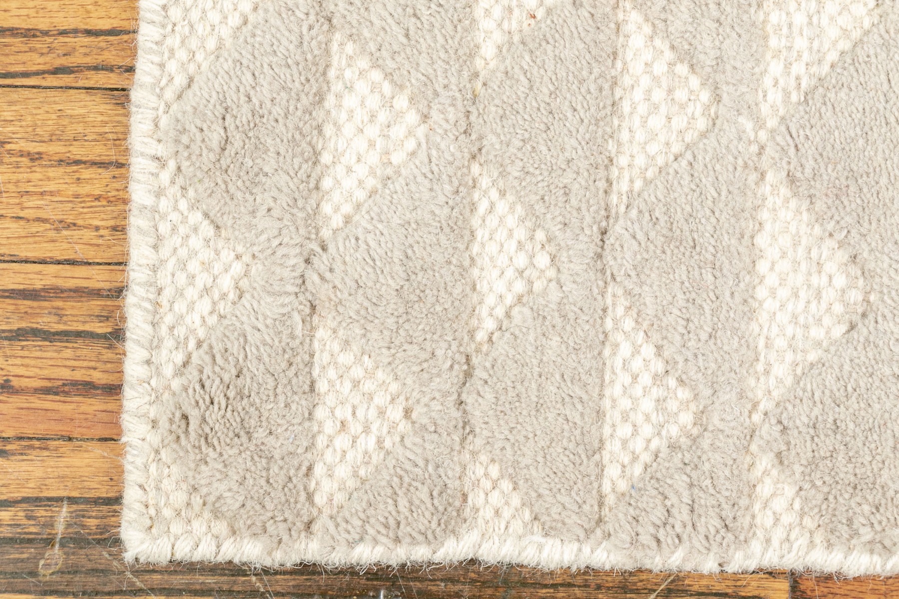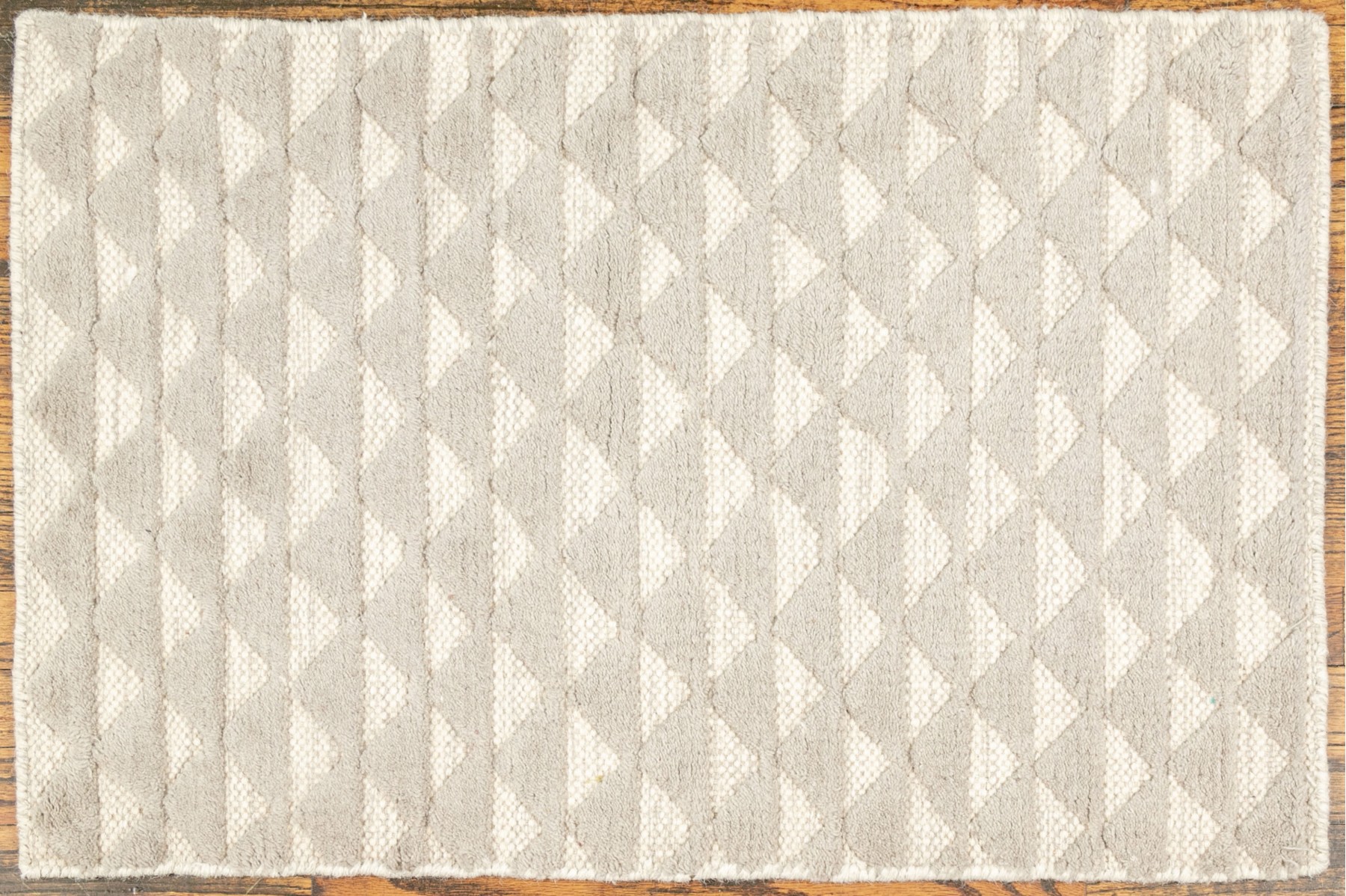 Hand knotted wool carpet mat with hi and low pile with a diamond motif. Overcast edges.
