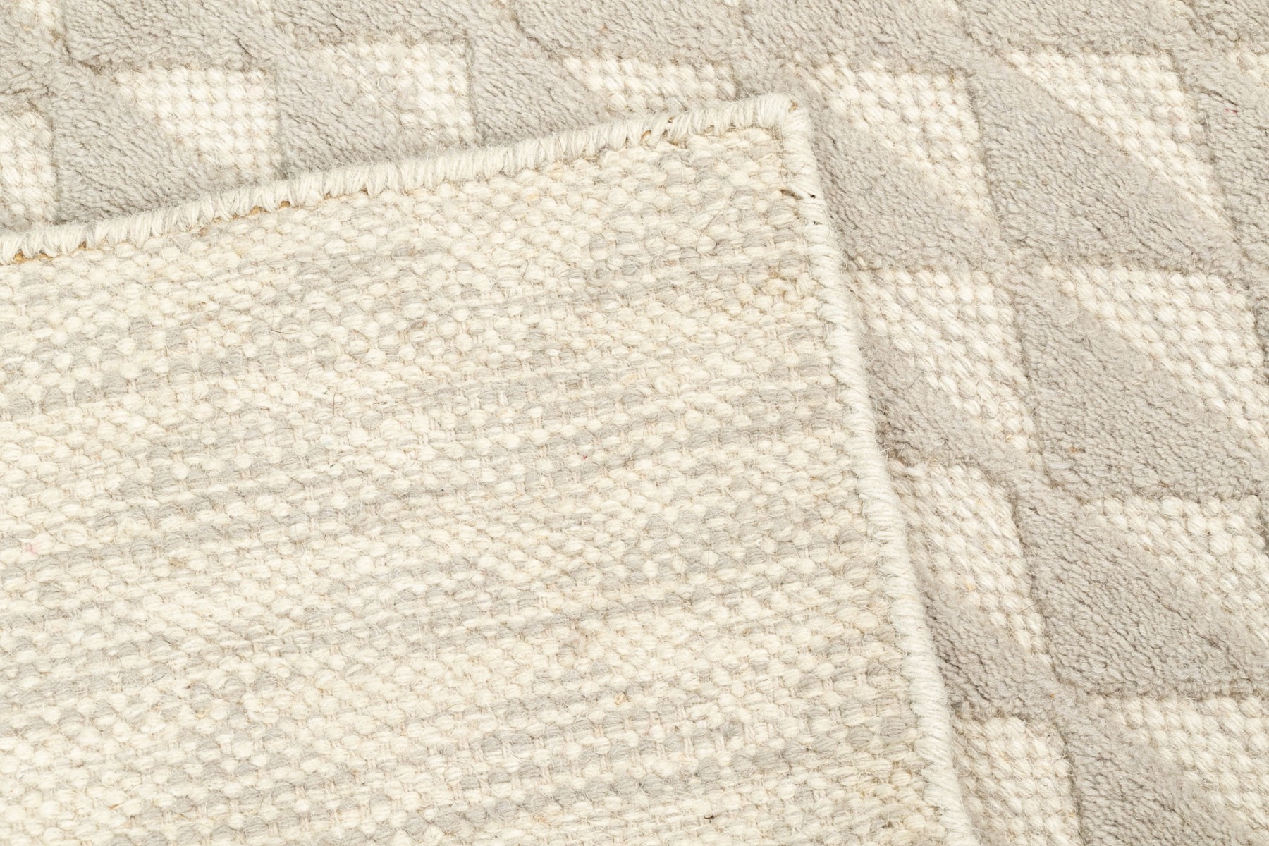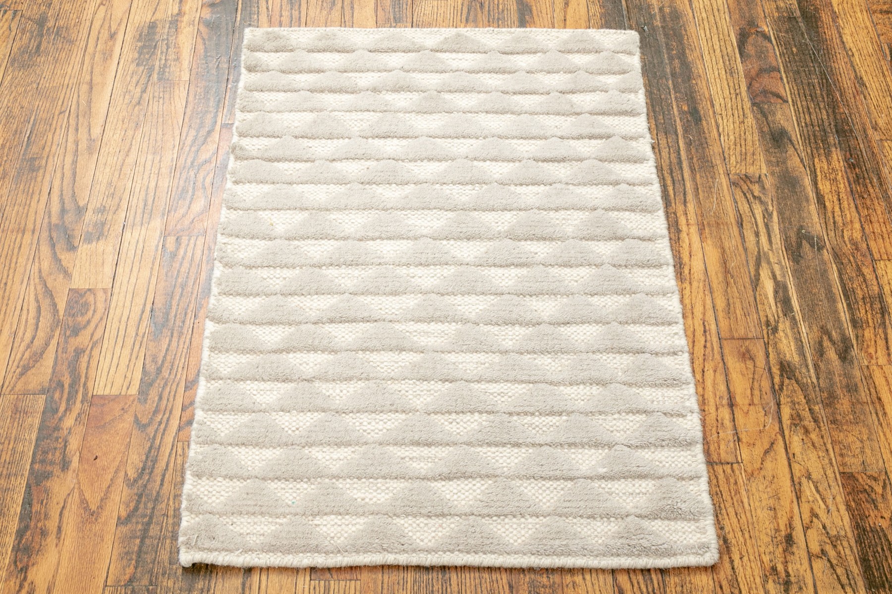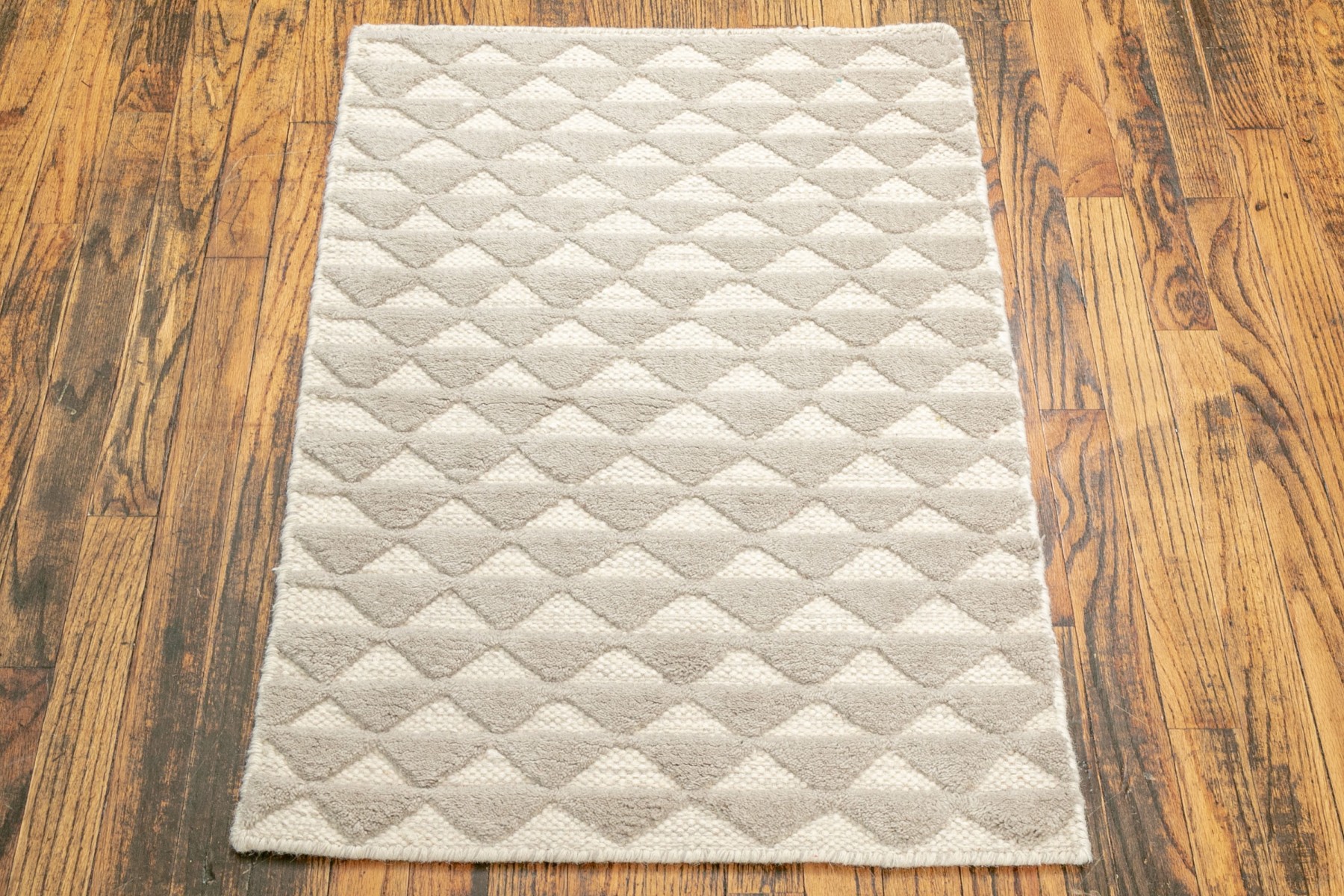 Hand knotted wool carpet mat with hi and low pile with a diamond motif. Overcast edges.