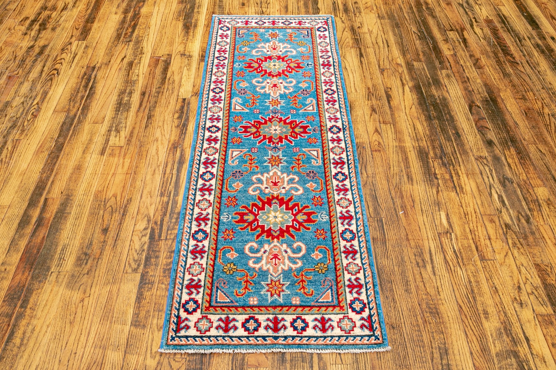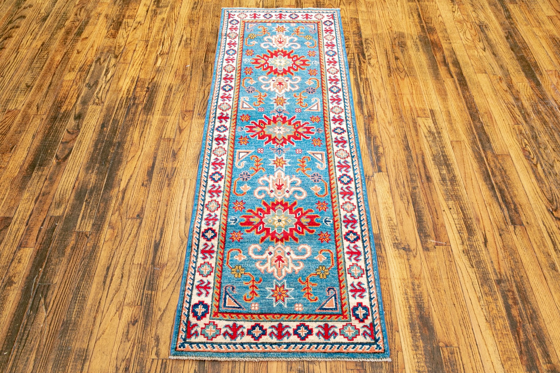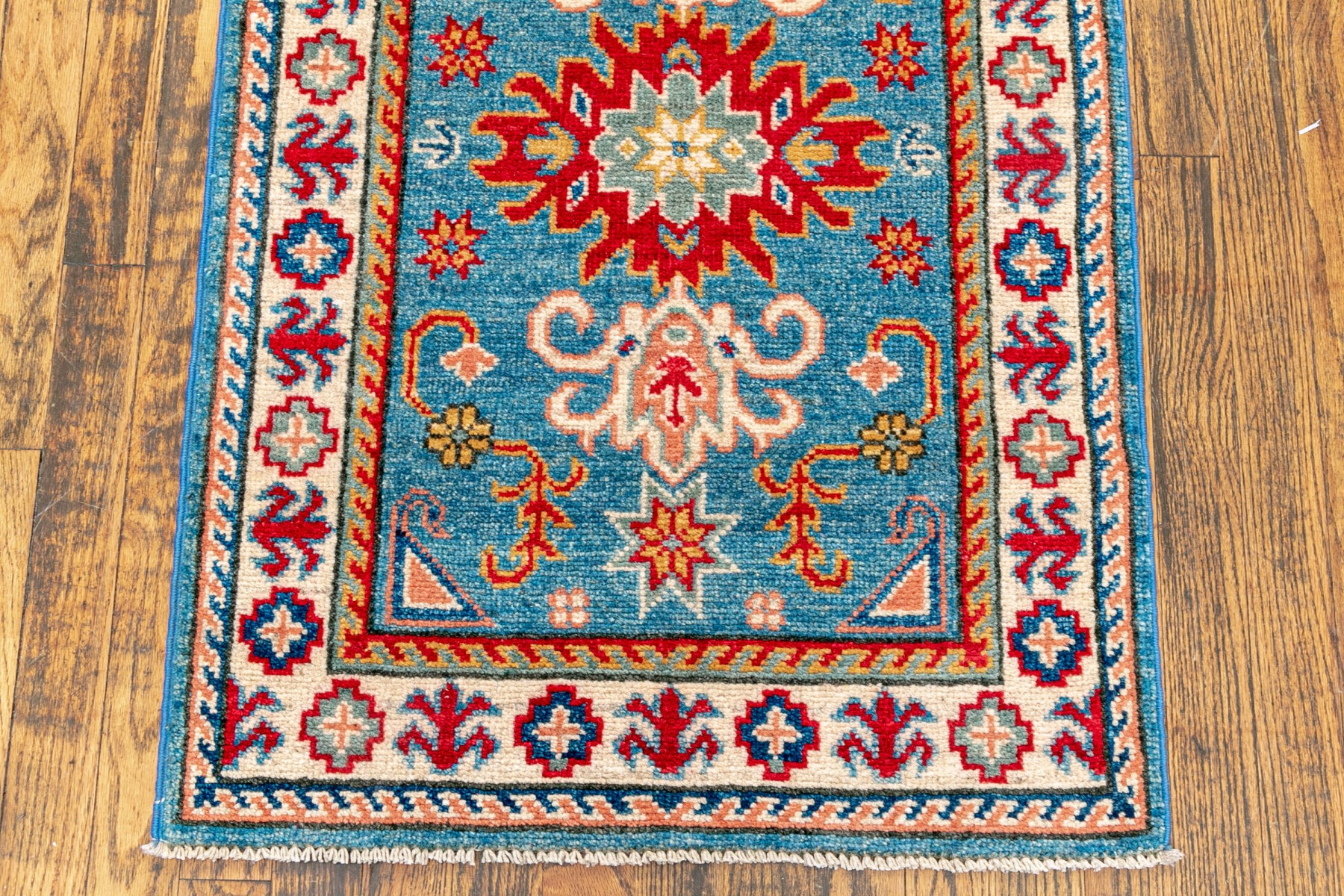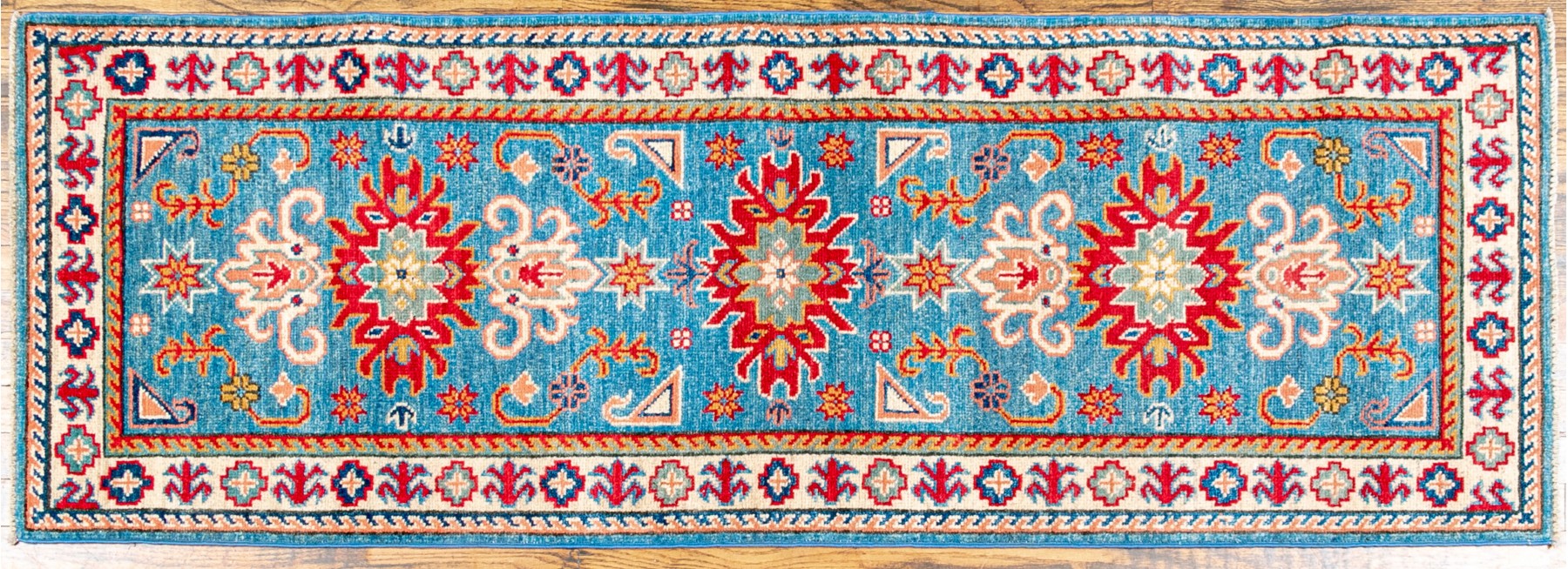 Hand knotted wool carpet runner with red and white stylized flowers, trailing vine with flowers and florets on a blue ground. The guard with alternating and repetitive abstract motifs flanked by geometric bands, blue trim, short fringe.