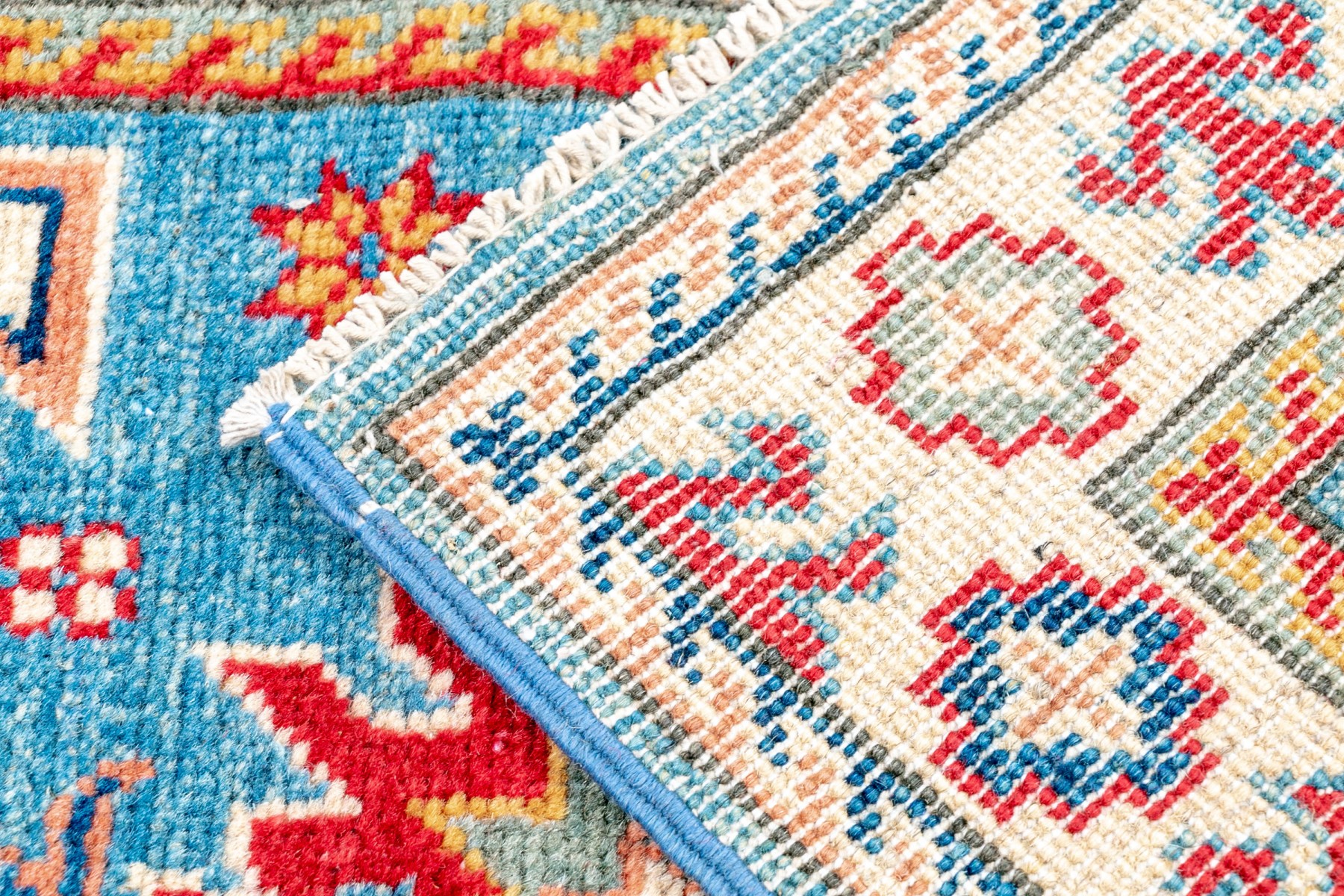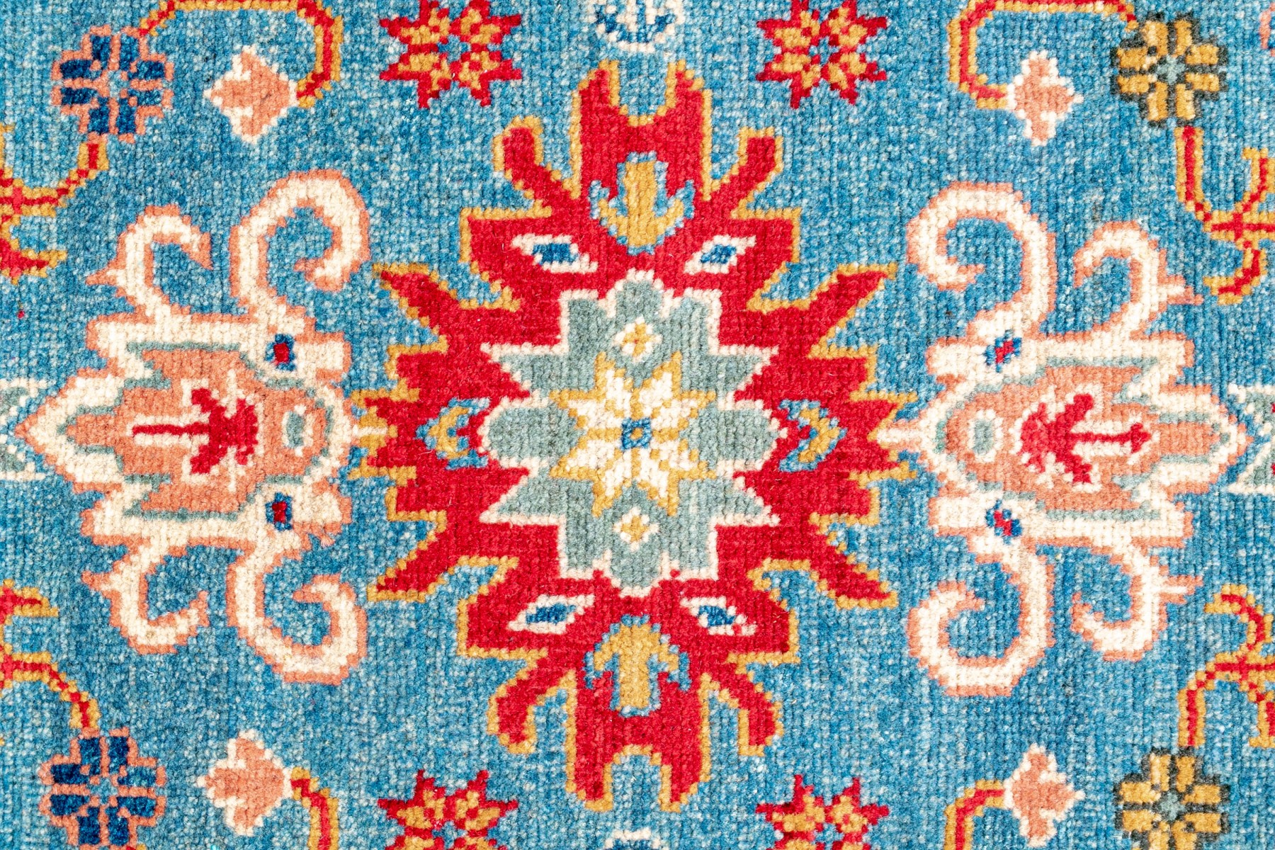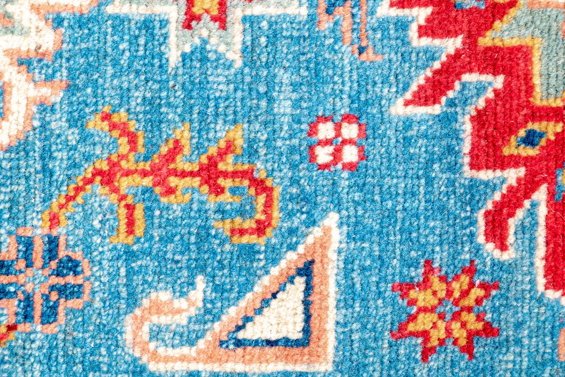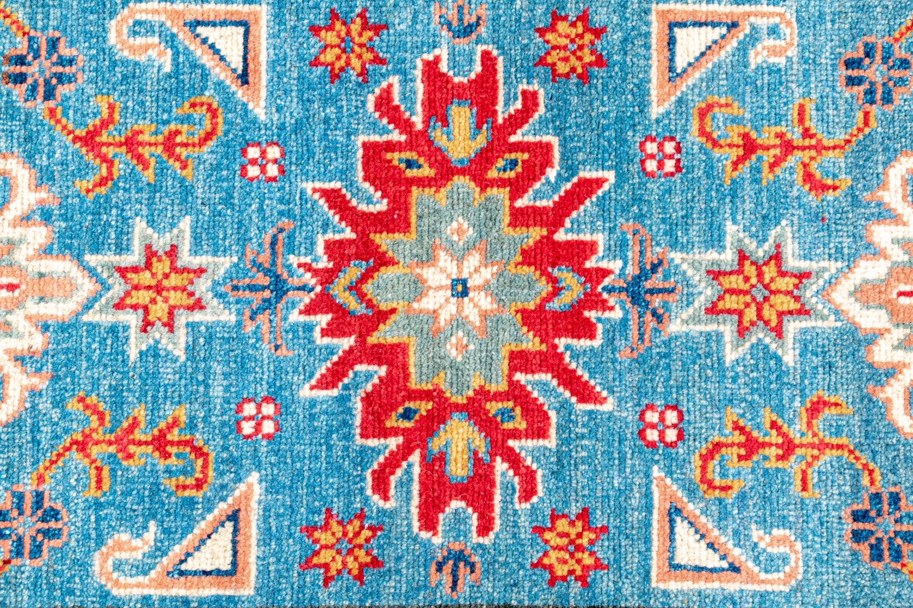 Hand knotted wool carpet runner with red and white stylized flowers, trailing vine with flowers and florets on a blue ground. The guard with alternating and repetitive abstract motifs flanked by geometric bands, blue trim, short fringe.