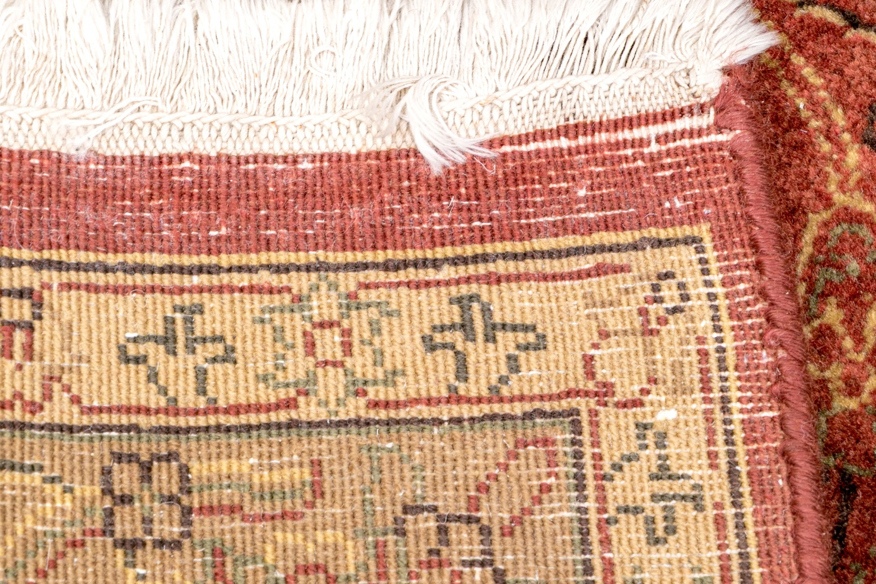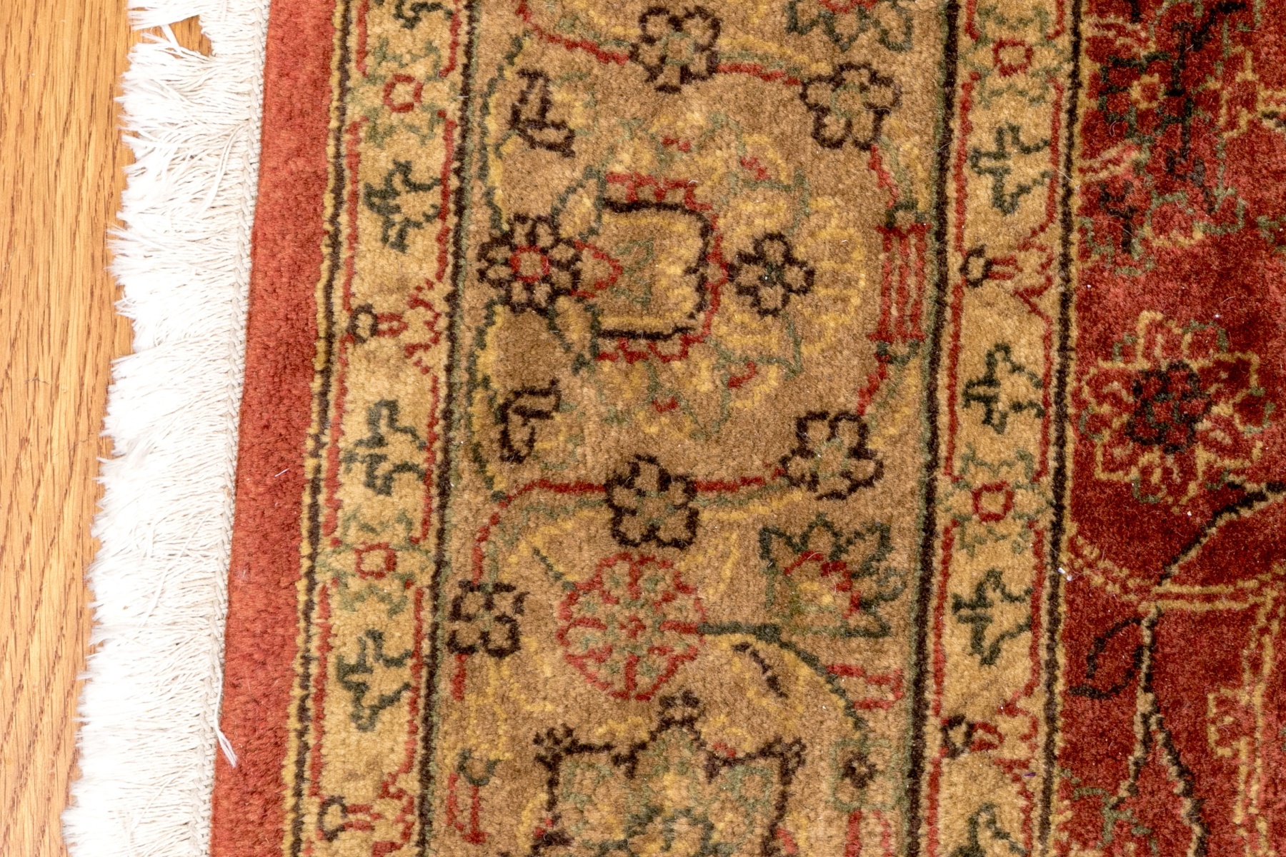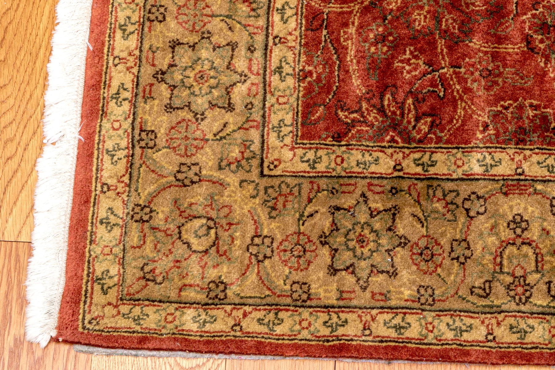 A fabulous Indian hand-knotted wool accent rug showcasing a wide olive hued main border of vining florals flanked by ecru guard borders around a red field. The field is detailed with a symmetrical arrangement of vining floral medallions in subtle colors for a timeless and sophisticated design.