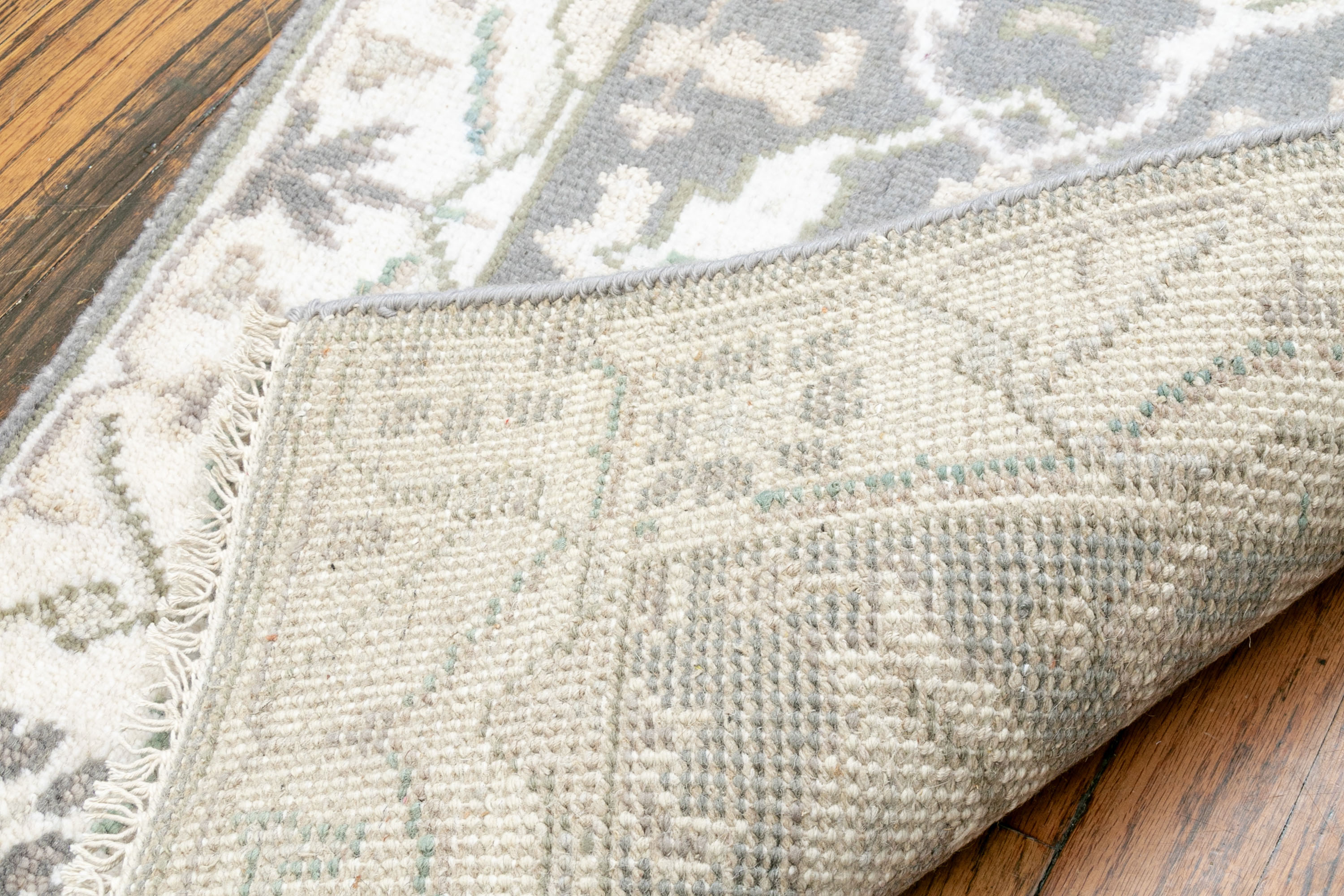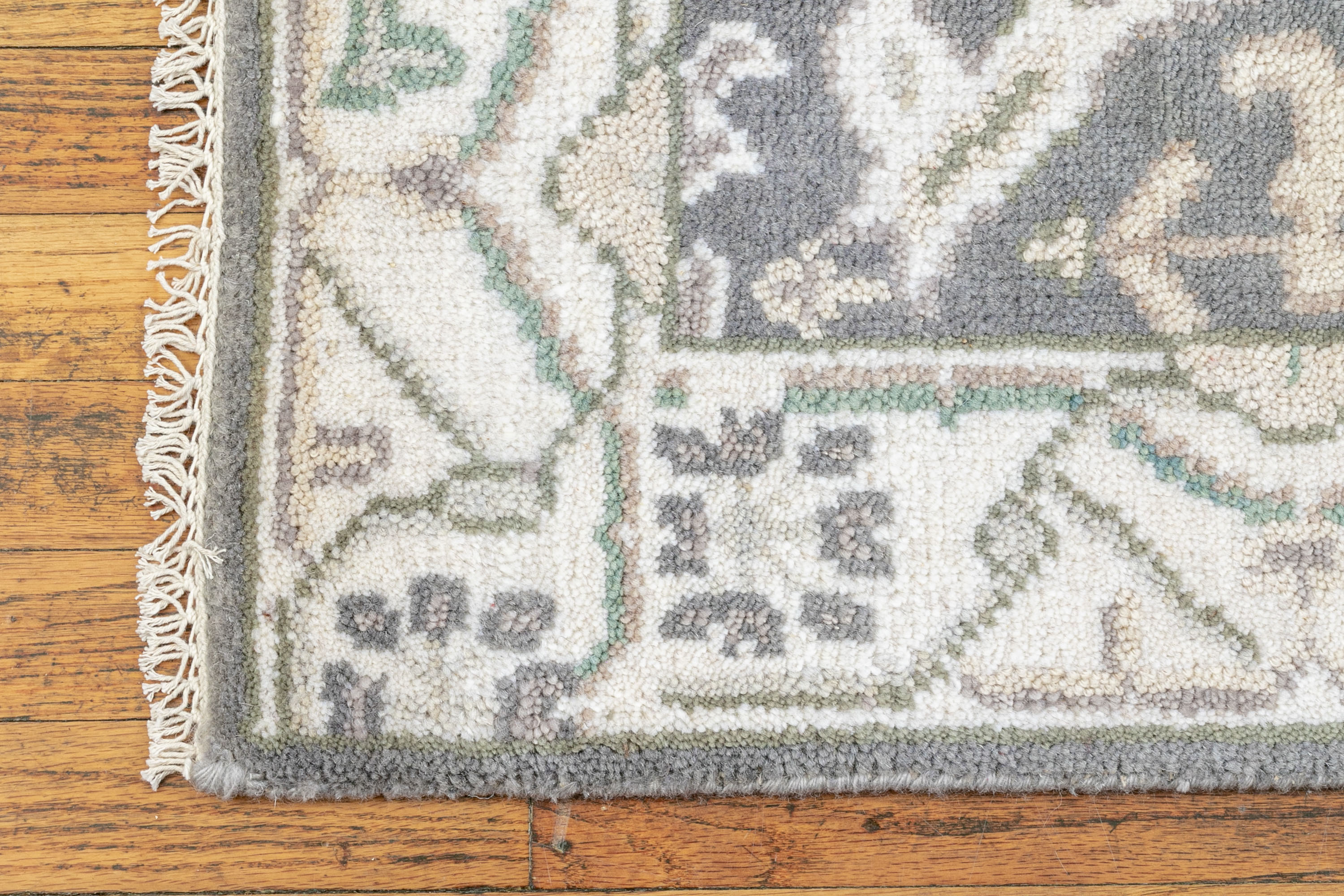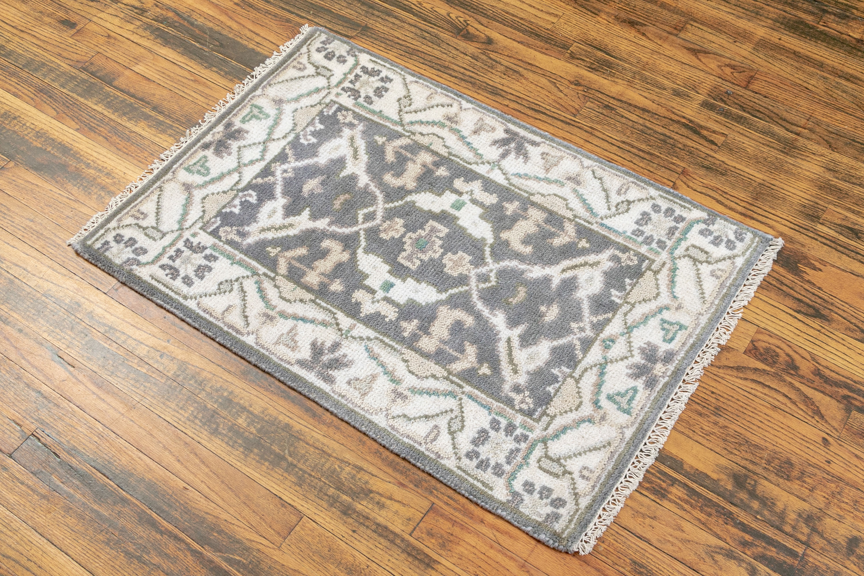 A beautiful hand-knotted Indian Oushak wool scatter rug sporting a wide white main border with fine vines, flanked by narrow olive-gray guard borders around a gray-purple field. The field is detailed with a fine lined symmetrical arrangement of openwork medallions in white, green, oatmeal, and gray-mauve.