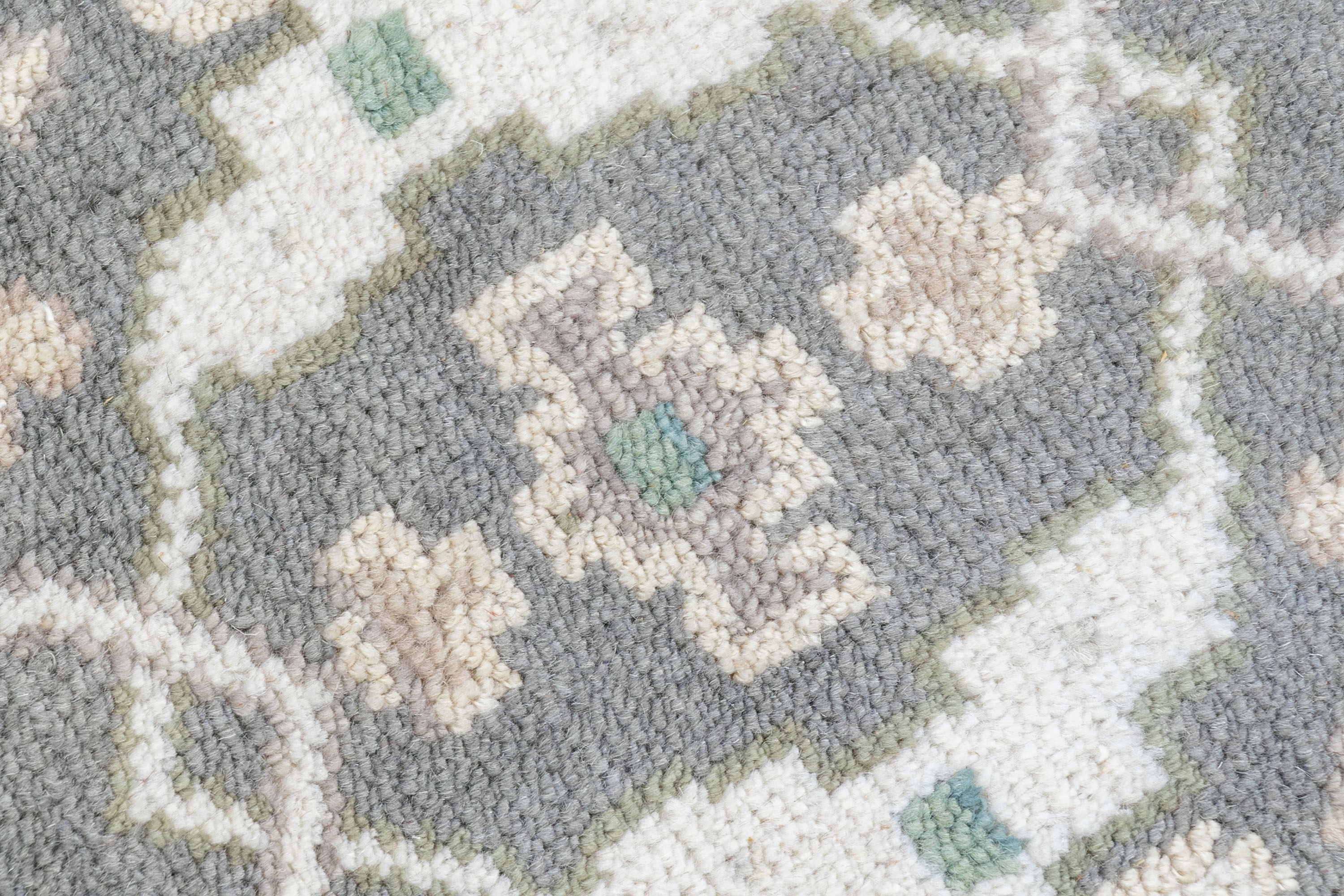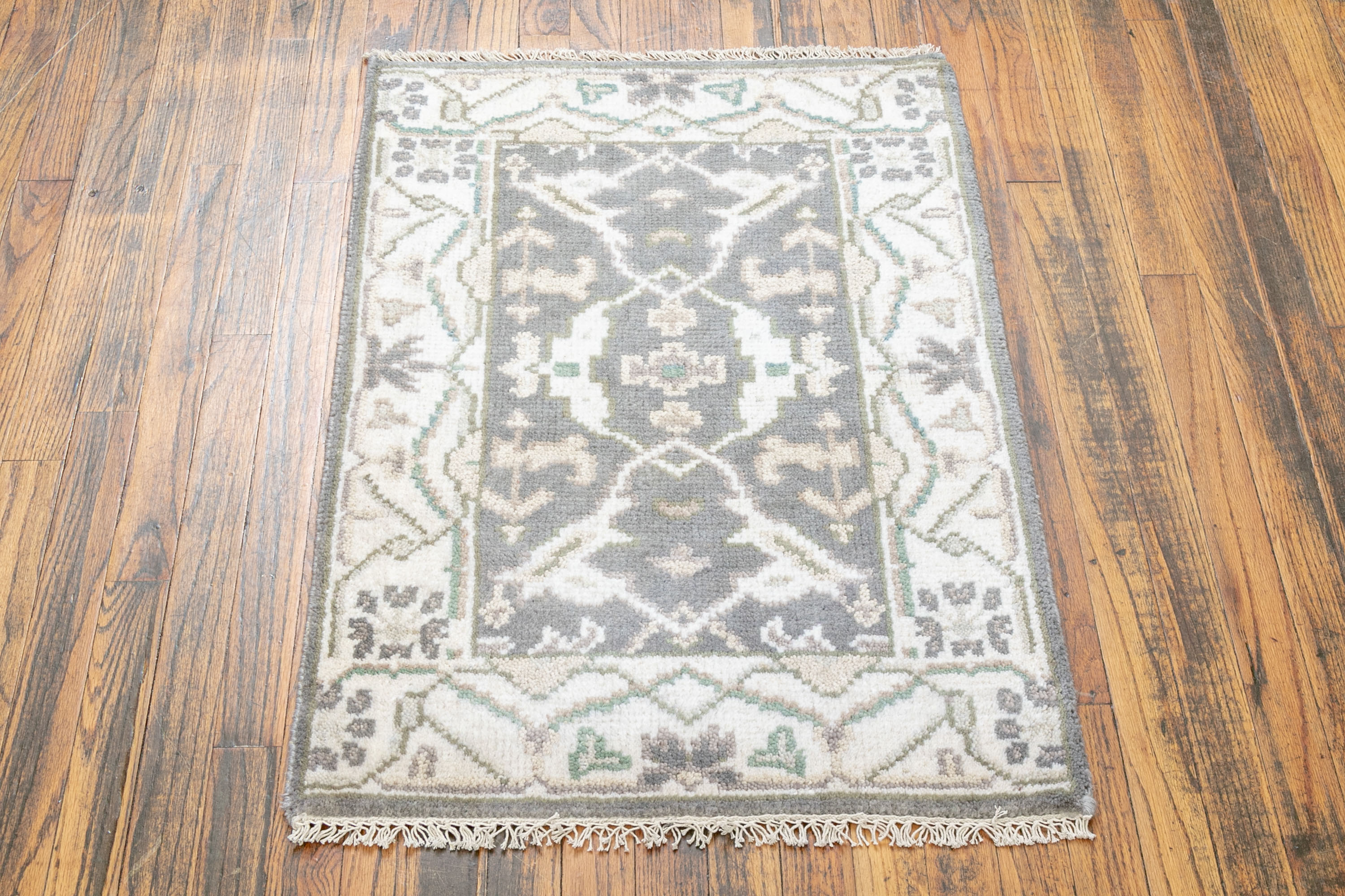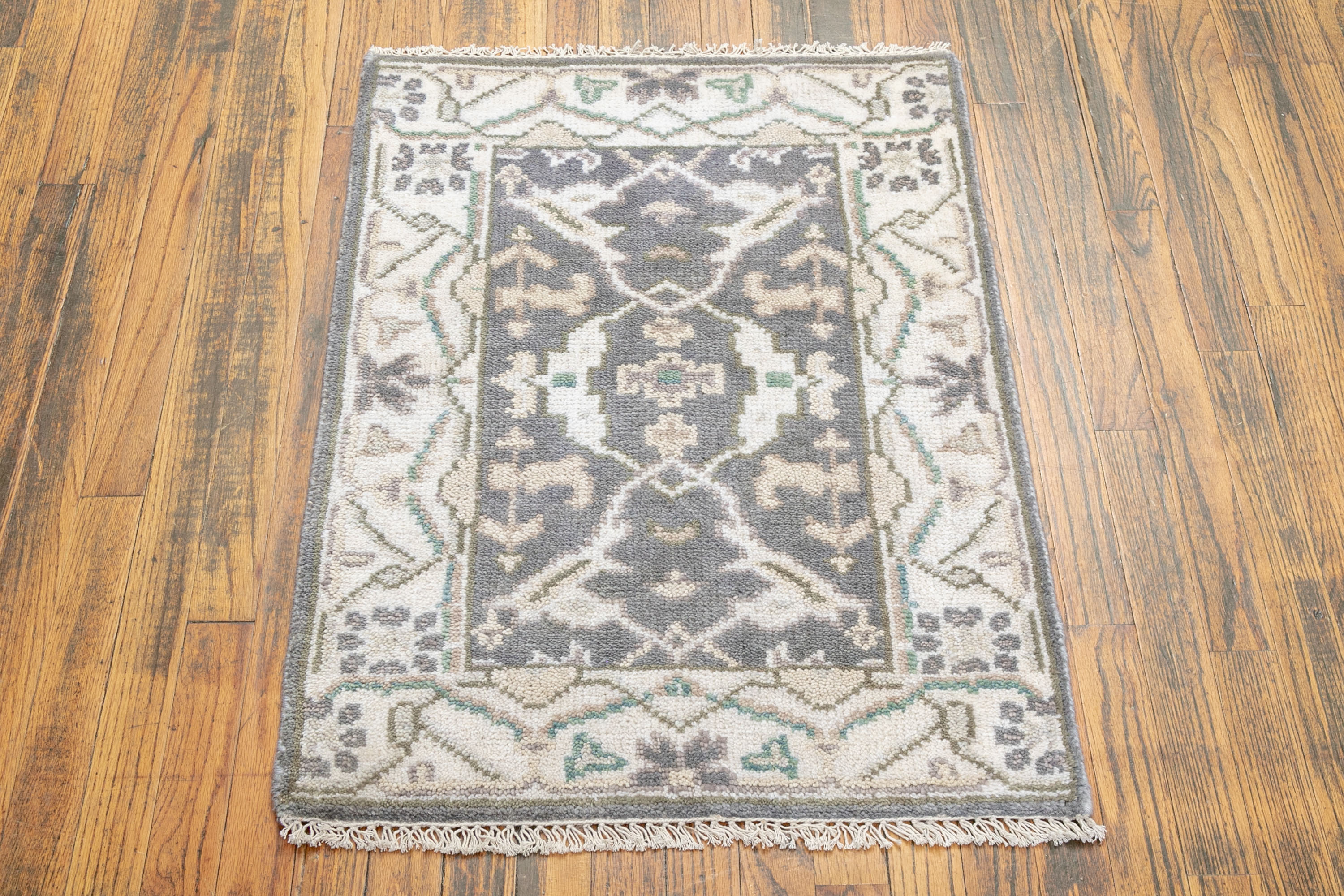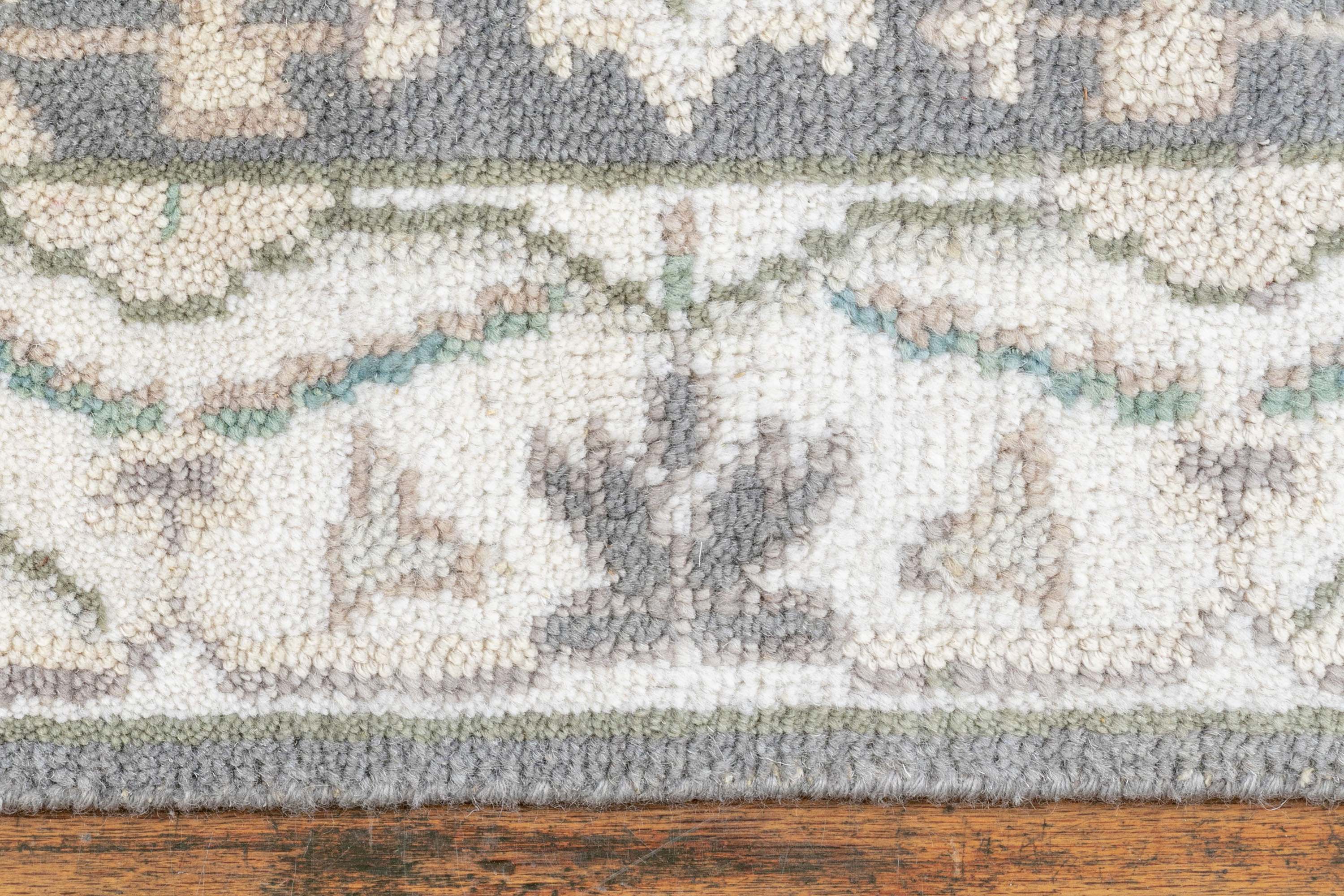 A beautiful hand-knotted Indian Oushak wool scatter rug sporting a wide white main border with fine vines, flanked by narrow olive-gray guard borders around a gray-purple field. The field is detailed with a fine lined symmetrical arrangement of openwork medallions in white, green, oatmeal, and gray-mauve.
