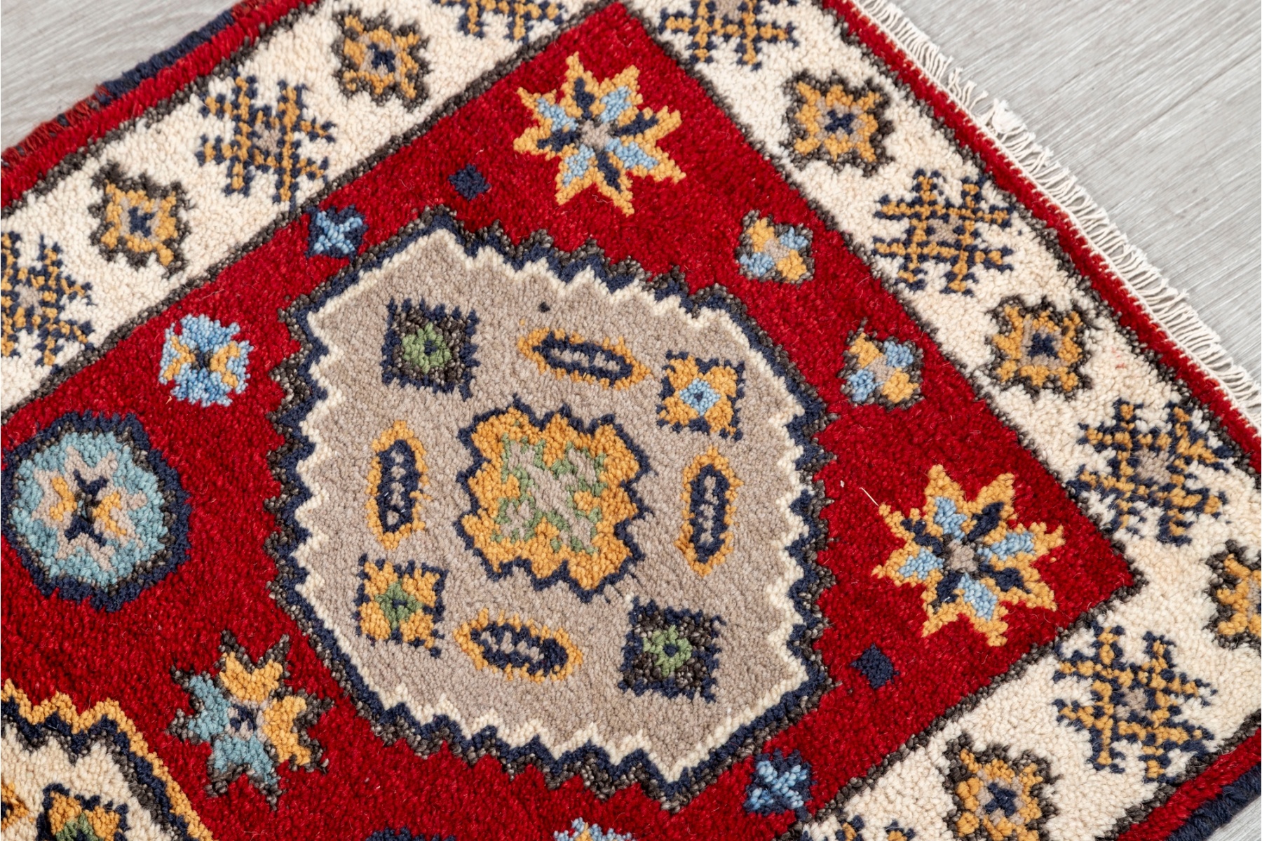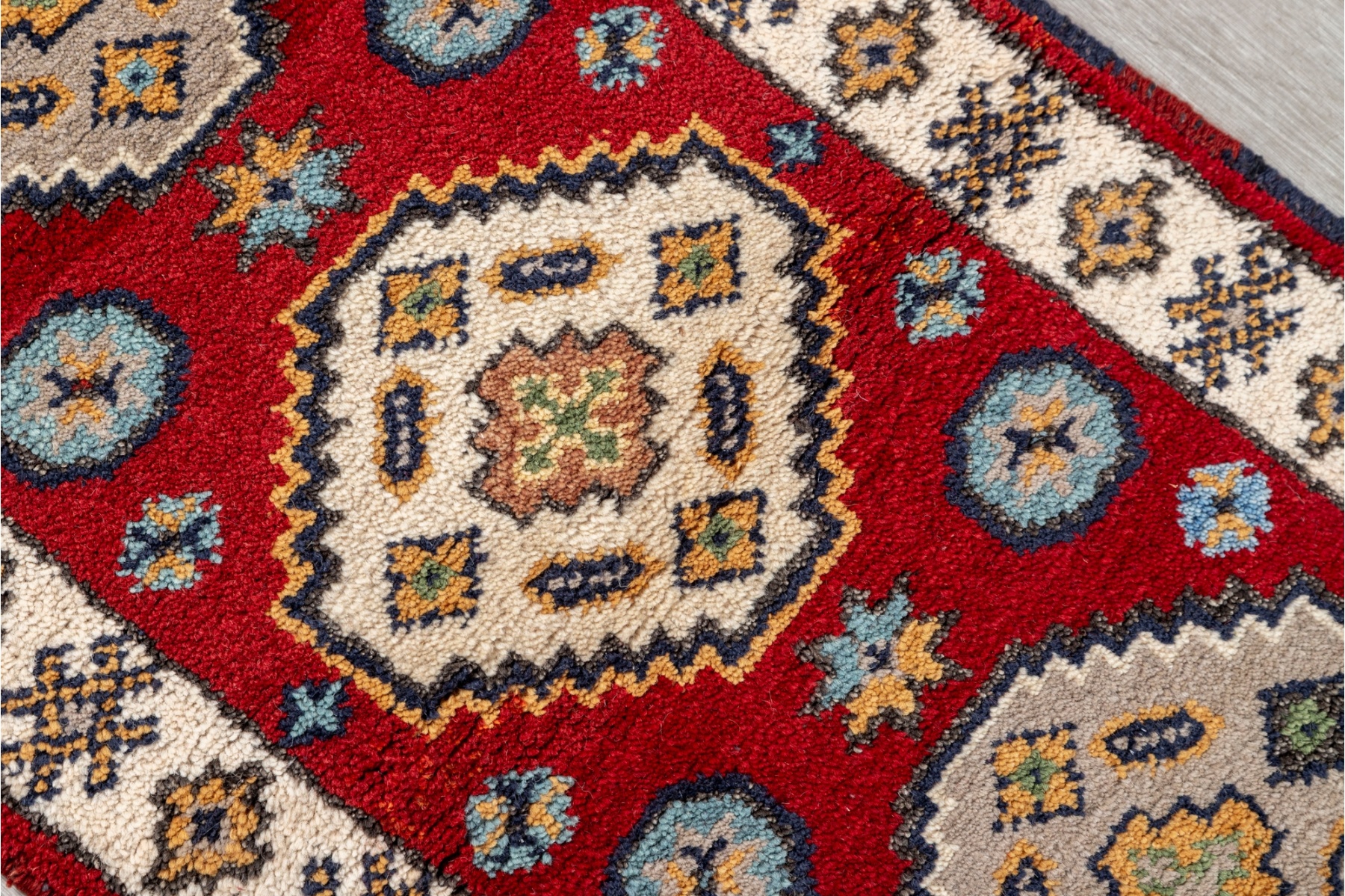 Classic hand-knotted wool Kazak rug featuring three diamond medallions on a rich crimson field. Accented with ivory, sky blue, and golden tan geometric motifs, framed by a traditional ivory border with stylized star and cross patterns.