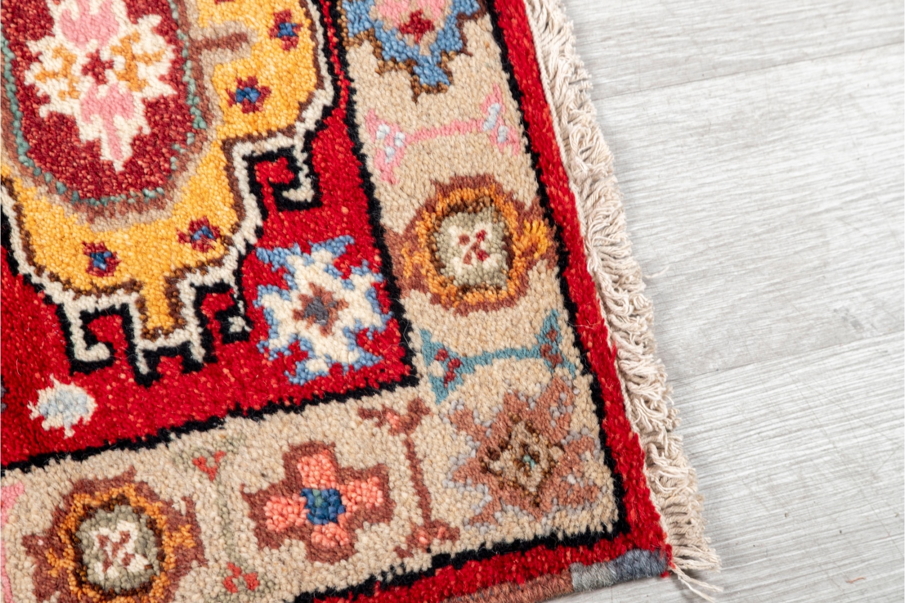 Traditional hand-knotted wool Kazak rug featuring bold geometric medallions in shades of gold, sky blue, ivory, and coral on a rich red field. The design is framed by a complementary border with stylized floral and tribal motifs. 100% Wool pile.