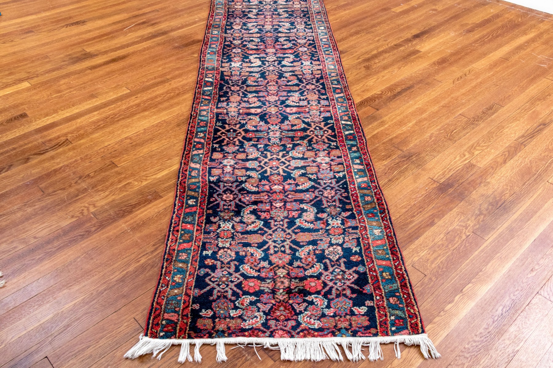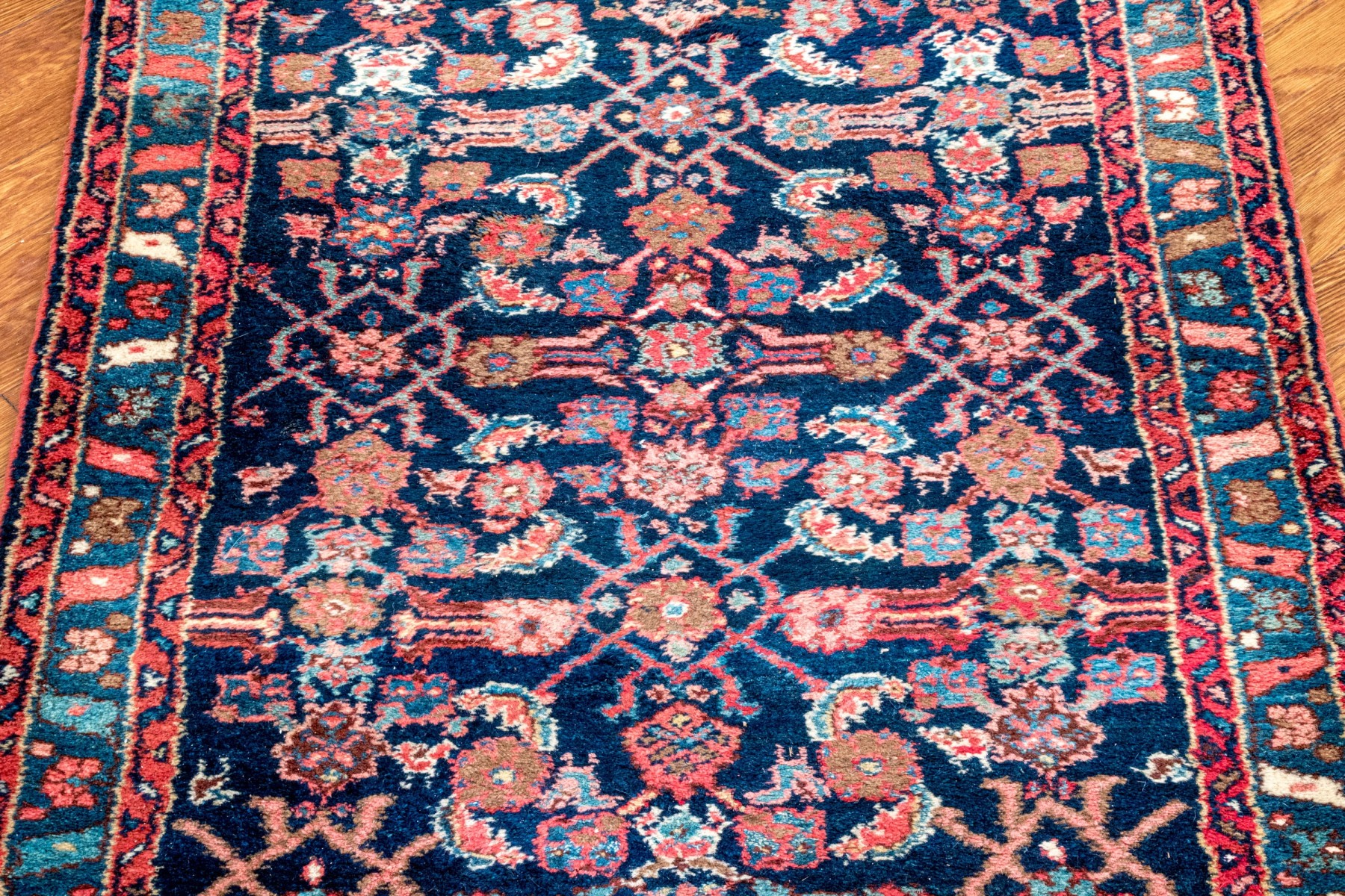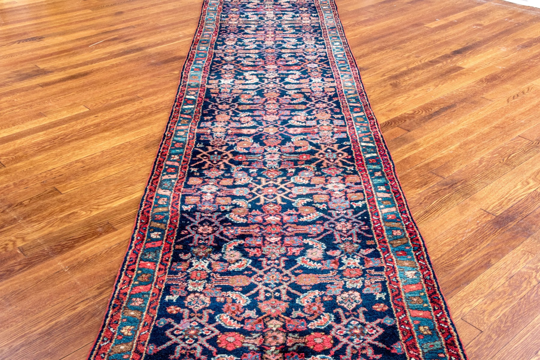 A fabulous and long hand-knotted wool runner designed with aqua blue main borders and red guard borders flanking a navy blue field. The field is beautifully detailed with a fine design of branching geometric and floral medallions in vibrant red, orange, blue, and white.