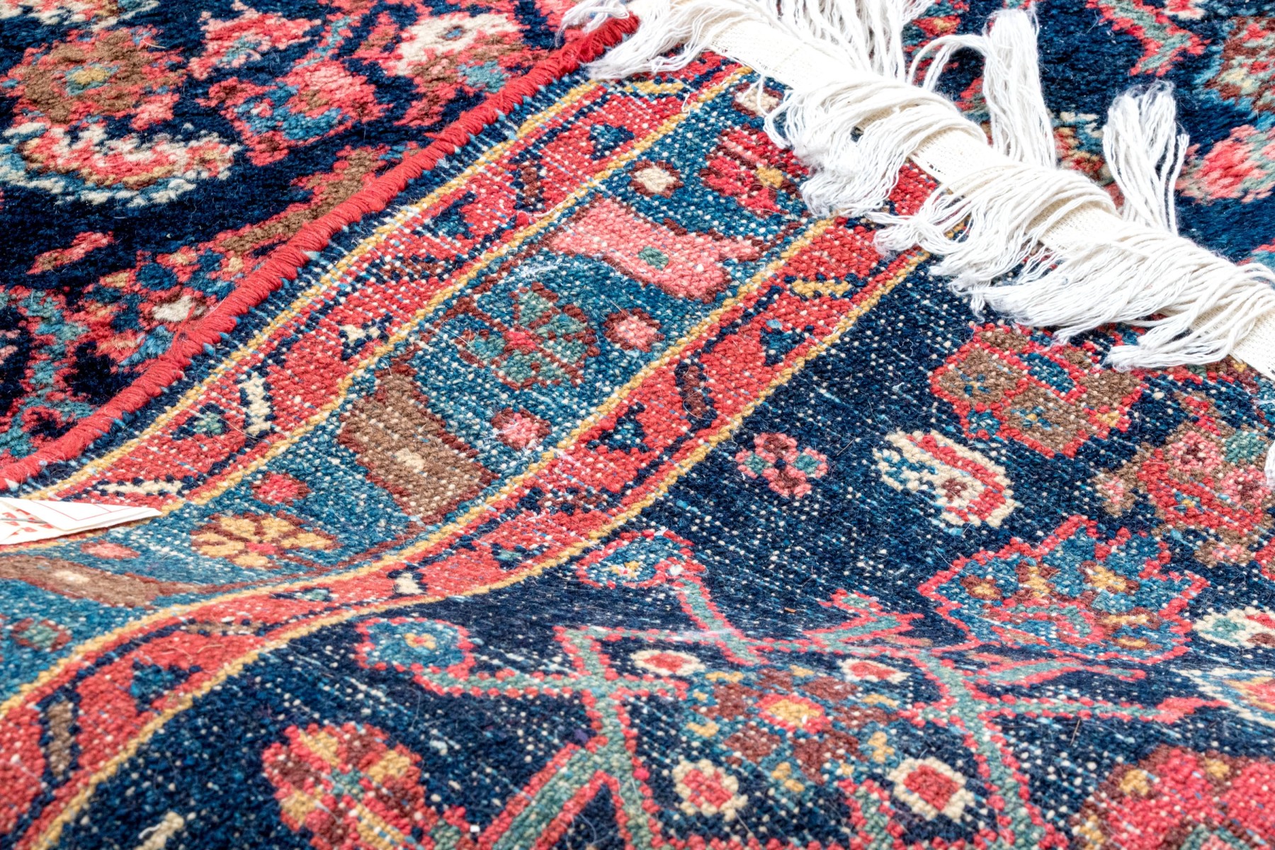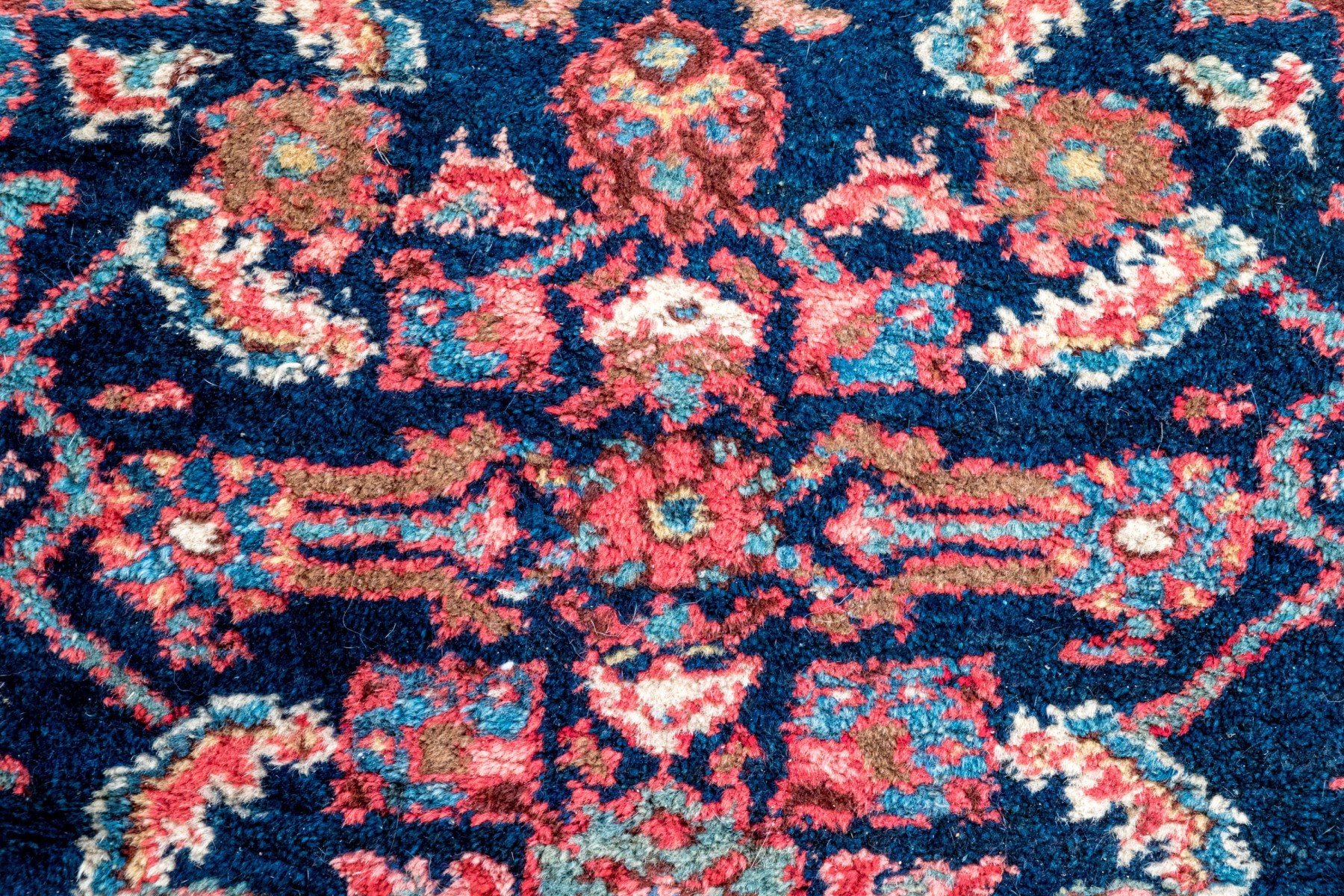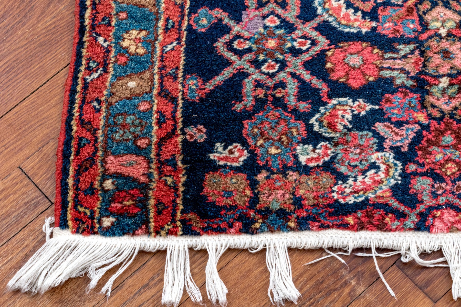 A fabulous and long hand-knotted wool runner designed with aqua blue main borders and red guard borders flanking a navy blue field. The field is beautifully detailed with a fine design of branching geometric and floral medallions in vibrant red, orange, blue, and white.