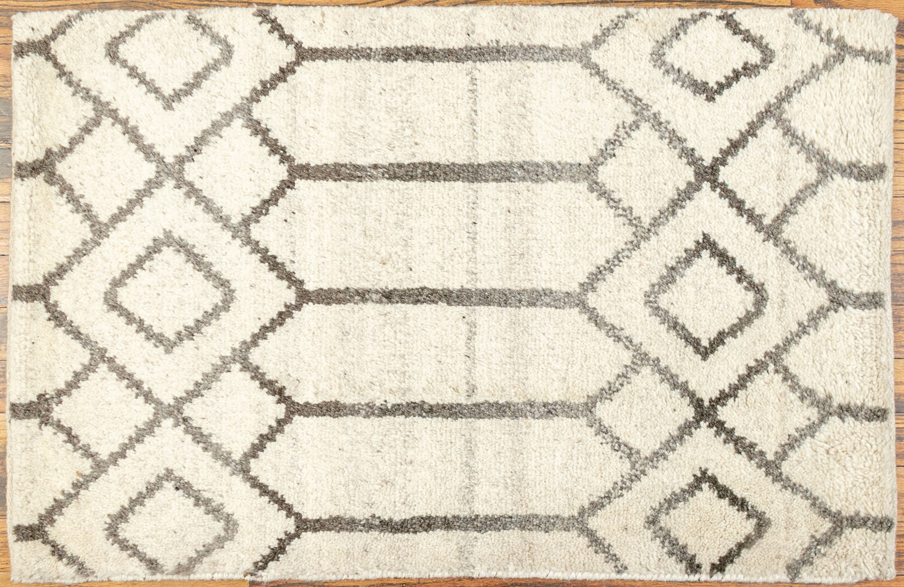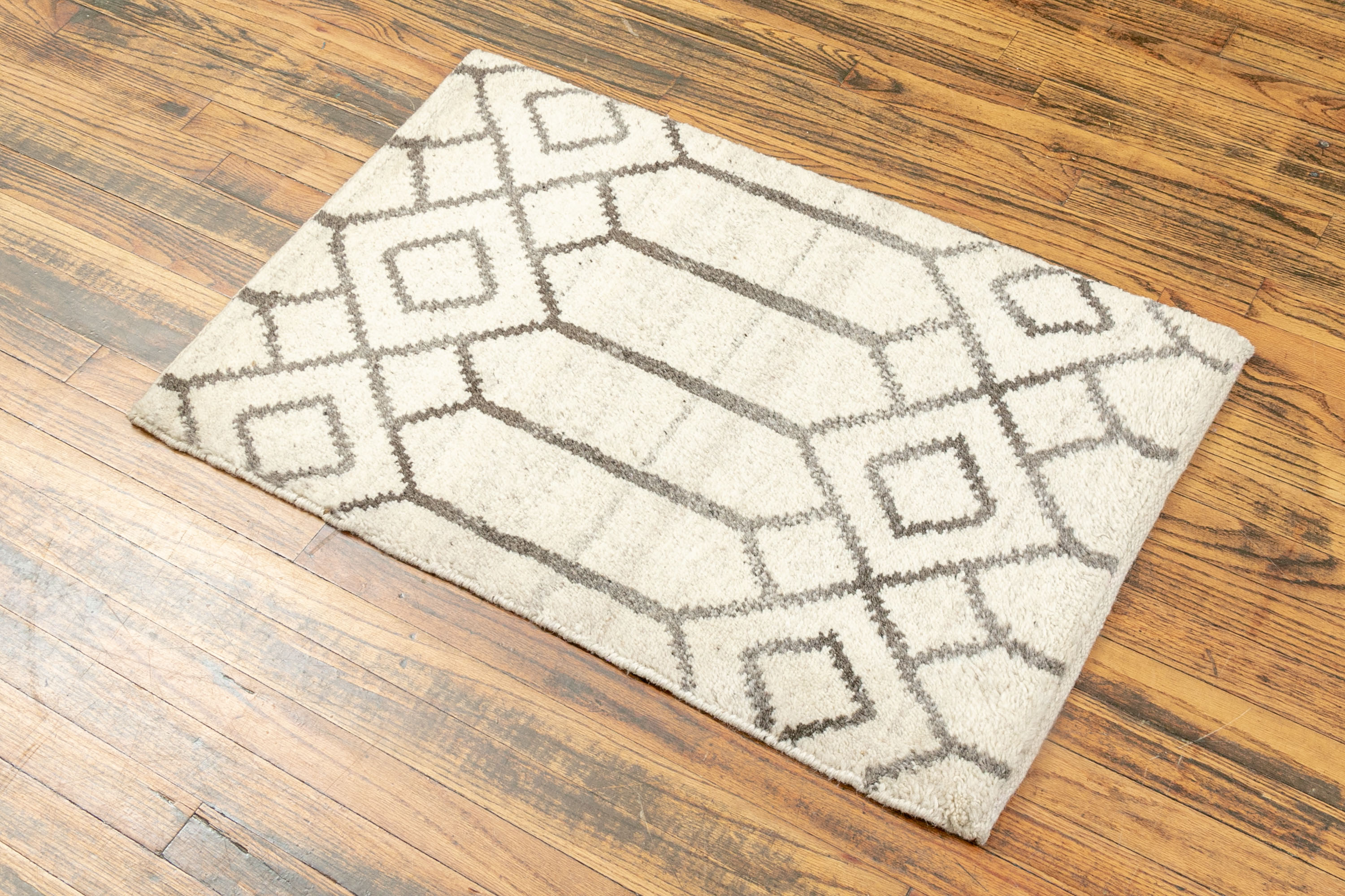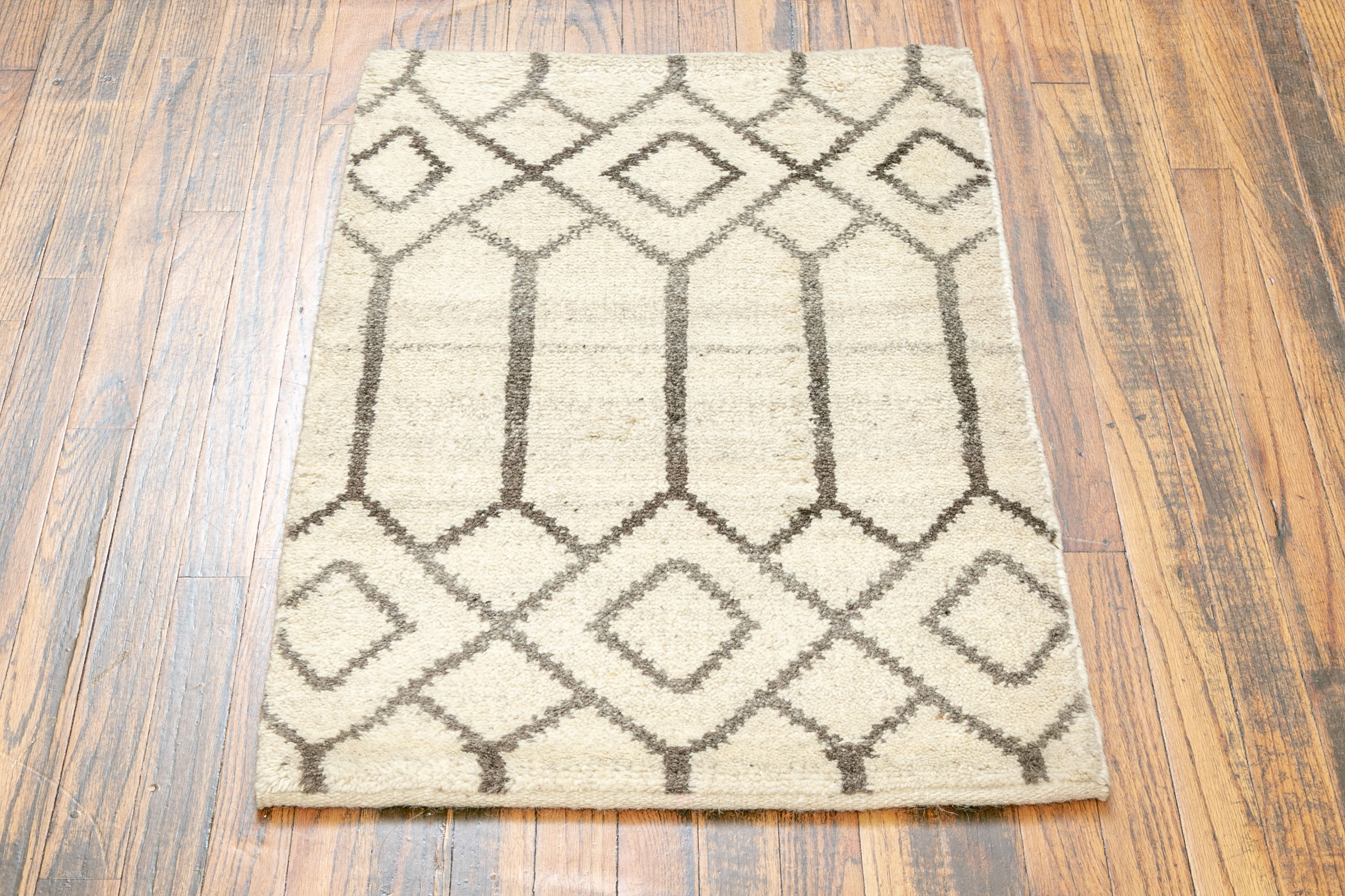 A unique hand-knotted wool scatter rug displaying a snakeskin pattern with gray lattices over a cream ground.