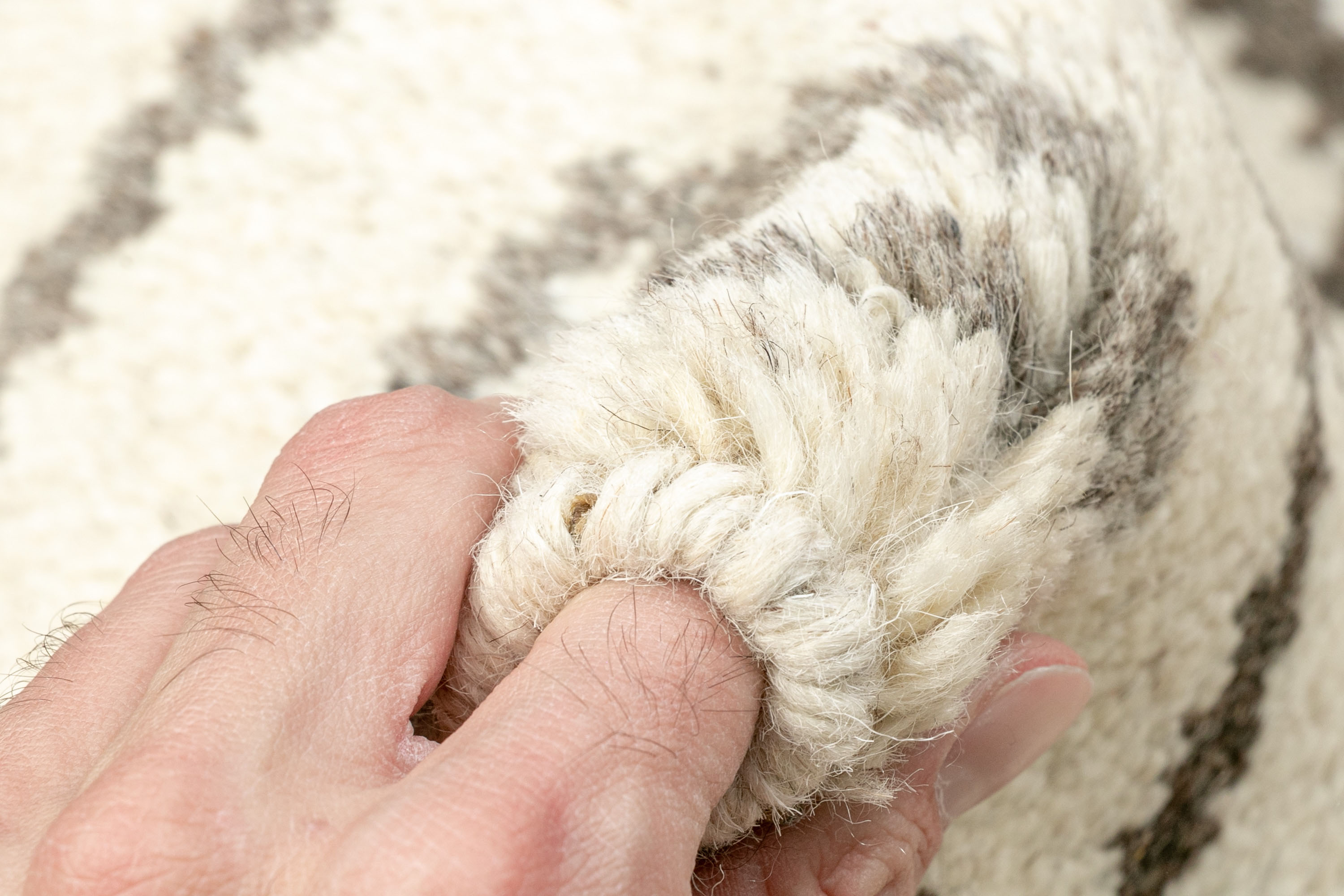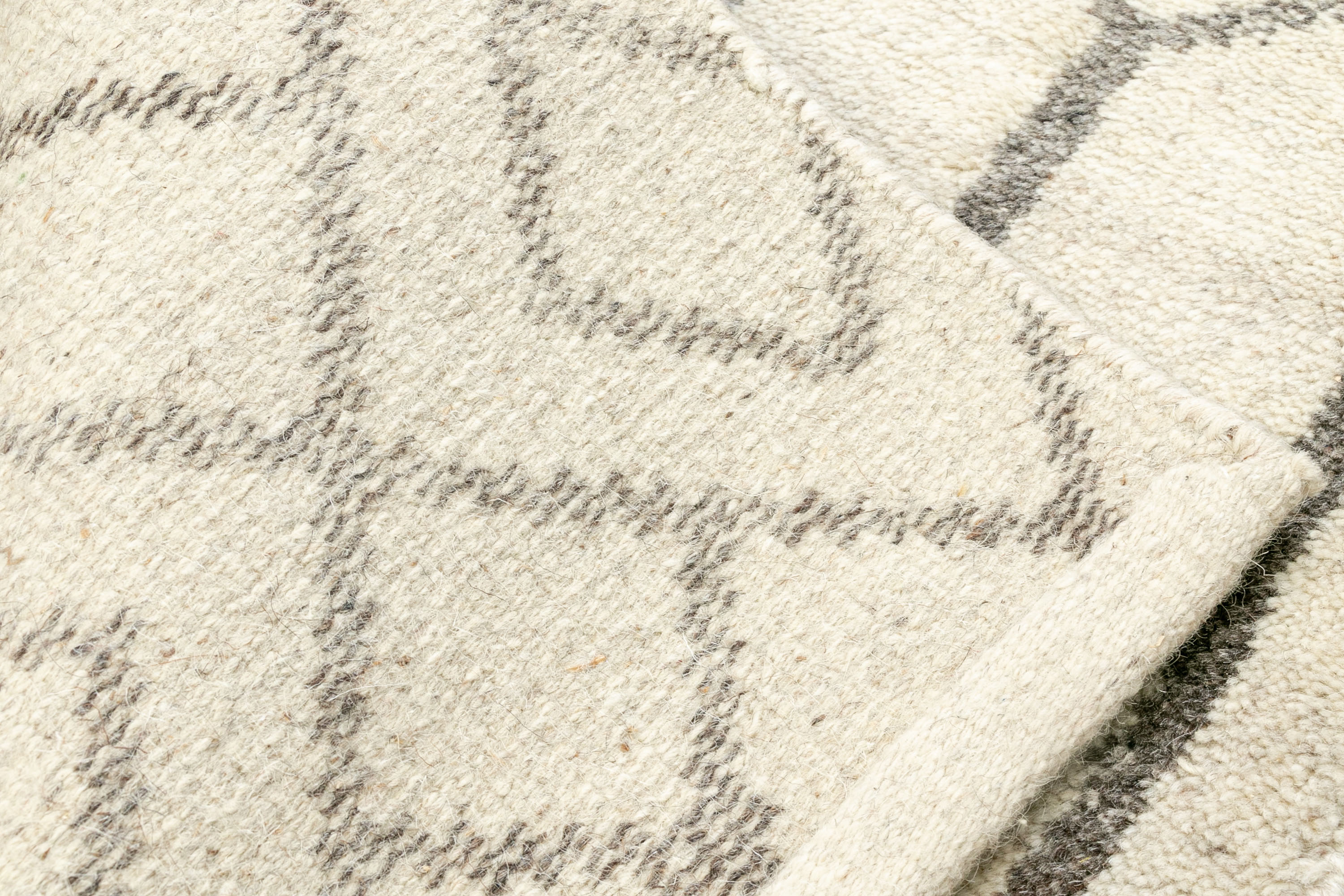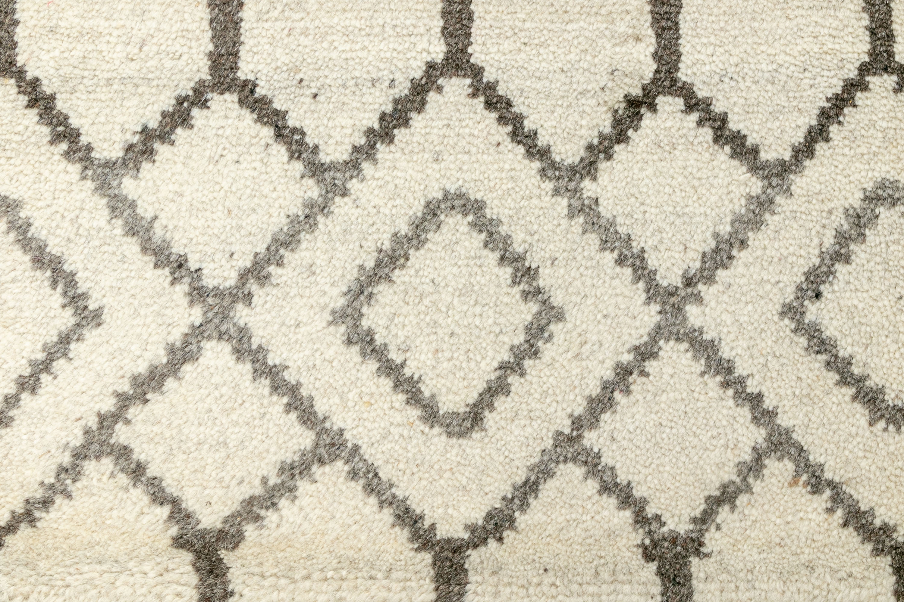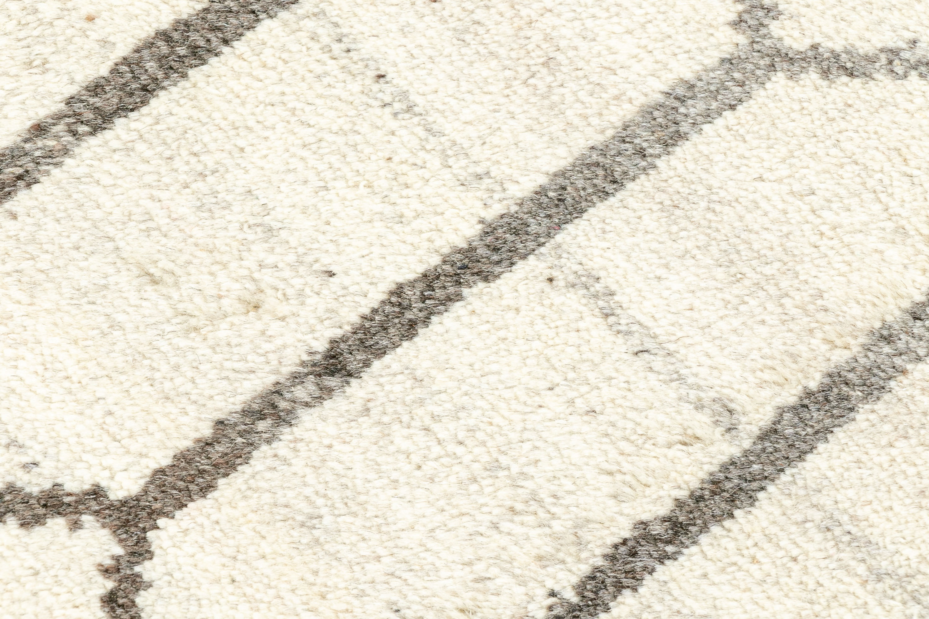 A unique hand-knotted wool scatter rug displaying a snakeskin pattern with gray lattices over a cream ground.