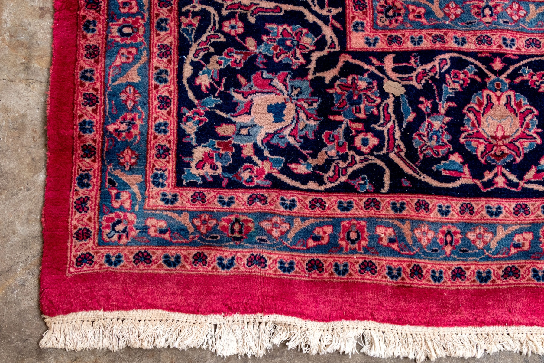 The carpet with a central red ground field having dark ground center medallion and dark ground corners within the central field. Surrounding is a thick dark ground guard flanked on either end by decorative border guards with fringe to two ends.