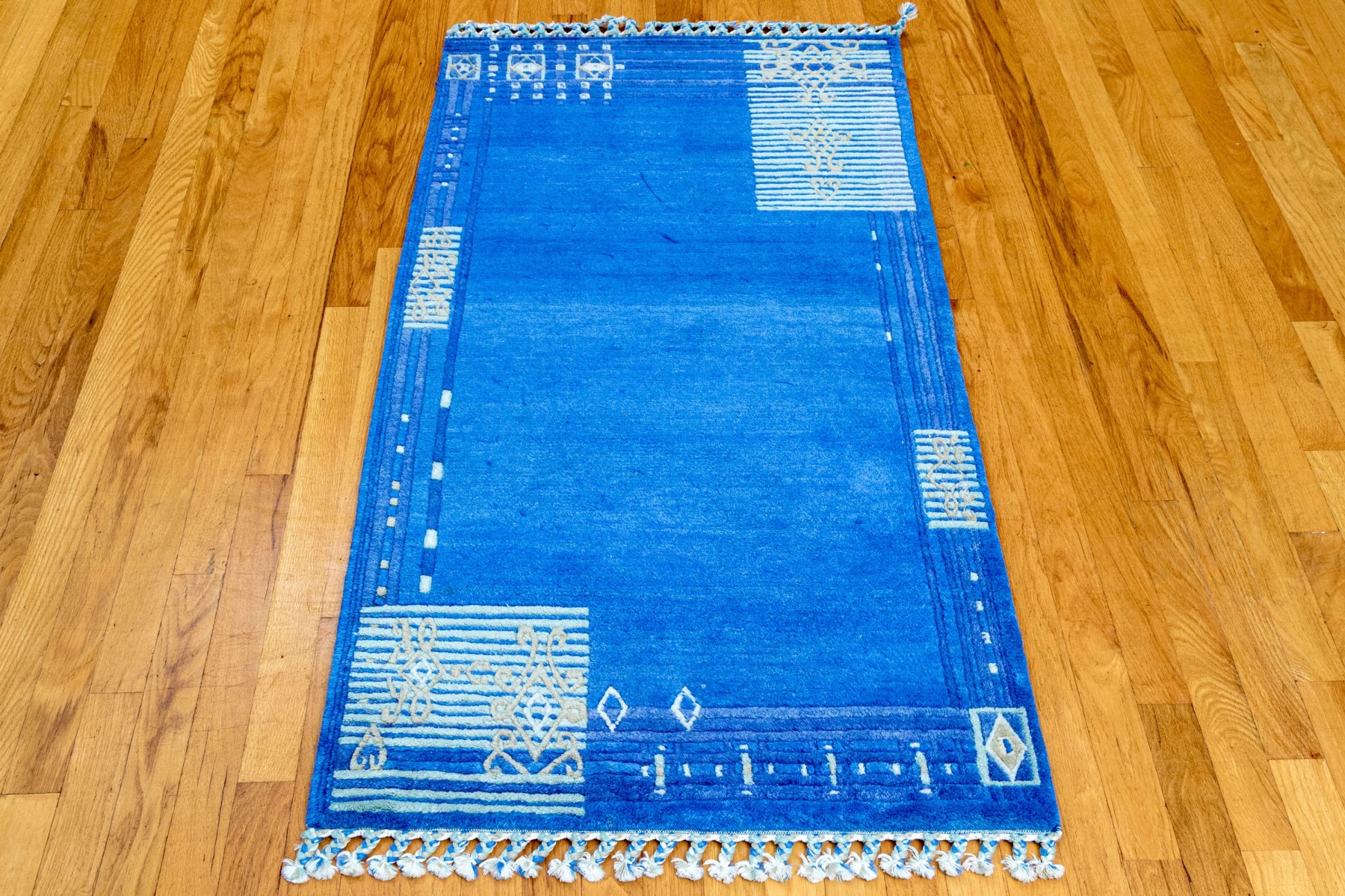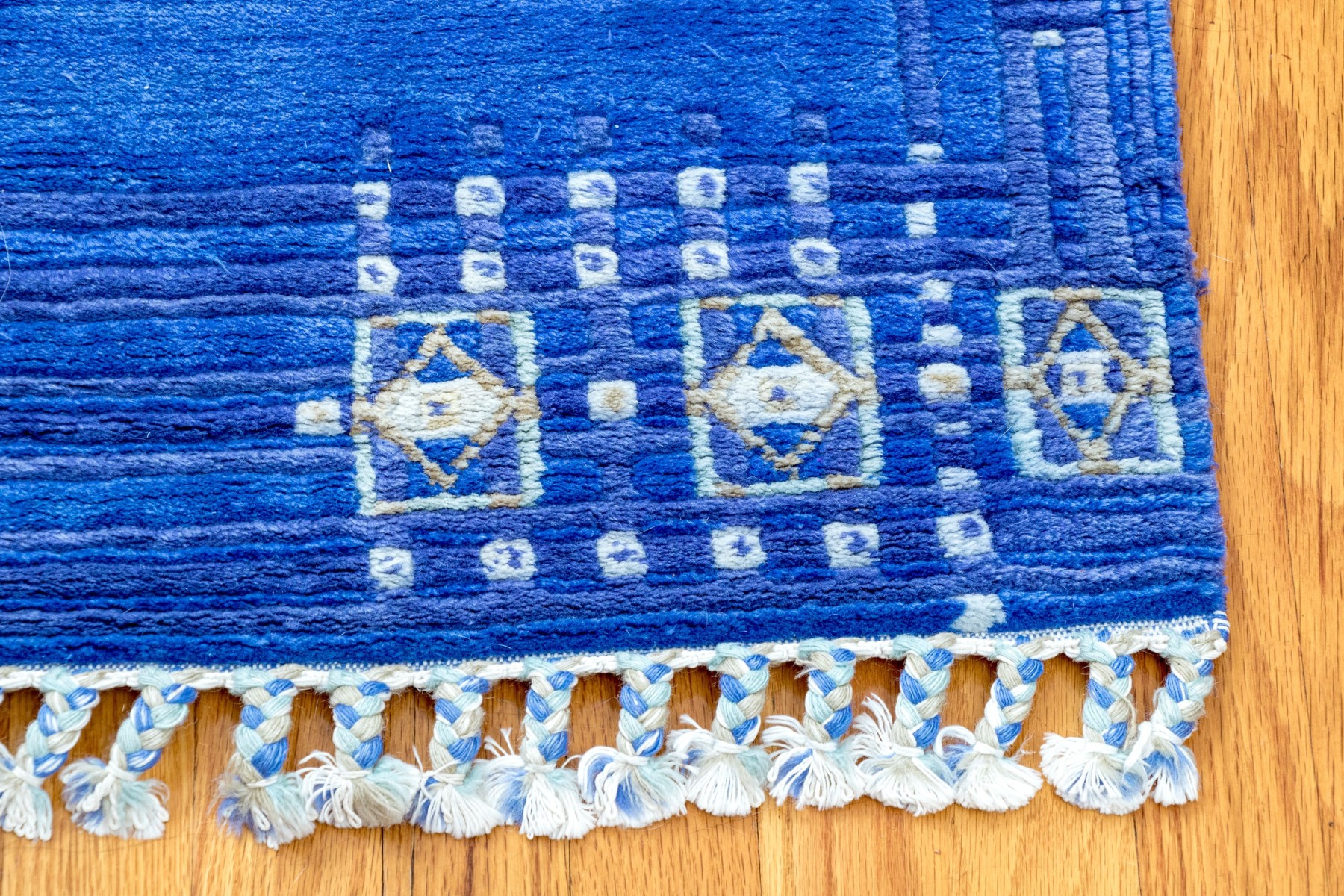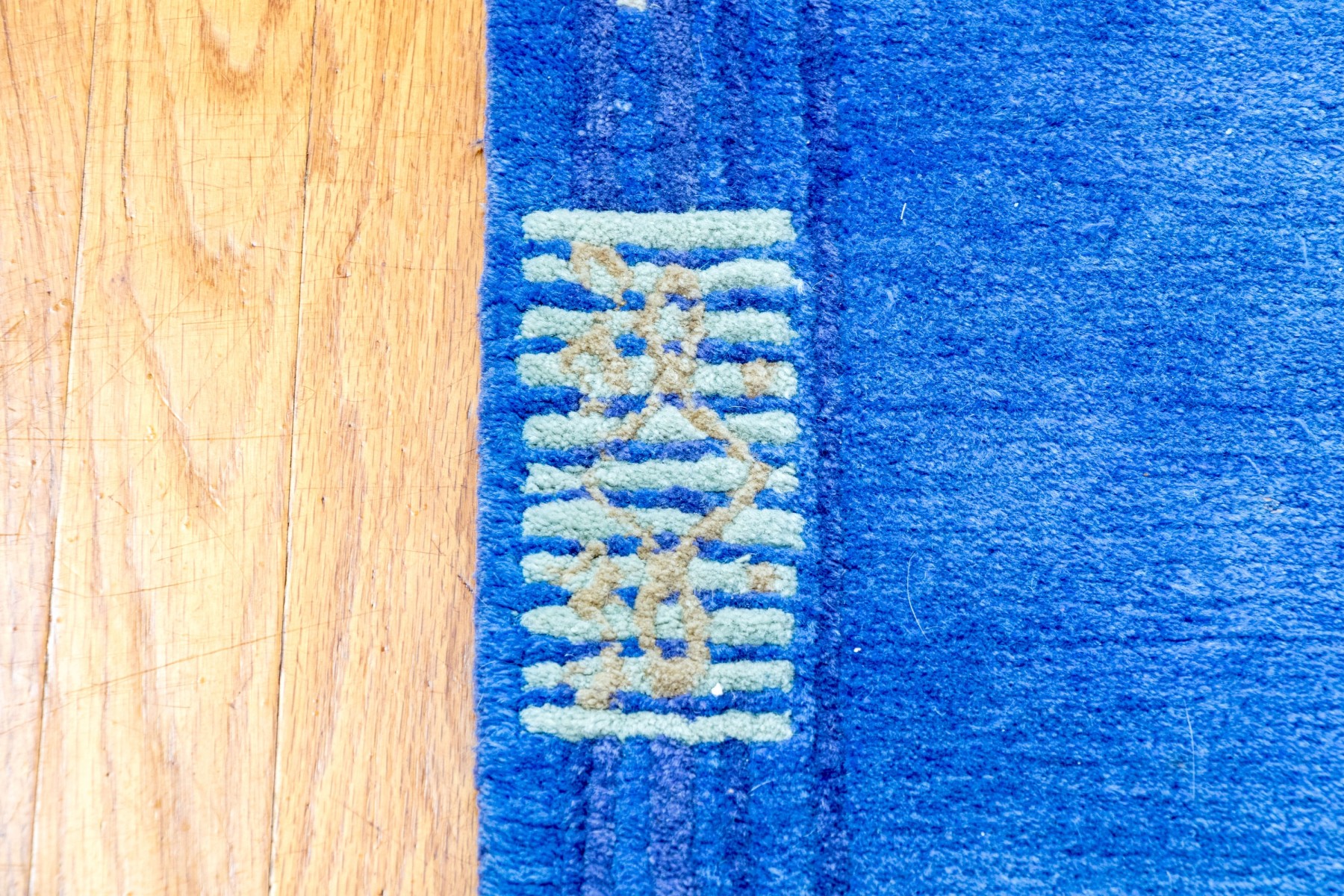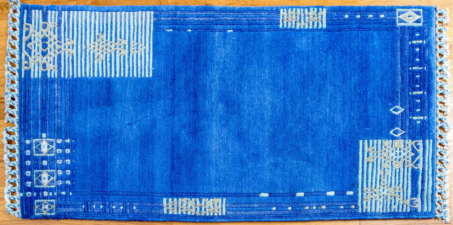 A handsome hand-loomed wool runner designed with a vibrant blue ground and decorative motifs to the outer border with square and rectangular motifs creating an asymmetrical pattern that is both fun and elegant.