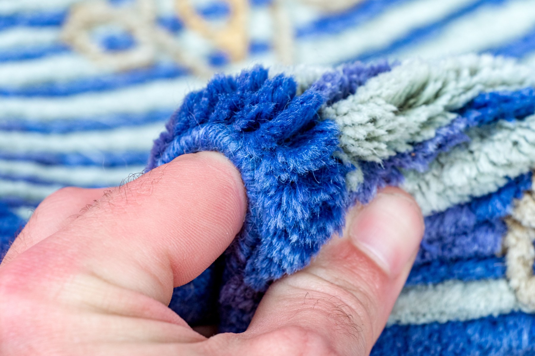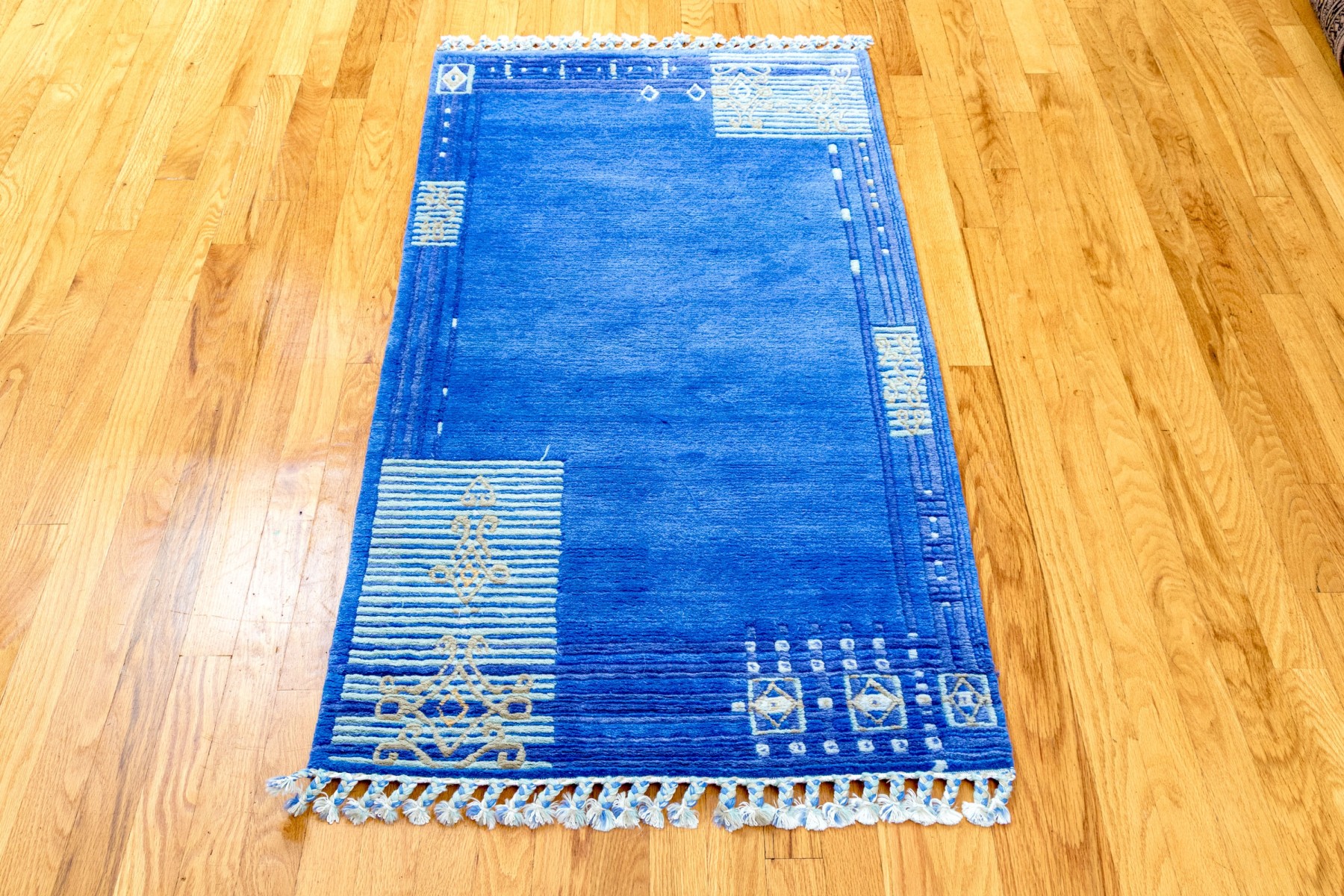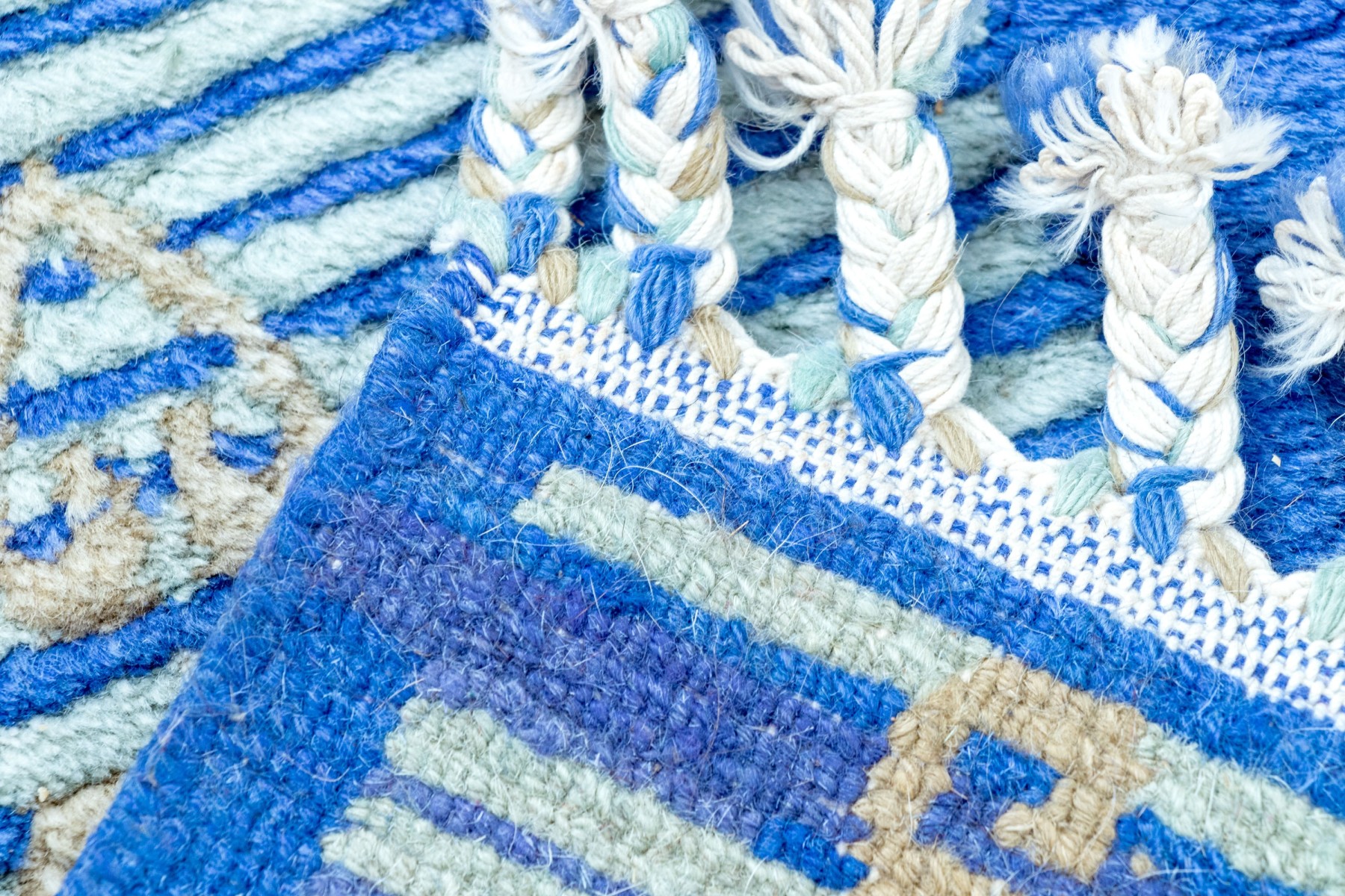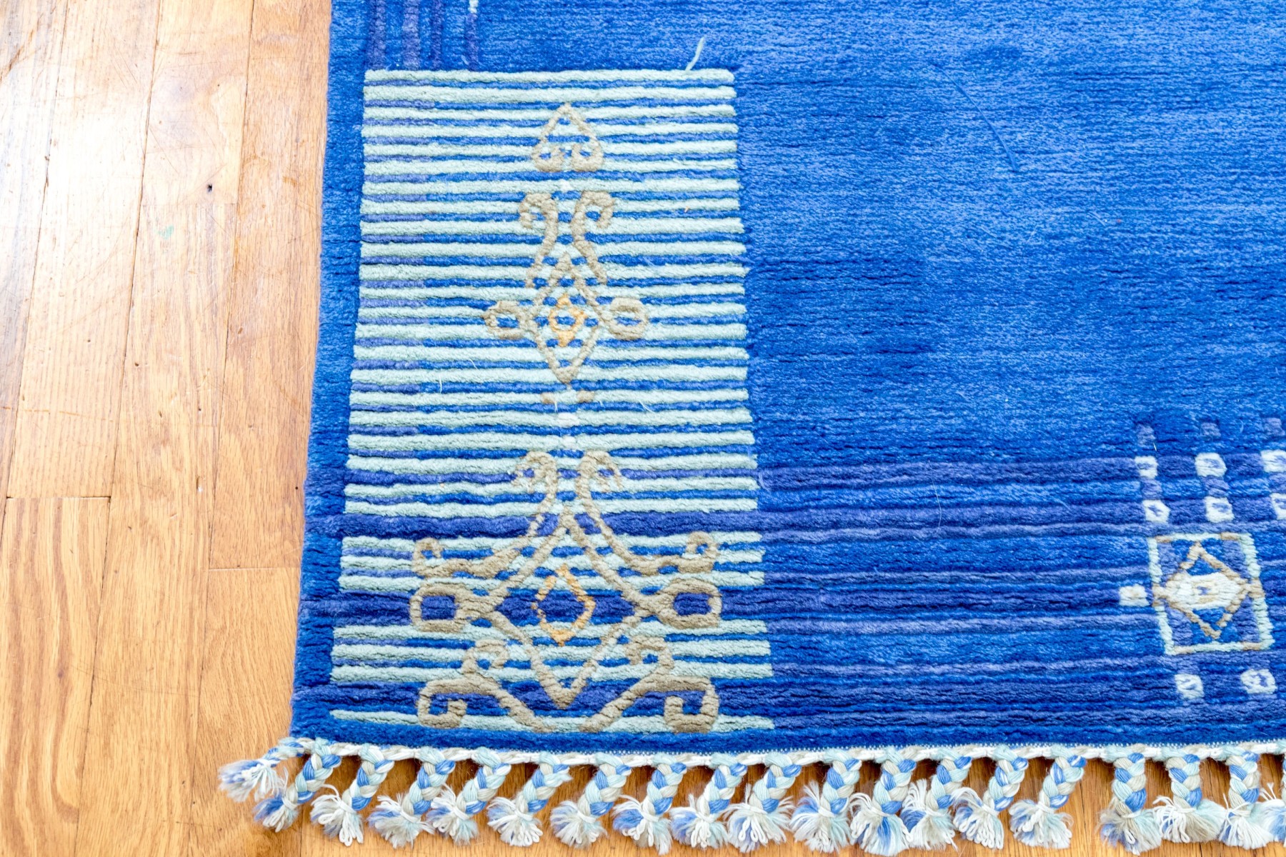 A handsome hand-loomed wool runner designed with a vibrant blue ground and decorative motifs to the outer border with square and rectangular motifs creating an asymmetrical pattern that is both fun and elegant.