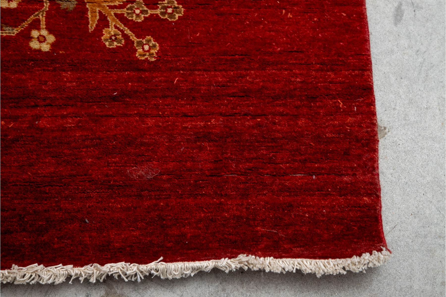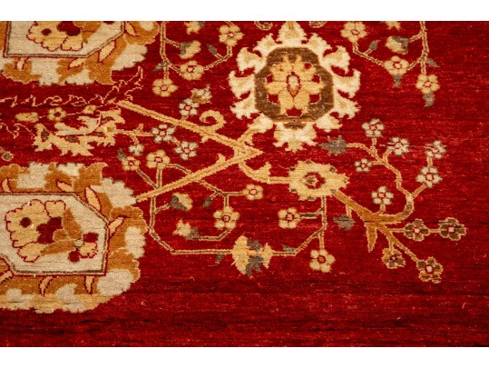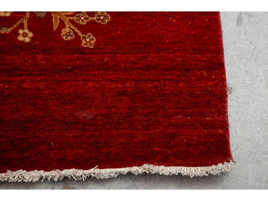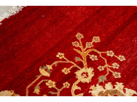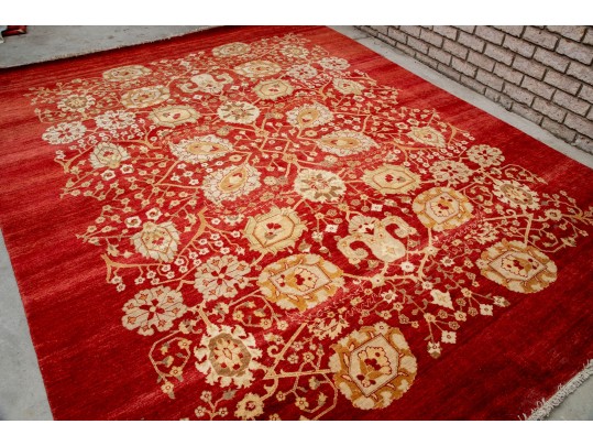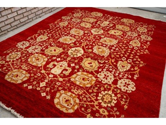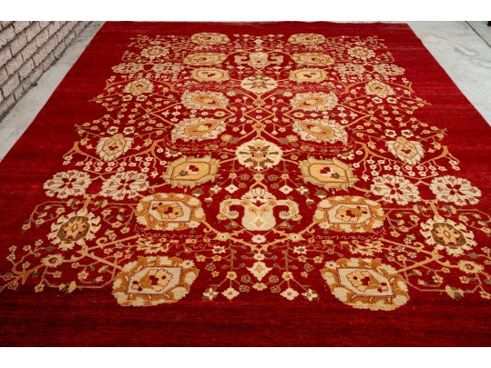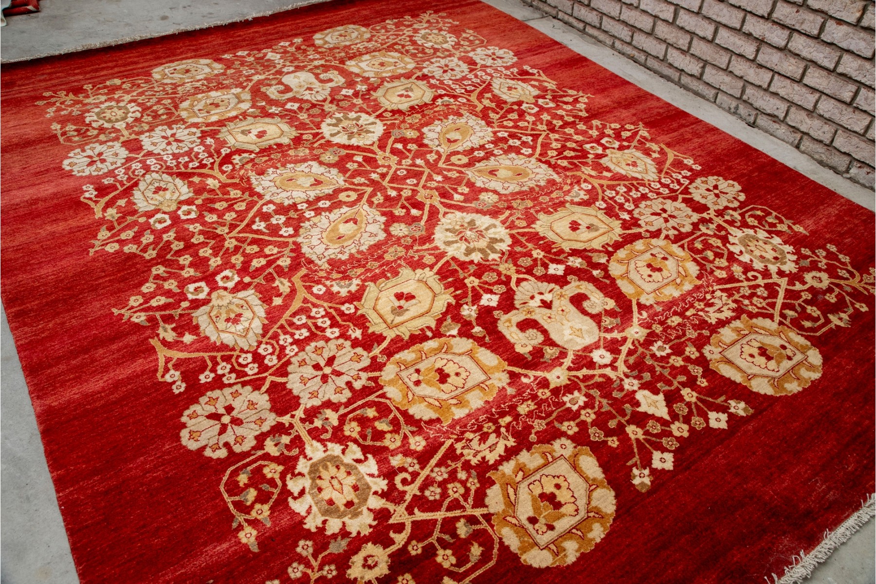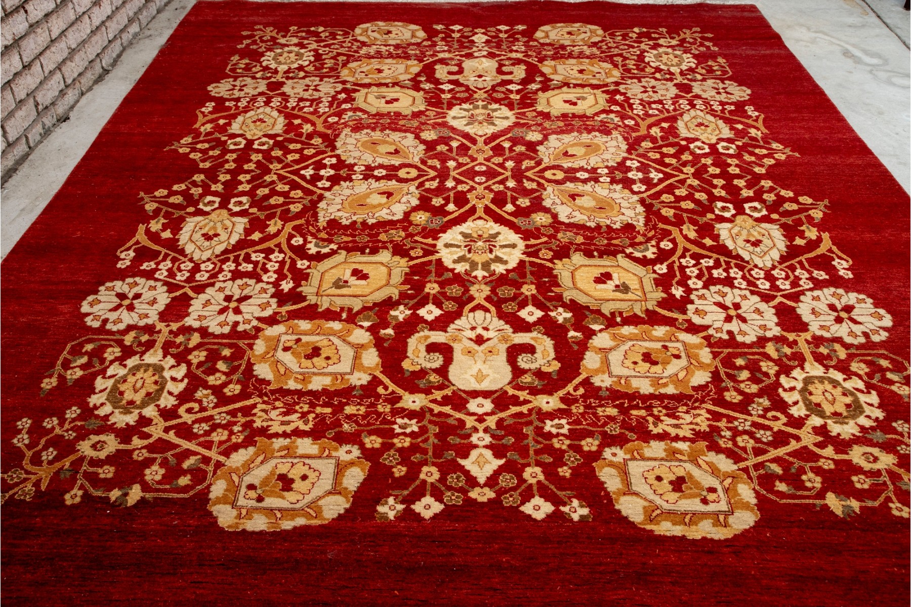 This is a hand-knotted Oriental rug featuring a rich red field adorned with an intricate khaki and cream floral pattern. The symmetrical design showcases traditional Oushak or Persian influences, with stylized botanical motifs and ornate medallions woven in warm, earthy tones, creating a stark contrast with no discernible borders.