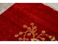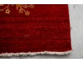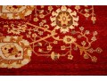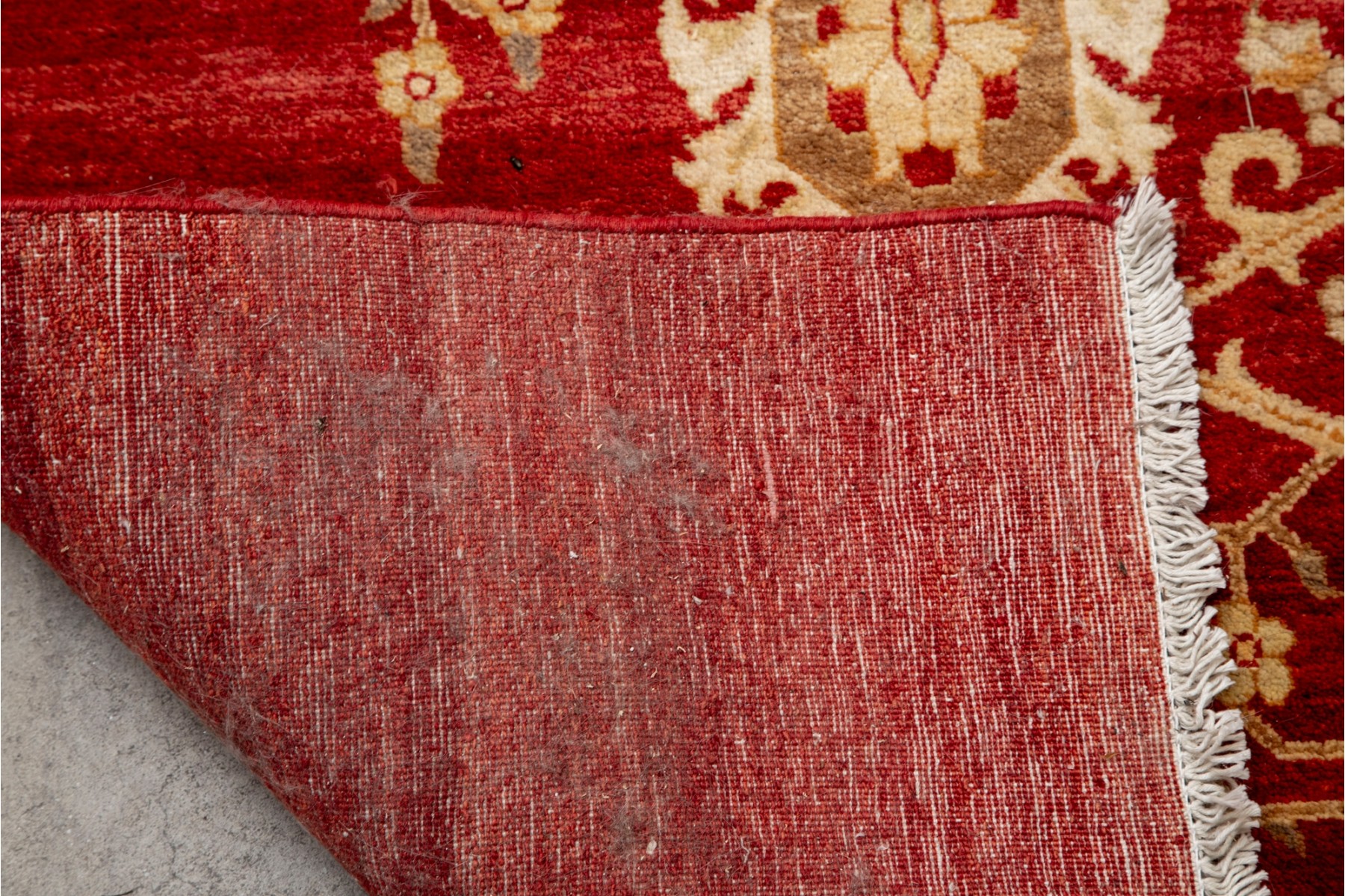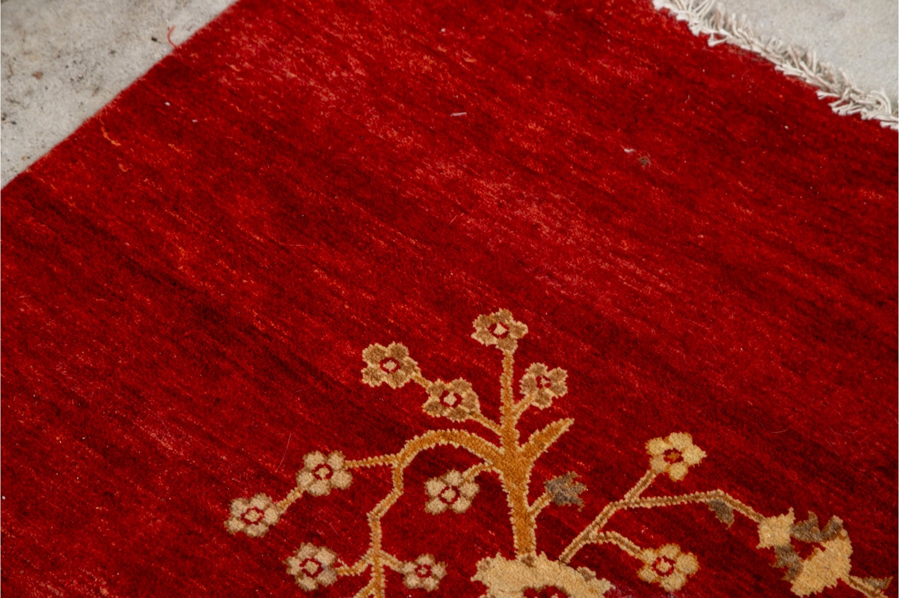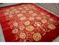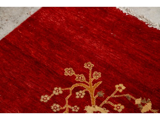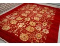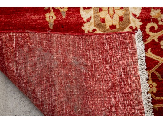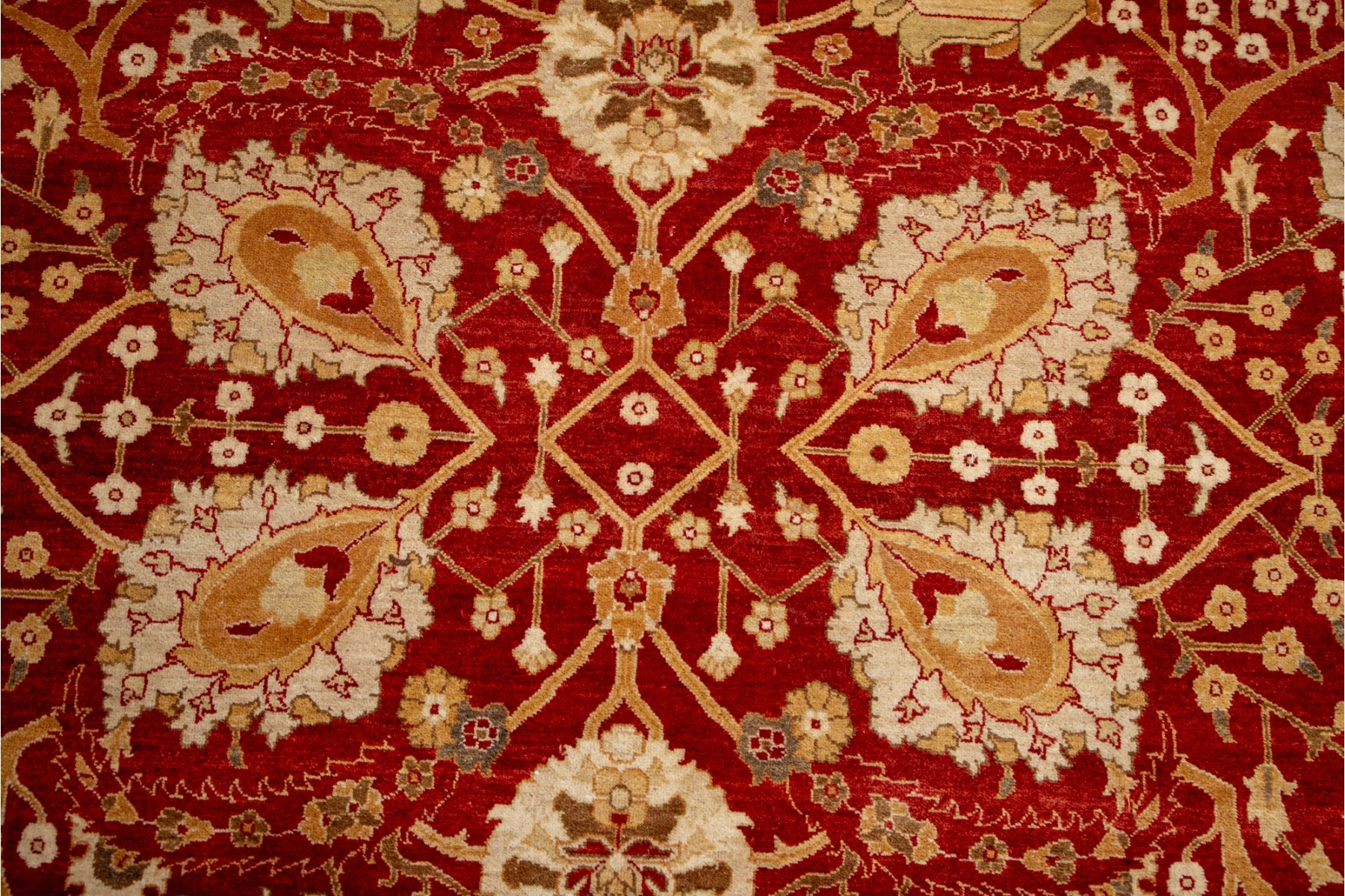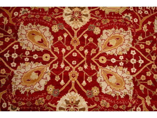 This is a hand-knotted Oriental rug featuring a rich red field adorned with an intricate khaki and cream floral pattern. The symmetrical design showcases traditional Oushak or Persian influences, with stylized botanical motifs and ornate medallions woven in warm, earthy tones, creating a stark contrast with no discernible borders.