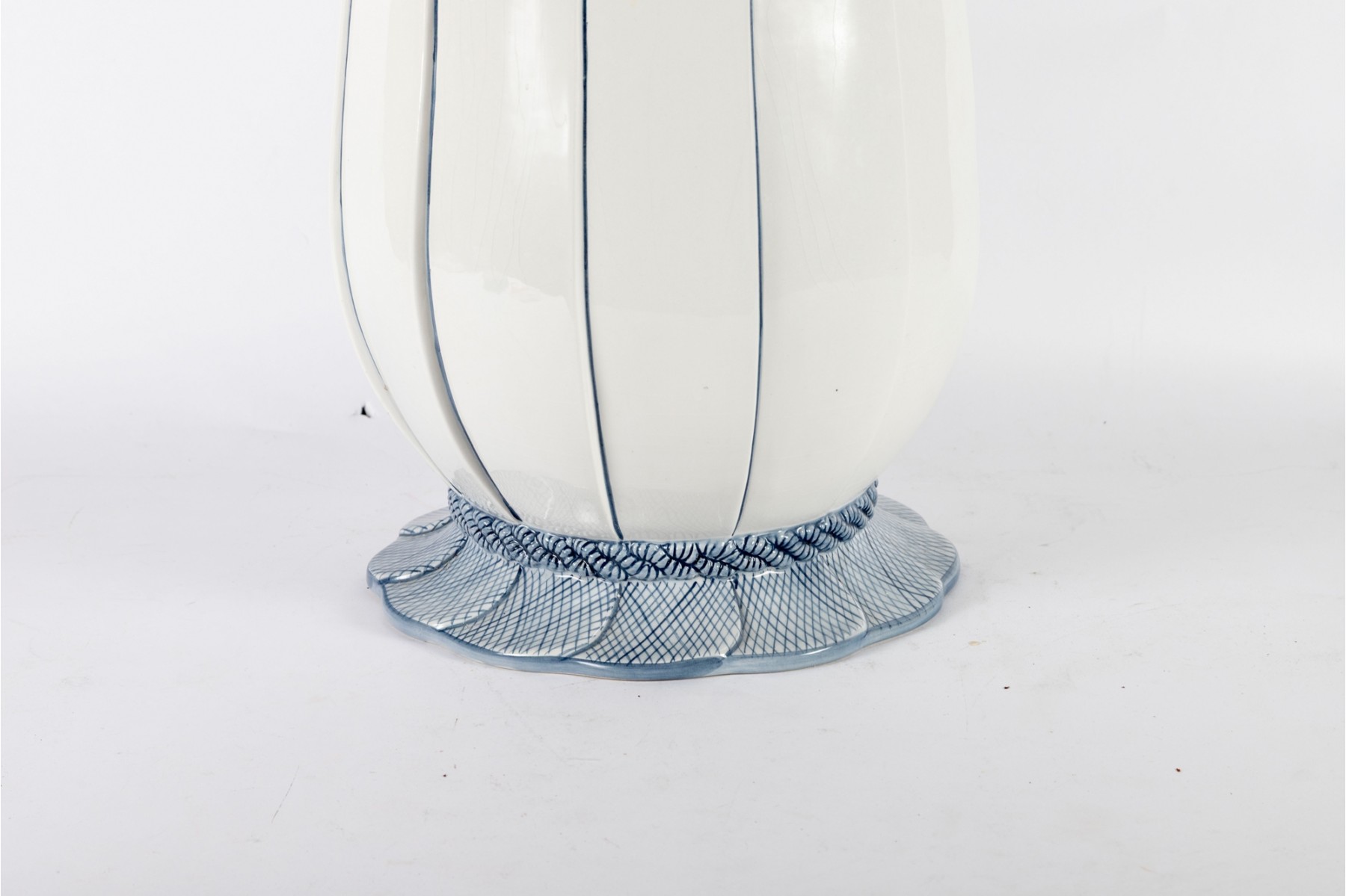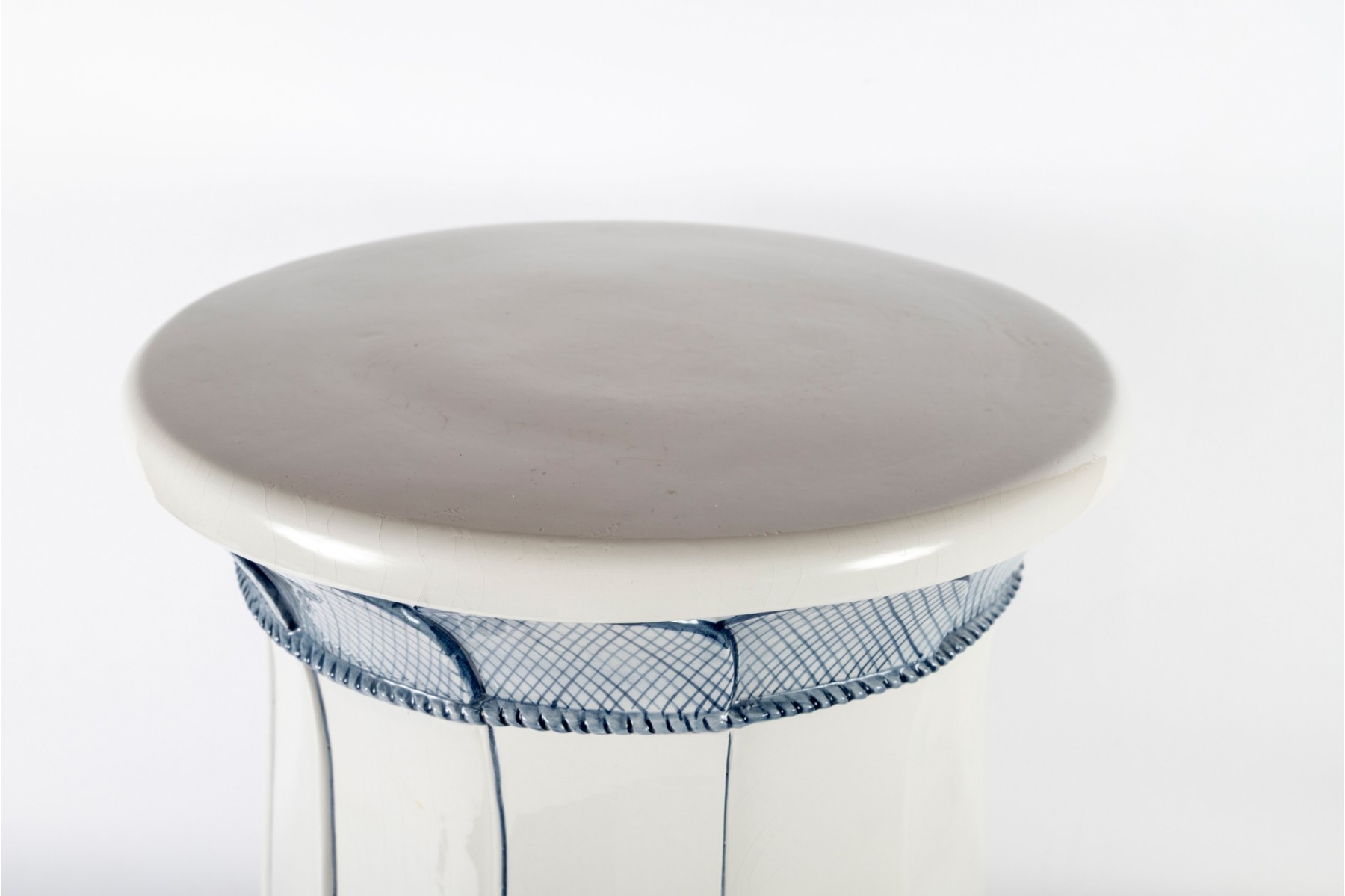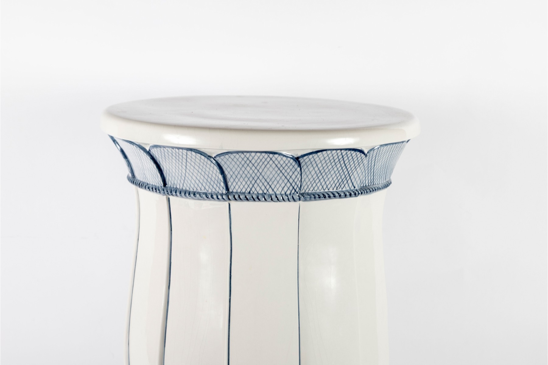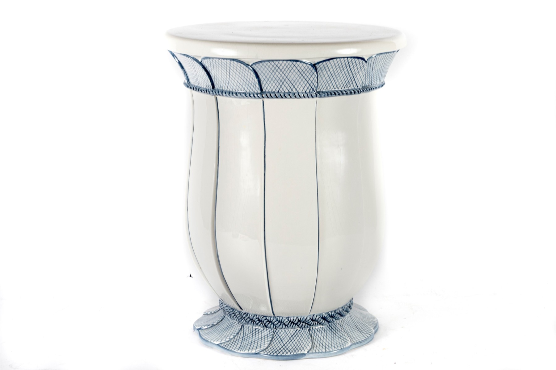 An elegant ceramic garden stool featuring a stylized petal design in soft blue on a white ground. The flared form is accented with vertical panels and crosshatched leaf patterns ending from top to bottom.