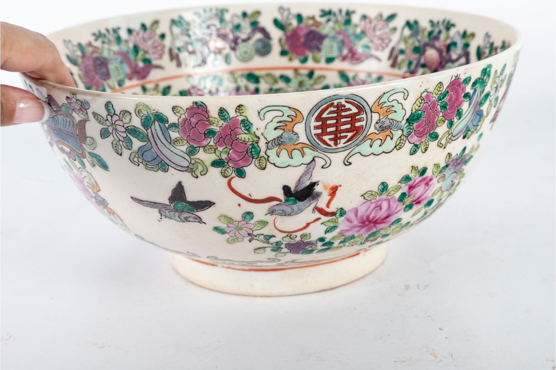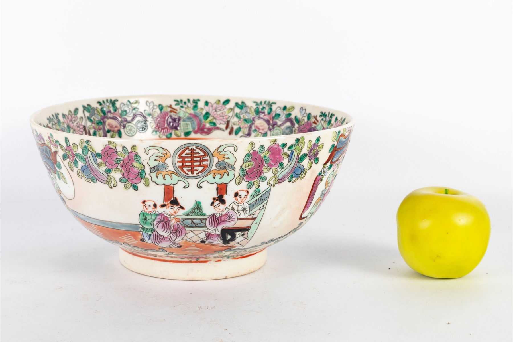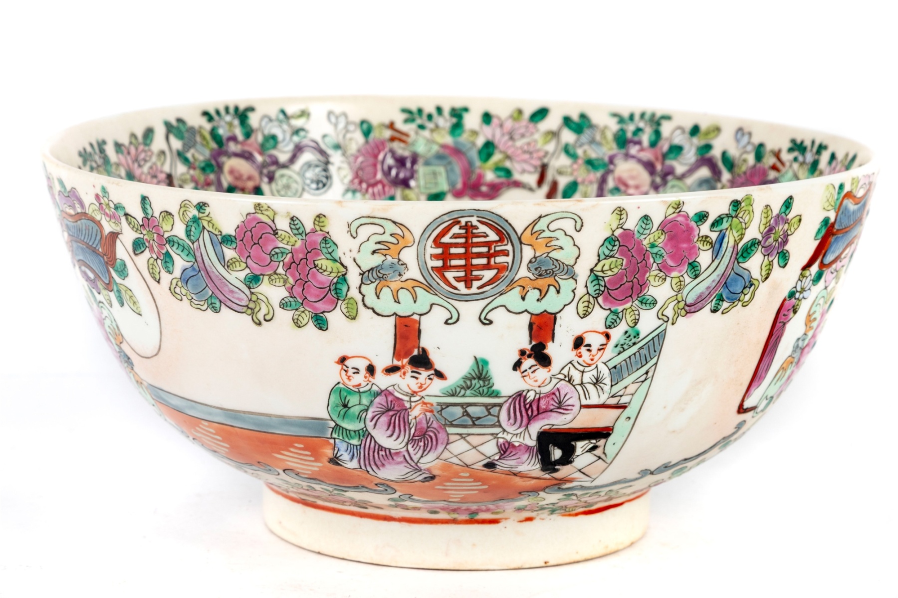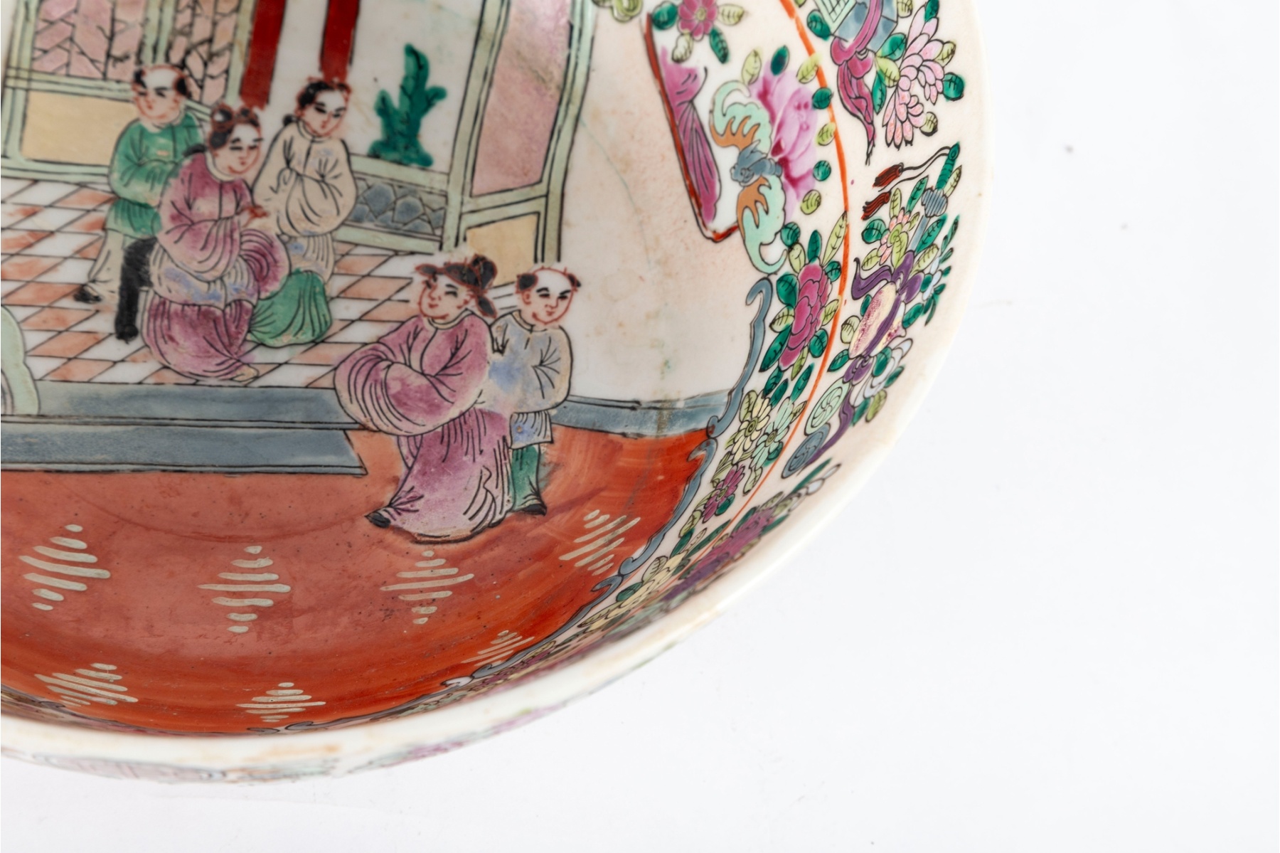 Chinese porcelain bowl featuring finely hand-painted vibrant famille rose decoration with alternating panels depicting courtyard scenes of figures and children, surrounded by lush floral and foliate motifs with auspicious symbols and birds in flight. The interior mirrors the exterior decoration with a central figural scene enclosed by a floral and scrollwork border. Marked underfoot.