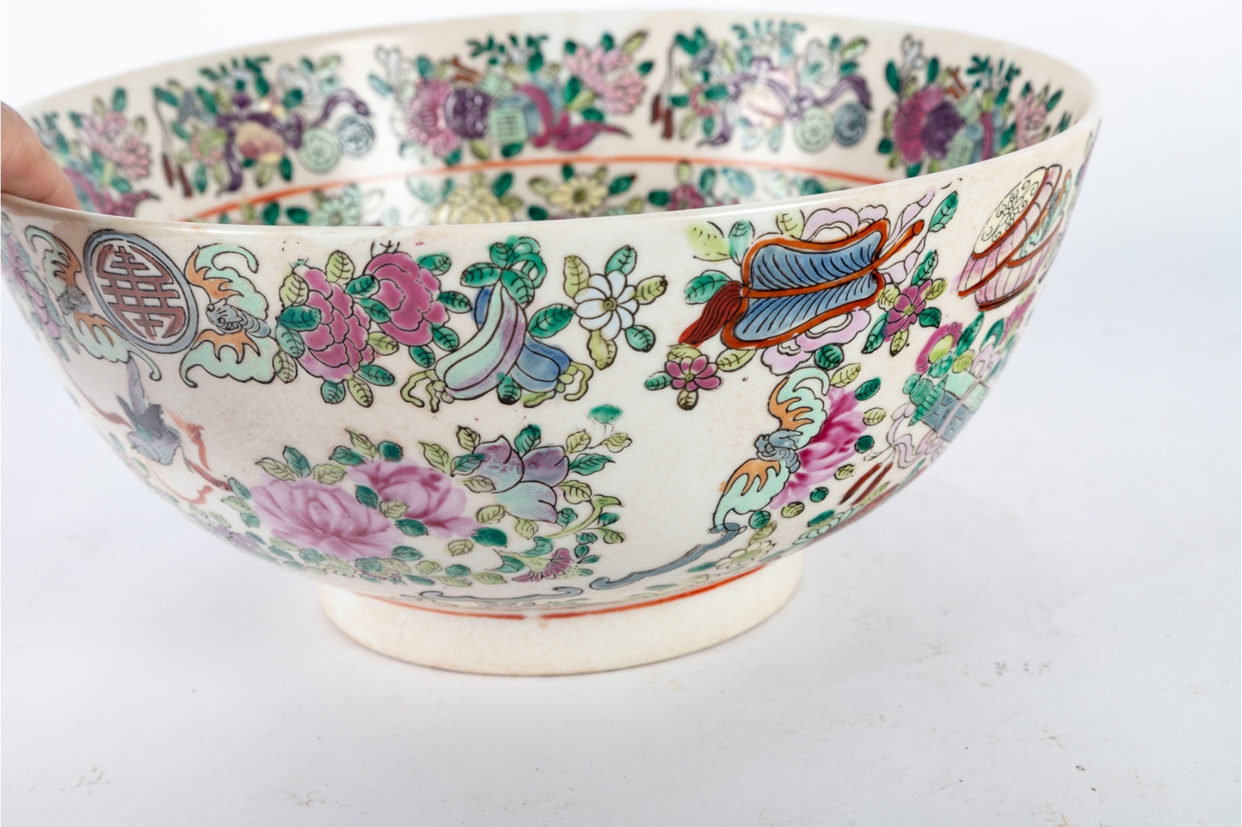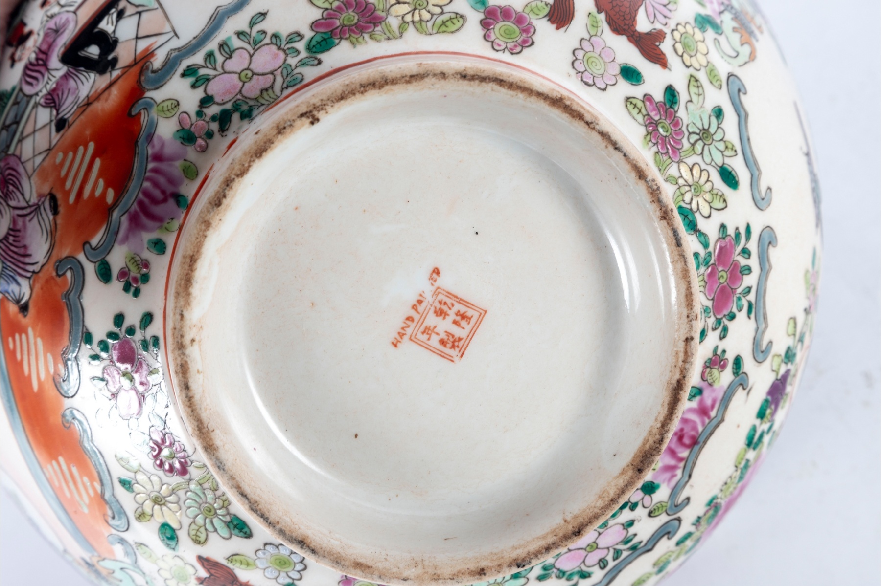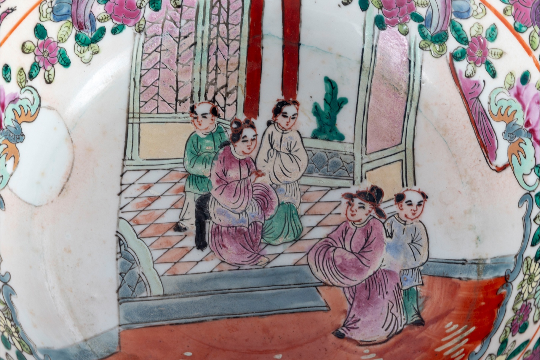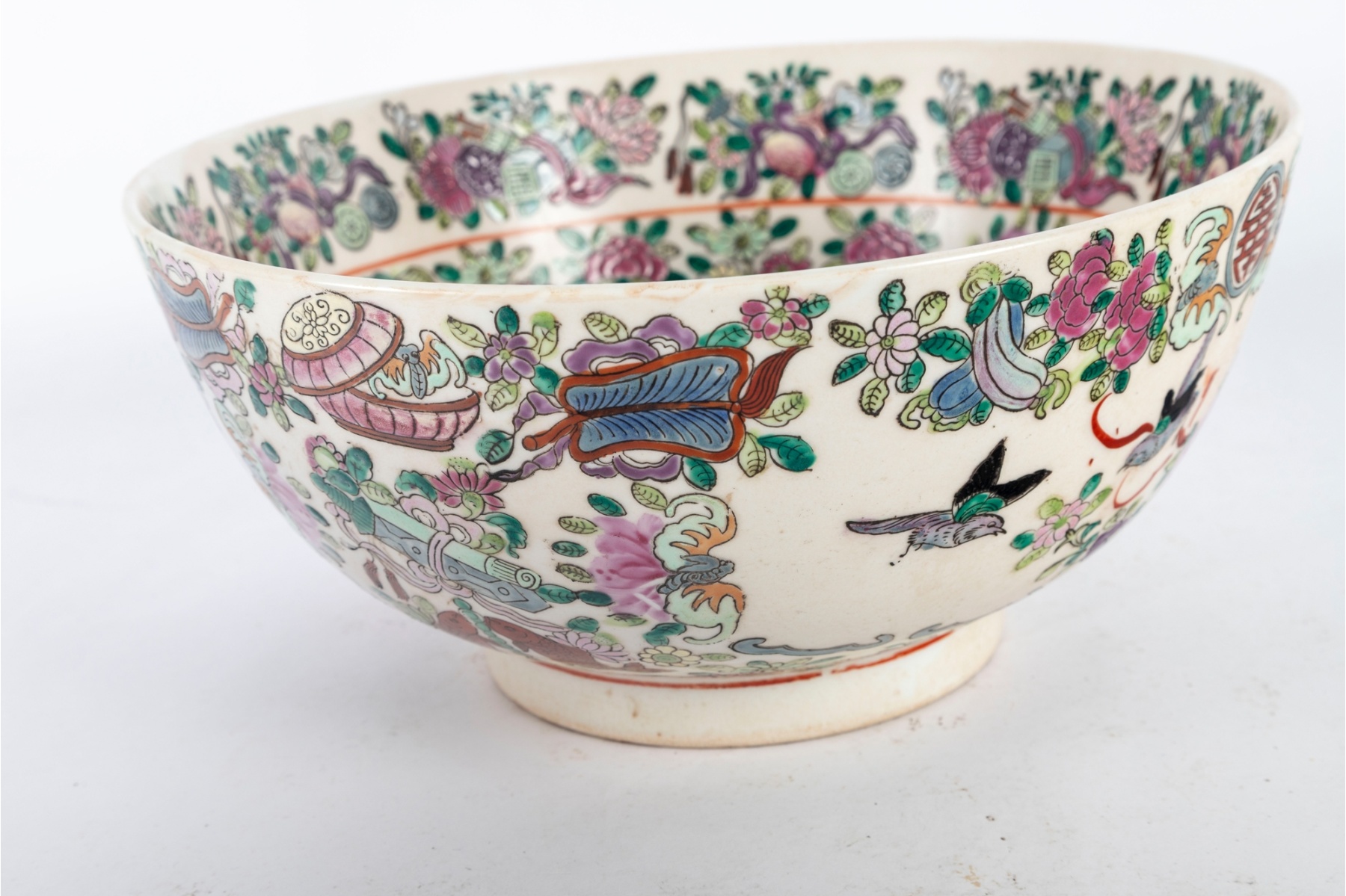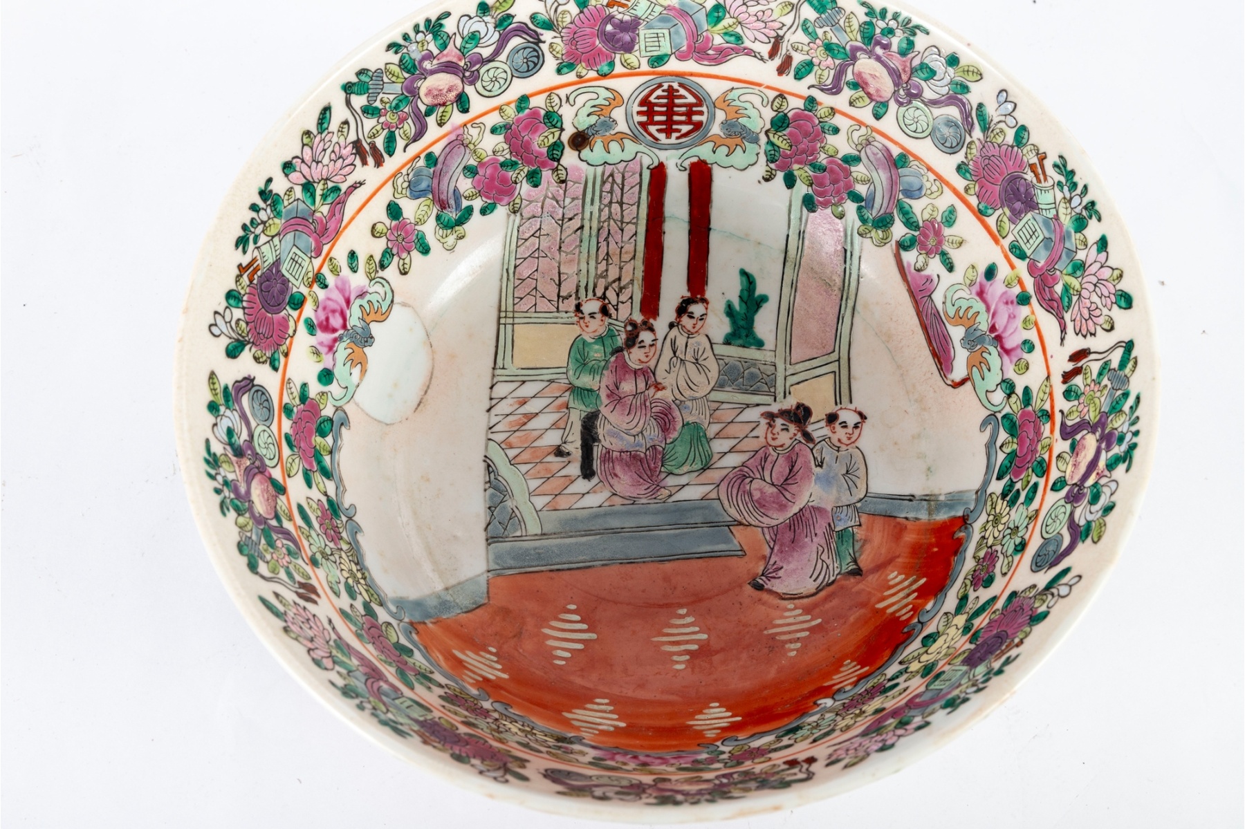 Chinese porcelain bowl featuring finely hand-painted vibrant famille rose decoration with alternating panels depicting courtyard scenes of figures and children, surrounded by lush floral and foliate motifs with auspicious symbols and birds in flight. The interior mirrors the exterior decoration with a central figural scene enclosed by a floral and scrollwork border. Marked underfoot.