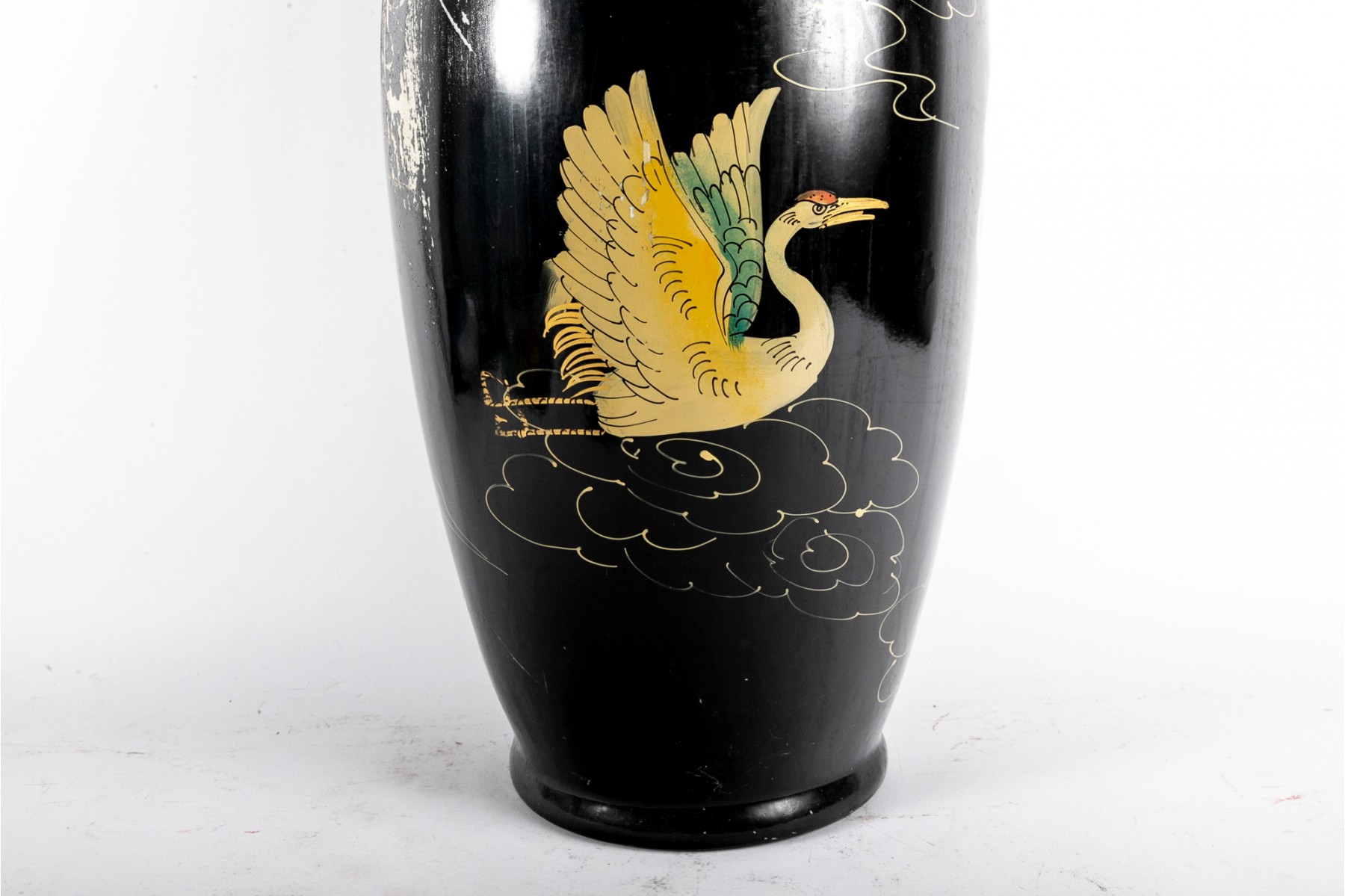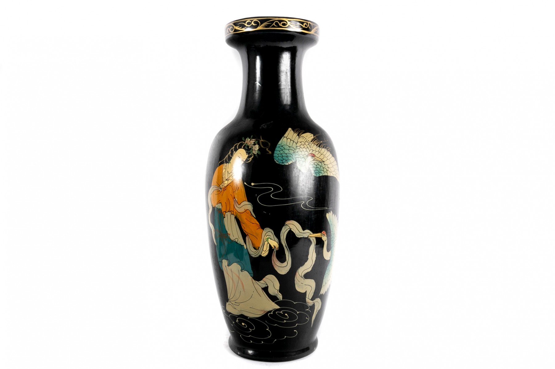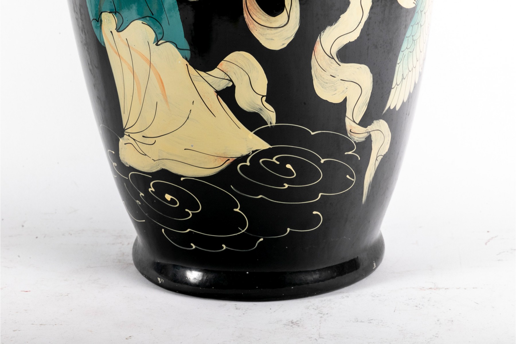 A tall ceramic famille noire vase displaying a hand-painted figure of a woman in orange and blue atop swirling clouds with blue and cream birds.