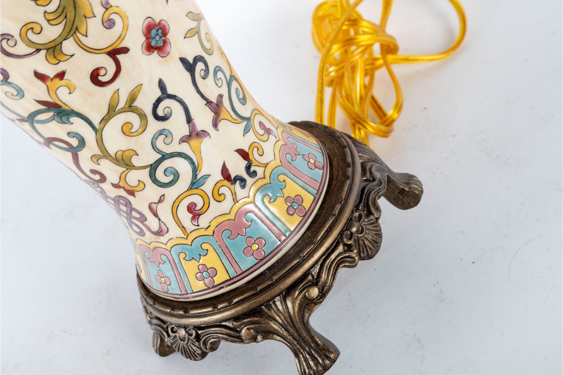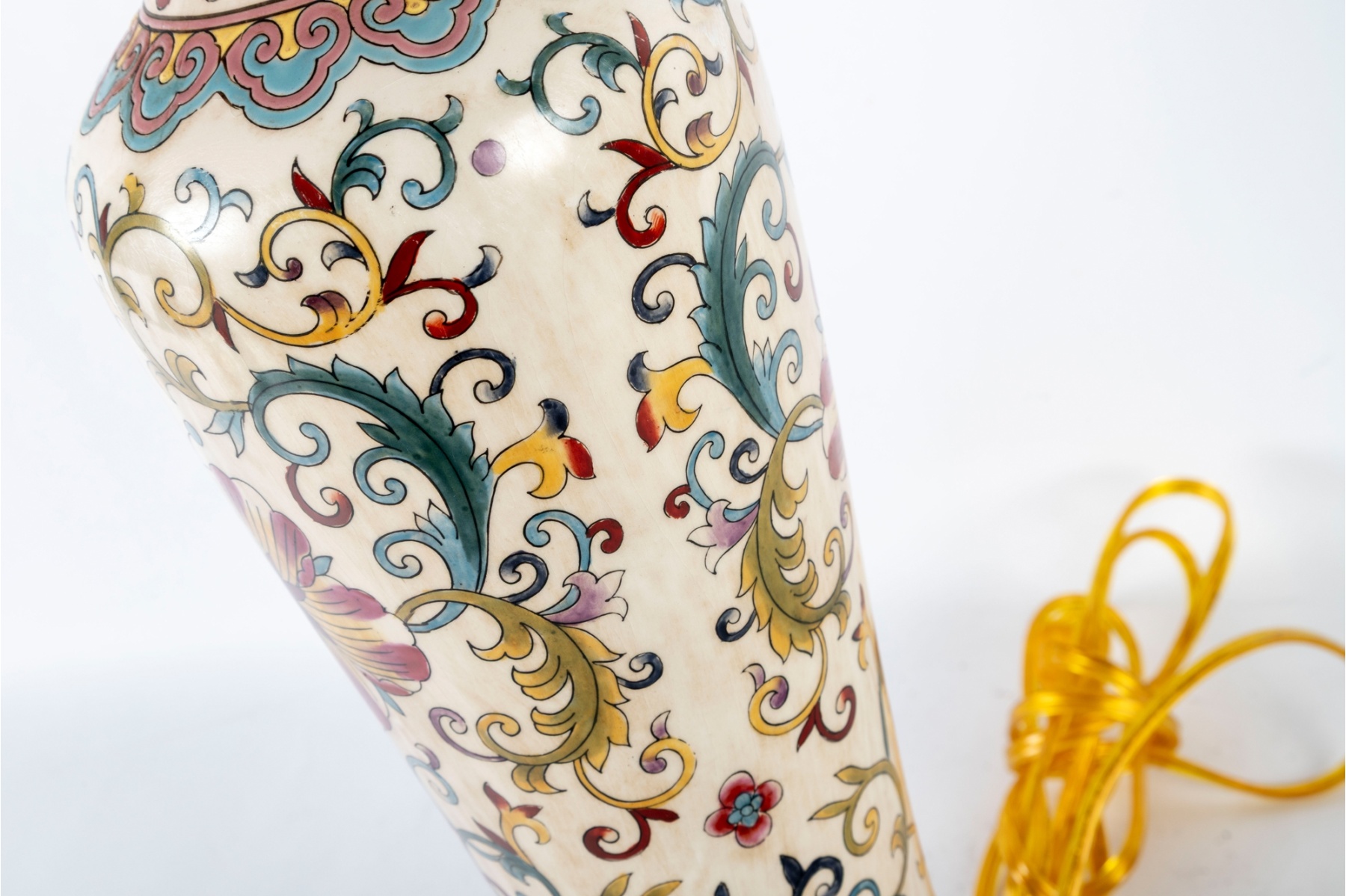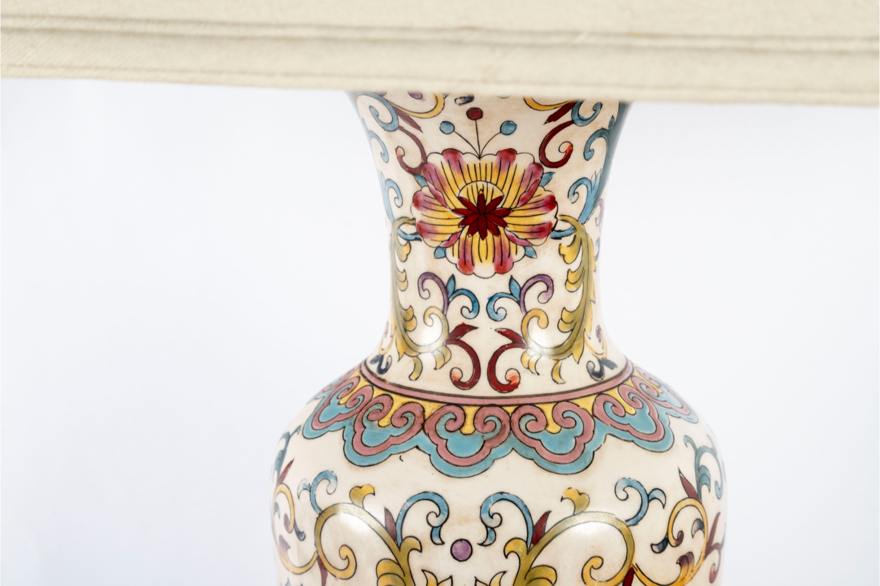 Elegant hand-painted porcelain table lamp featuring a tall baluster form adorned with scrolling acanthus motifs and stylized blossoms in shades of red, yellow, teal, and mauve against a cream crackle-glazed background. The intricate floral pattern flows gracefully around the body, framed with a decorative band of pastel enamel work near the base.