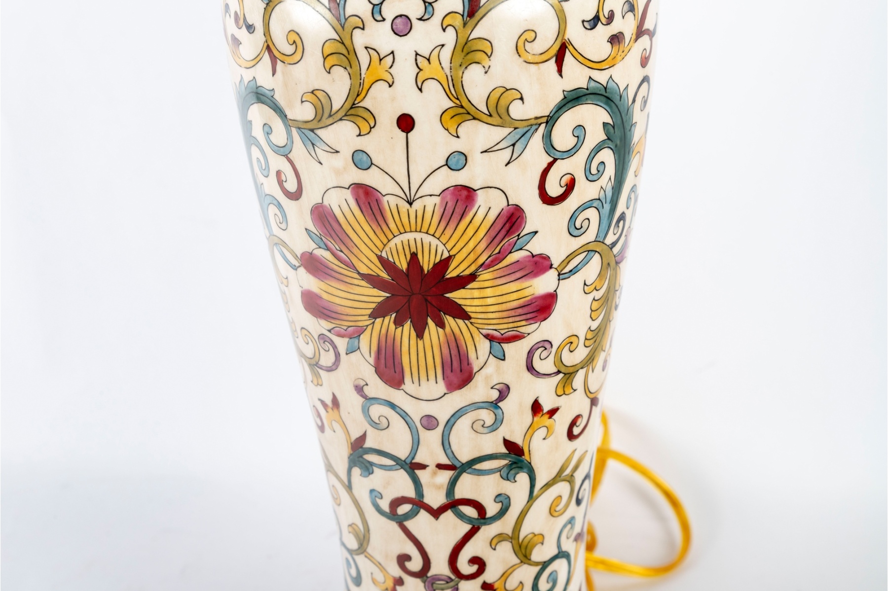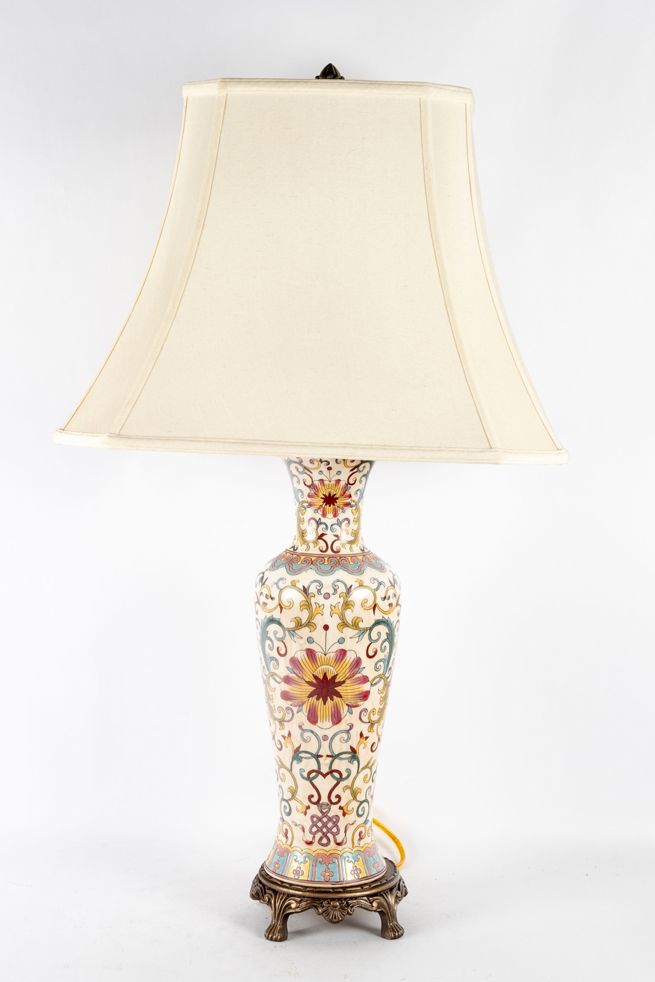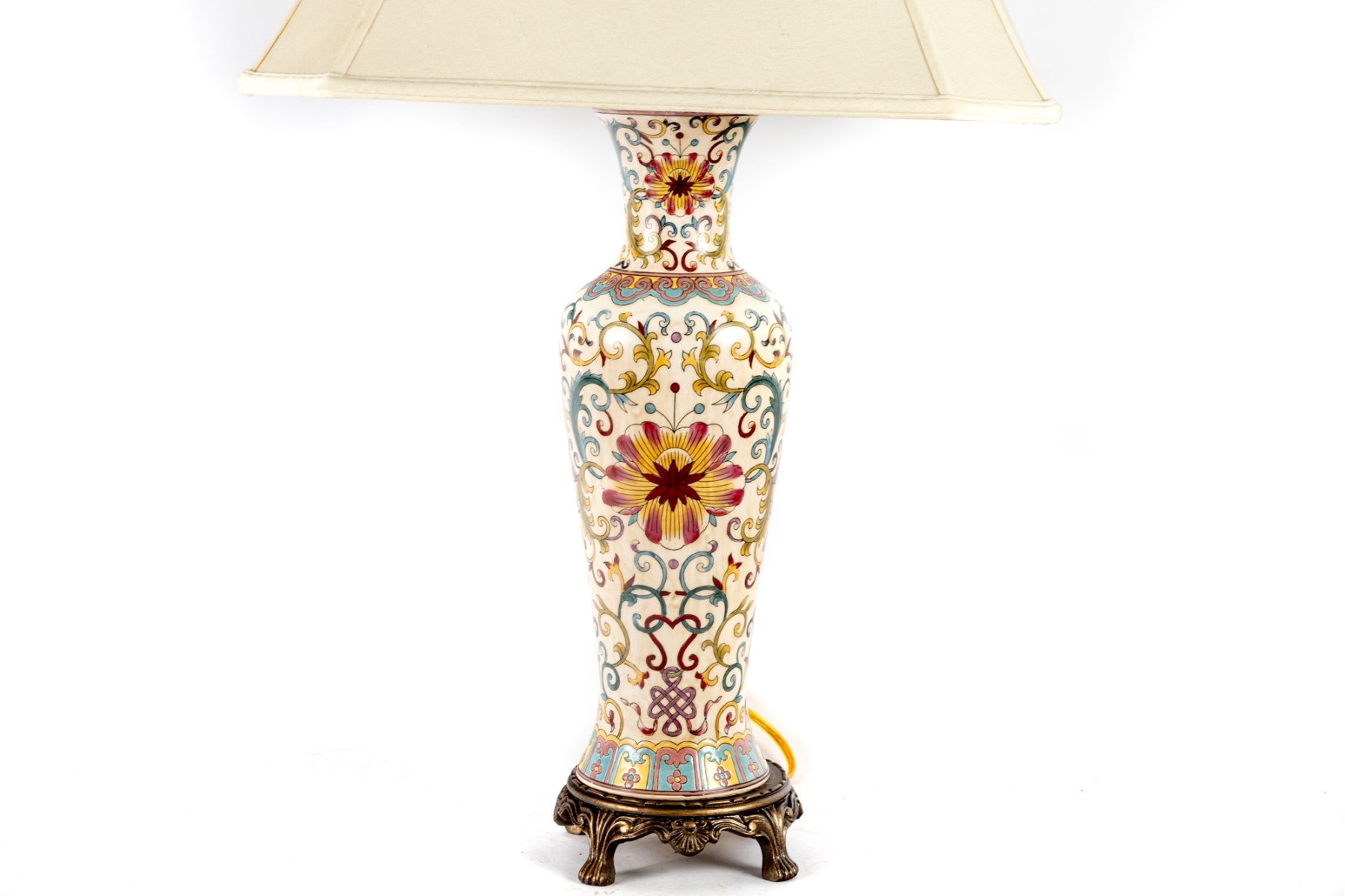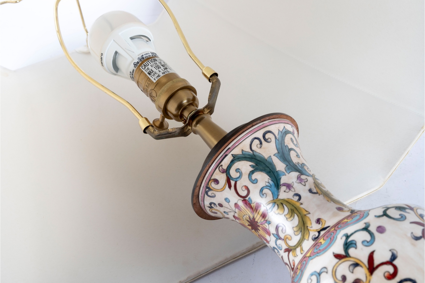 Elegant hand-painted porcelain table lamp featuring a tall baluster form adorned with scrolling acanthus motifs and stylized blossoms in shades of red, yellow, teal, and mauve against a cream crackle-glazed background. The intricate floral pattern flows gracefully around the body, framed with a decorative band of pastel enamel work near the base.